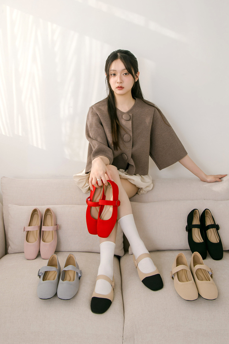 零著感方頭小花釦柔織軟墊平底瑪莉珍鞋