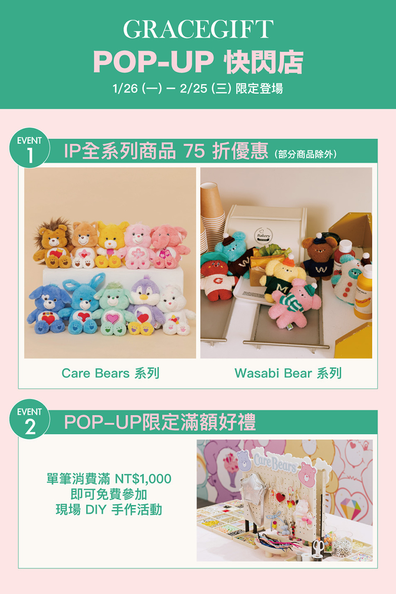 Grace Gift 雙 IP 夢幻聯動降臨林口!Care Bears、Wasabi Bear 陪你過年!