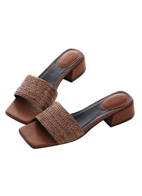 編織一字寬帶中跟拖鞋 咖