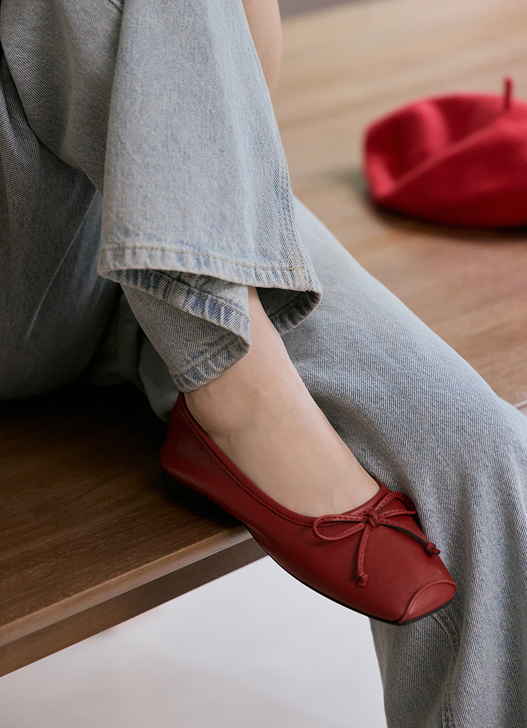 小女孩方頭蝴蝶結平底娃娃鞋 深紅