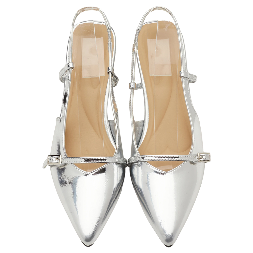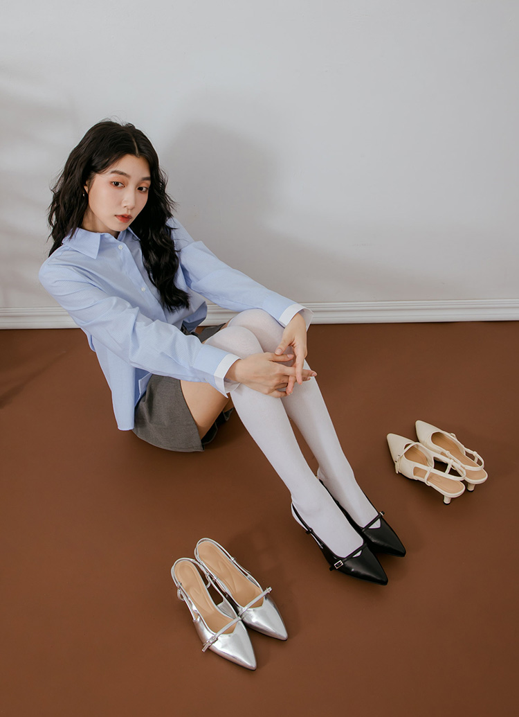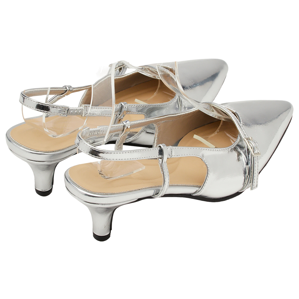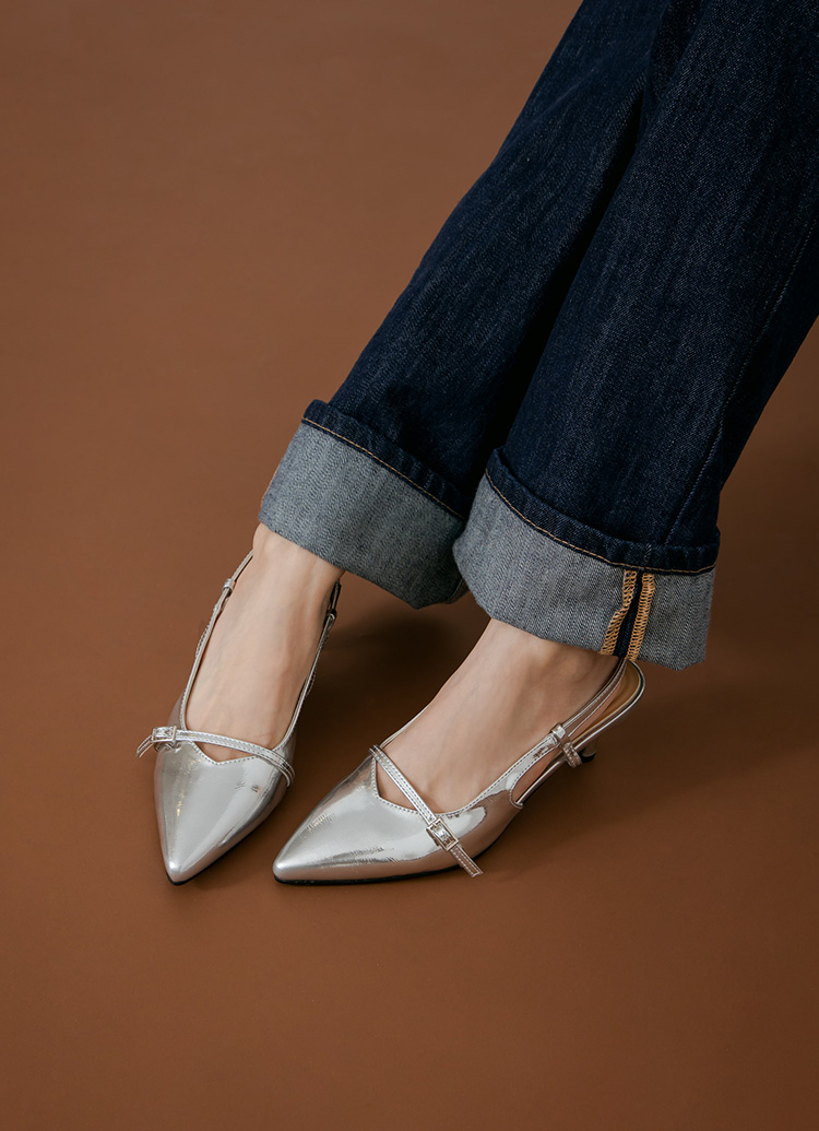 時髦尖頭皮革繫帶後空細跟鞋 銀