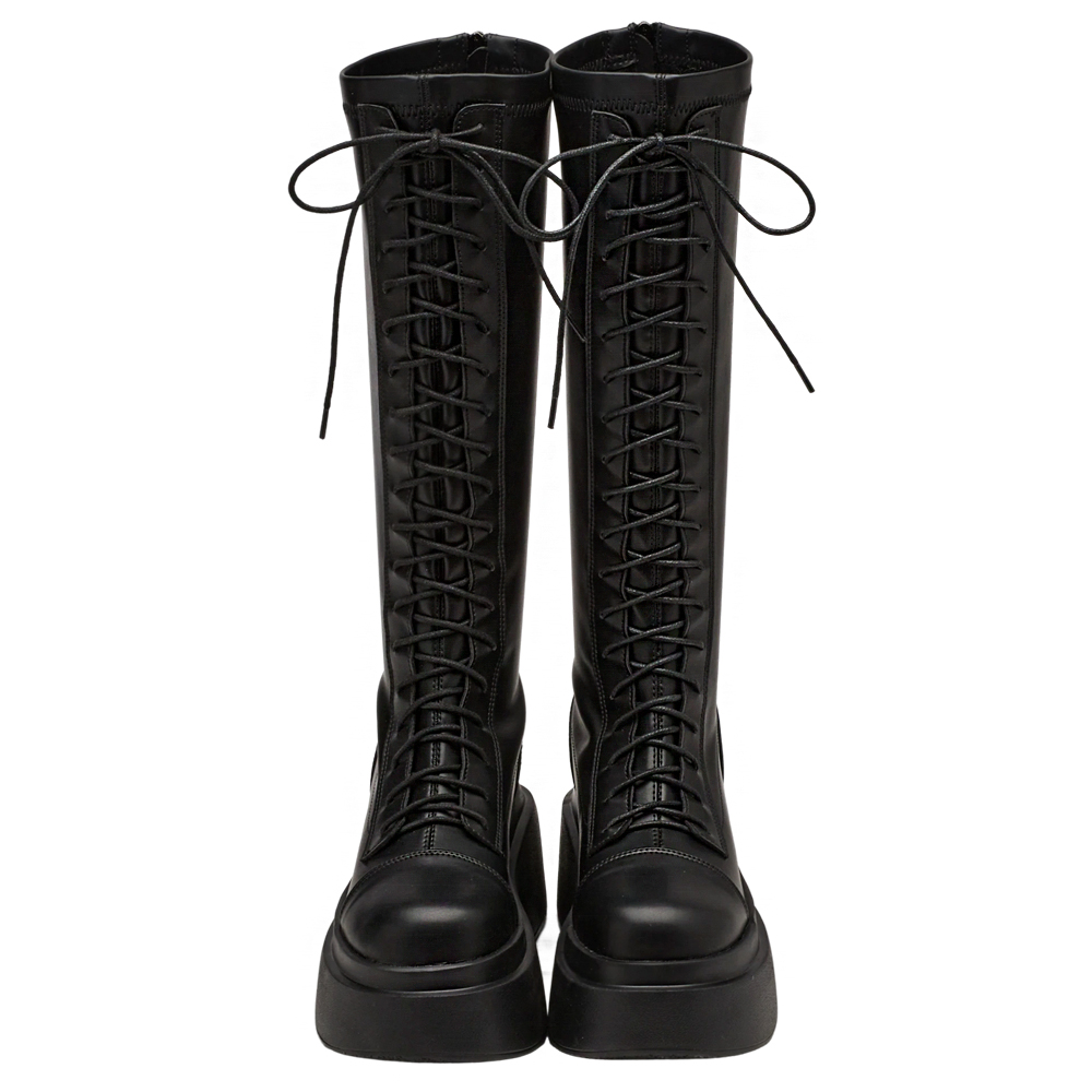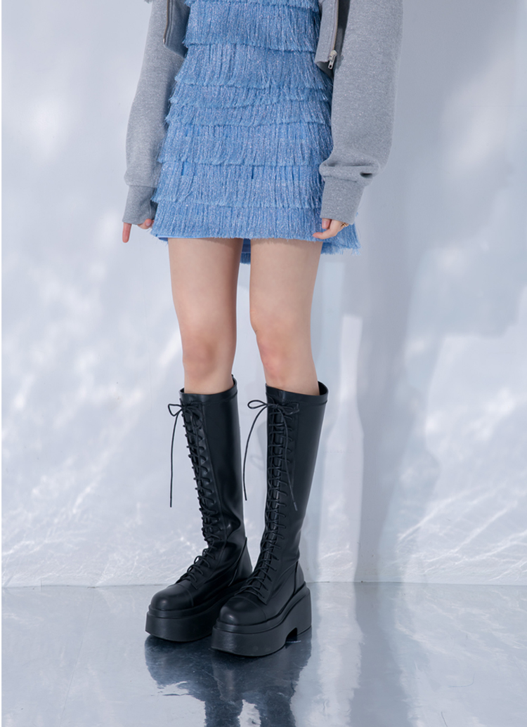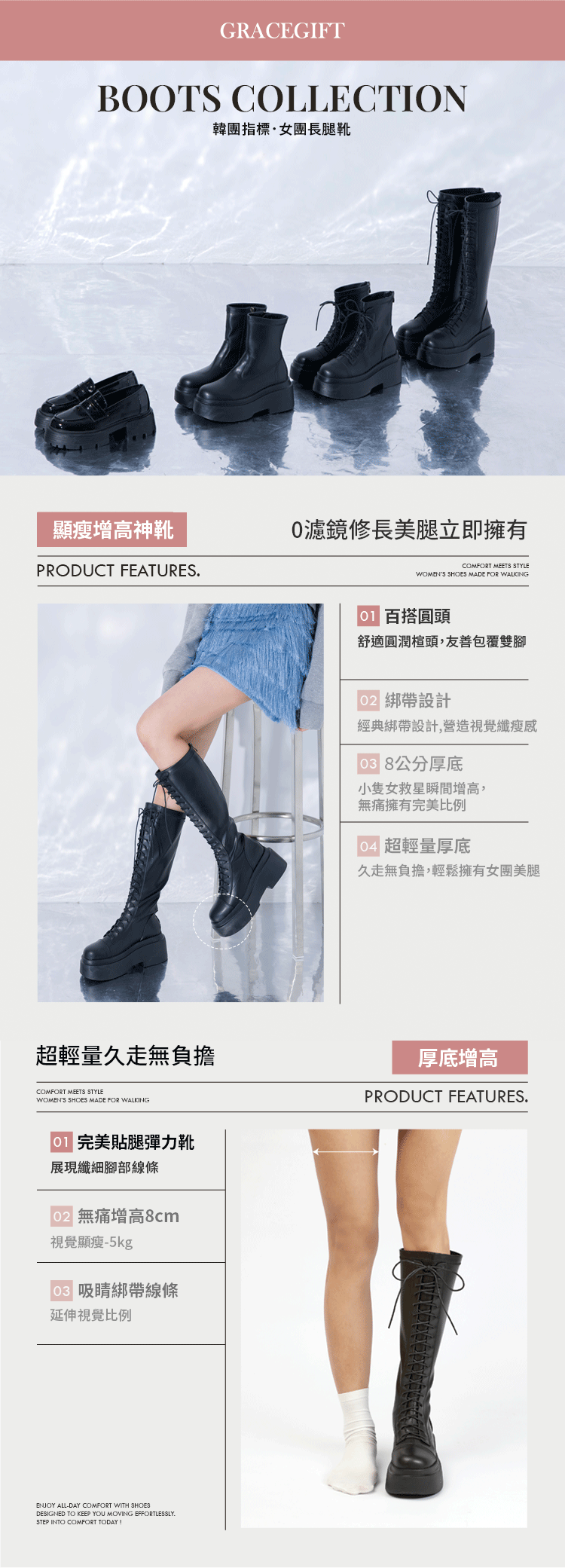 韓團指標輕量加厚鬆糕底綁帶長靴 黑