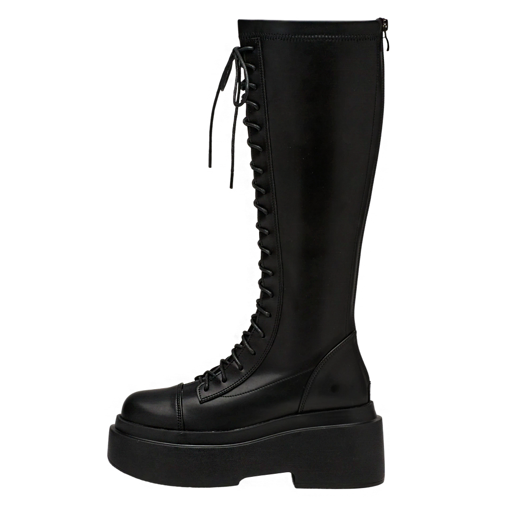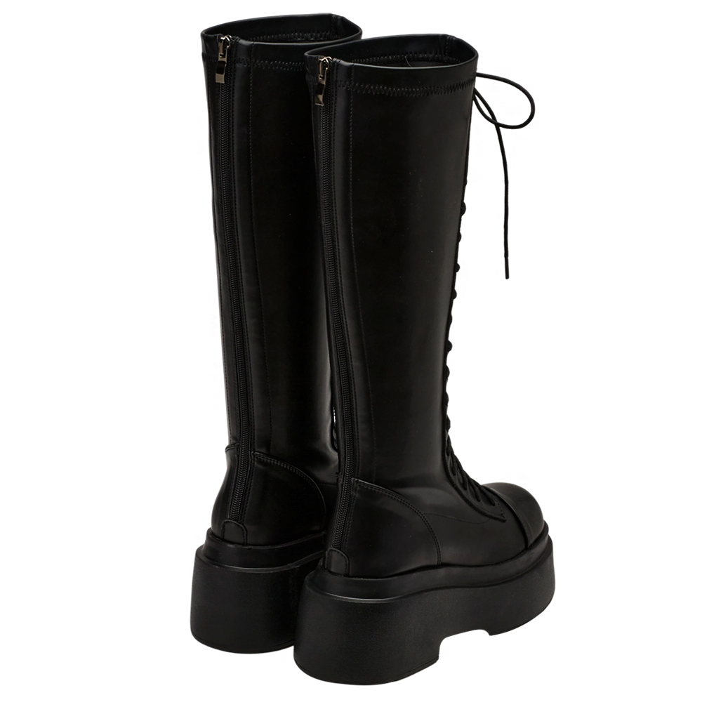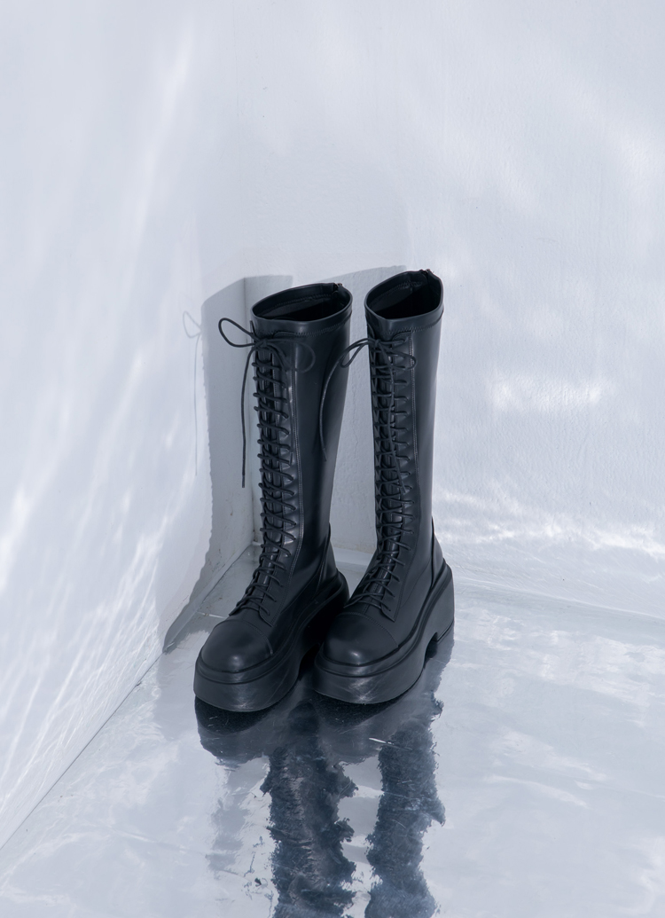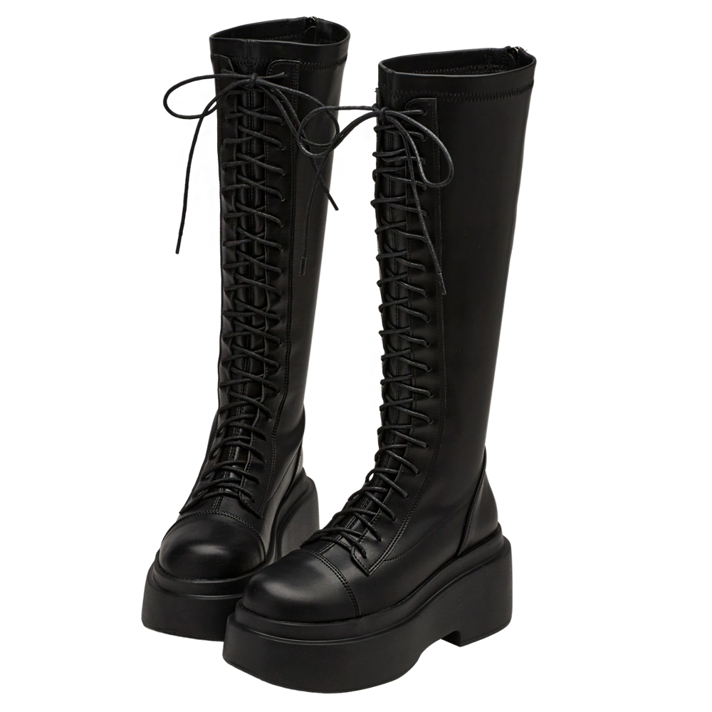 韓團指標輕量加厚鬆糕底綁帶長靴 黑
