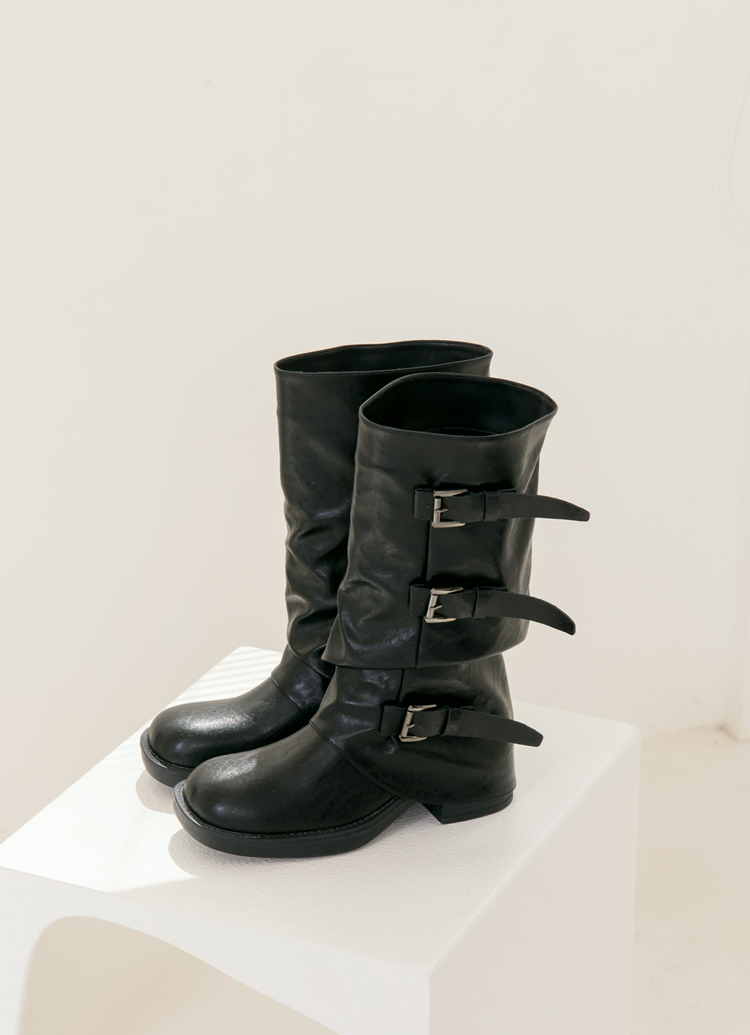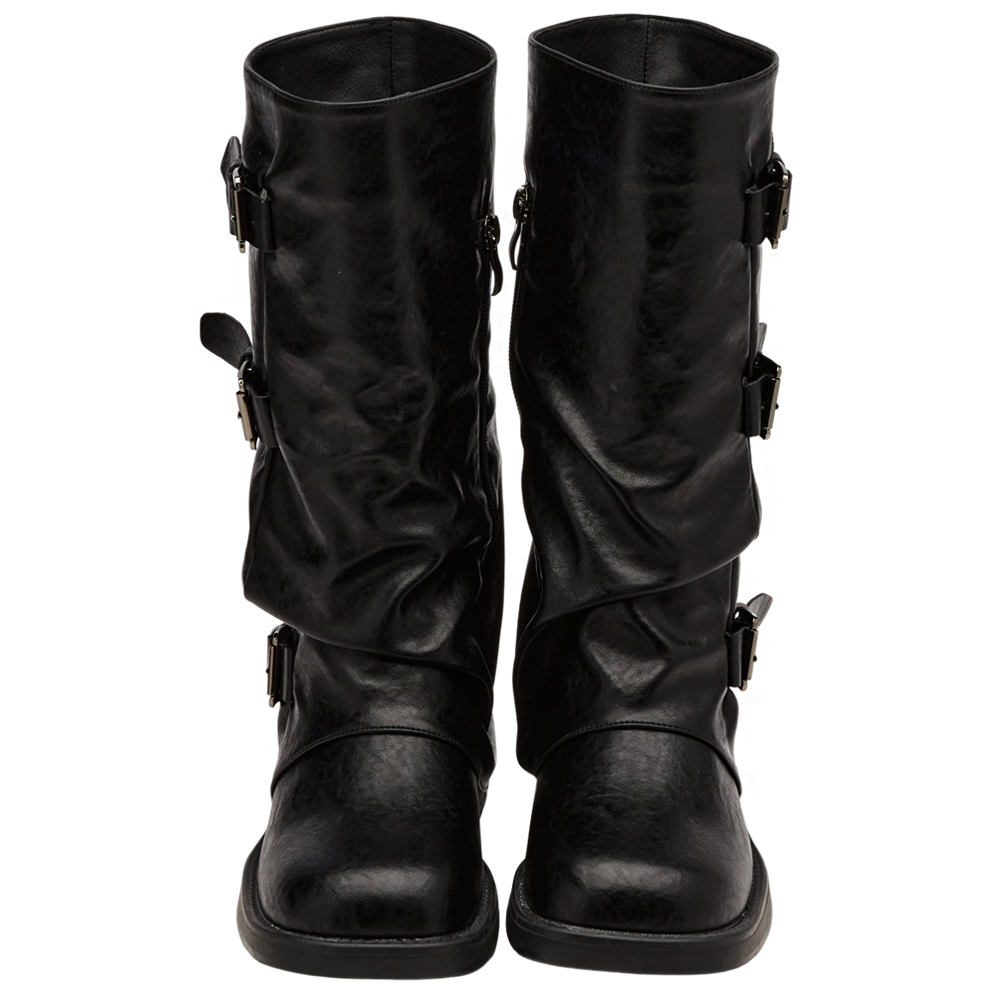 慵懶率性皮帶扣皺褶厚底海盜靴 黑