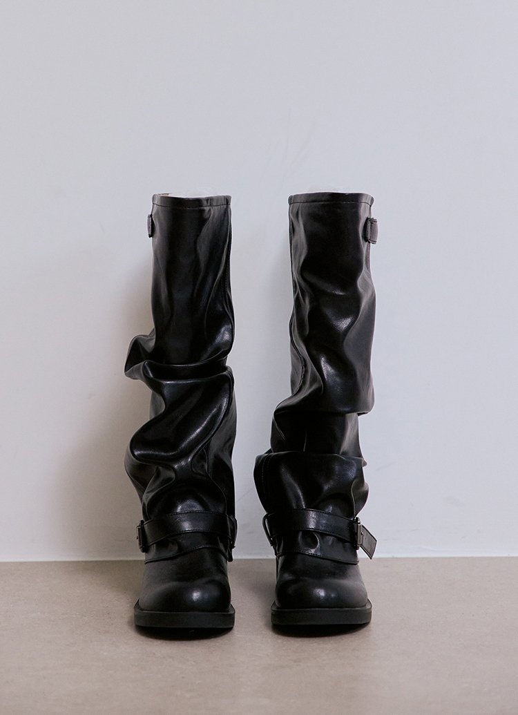 時髦修飾皮帶扣皺褶褲管長靴 黑