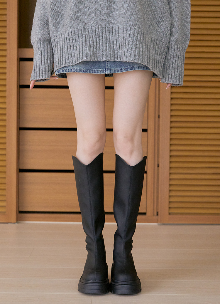 氣場長腿V口內增高輕量鋸齒厚底長靴 黑
