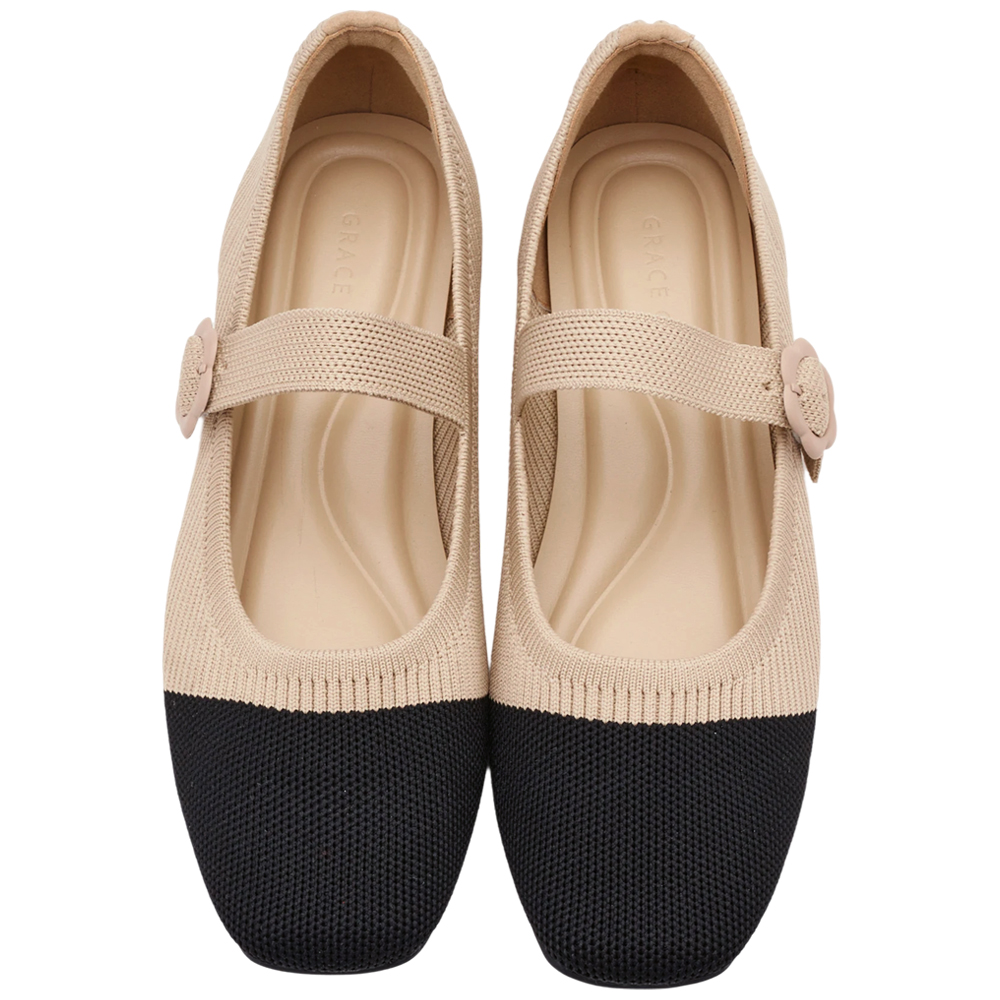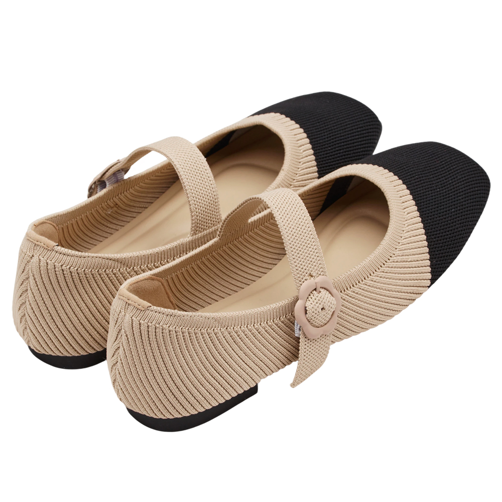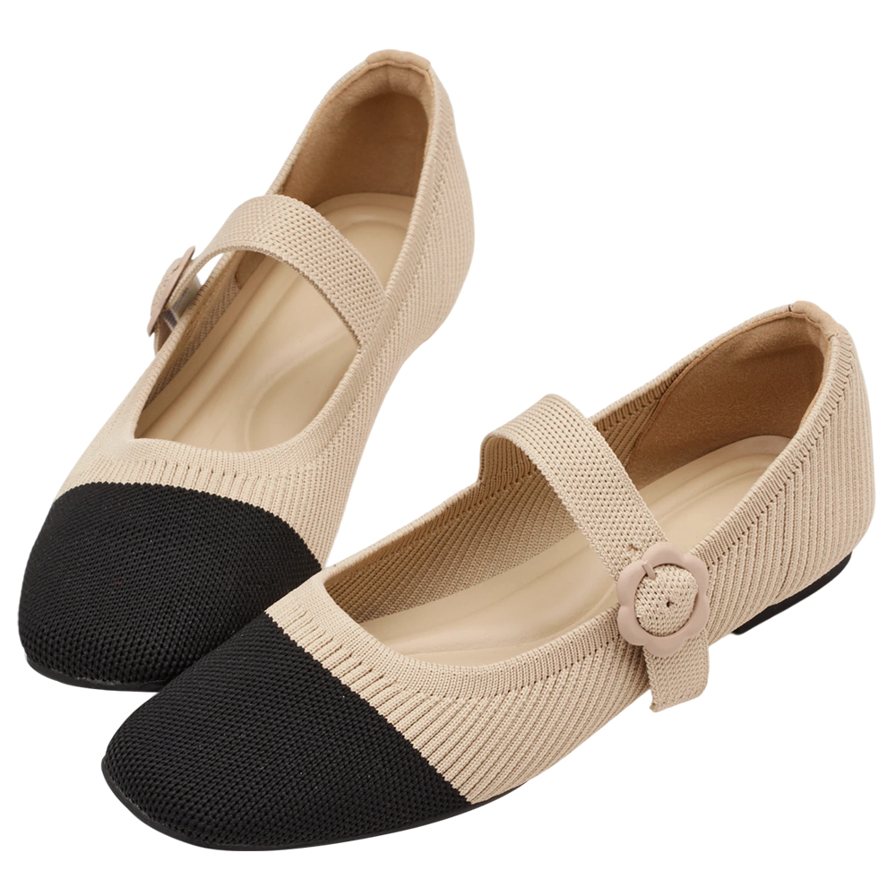 零著感方頭小花釦柔織軟墊平底瑪莉珍鞋 黑X杏