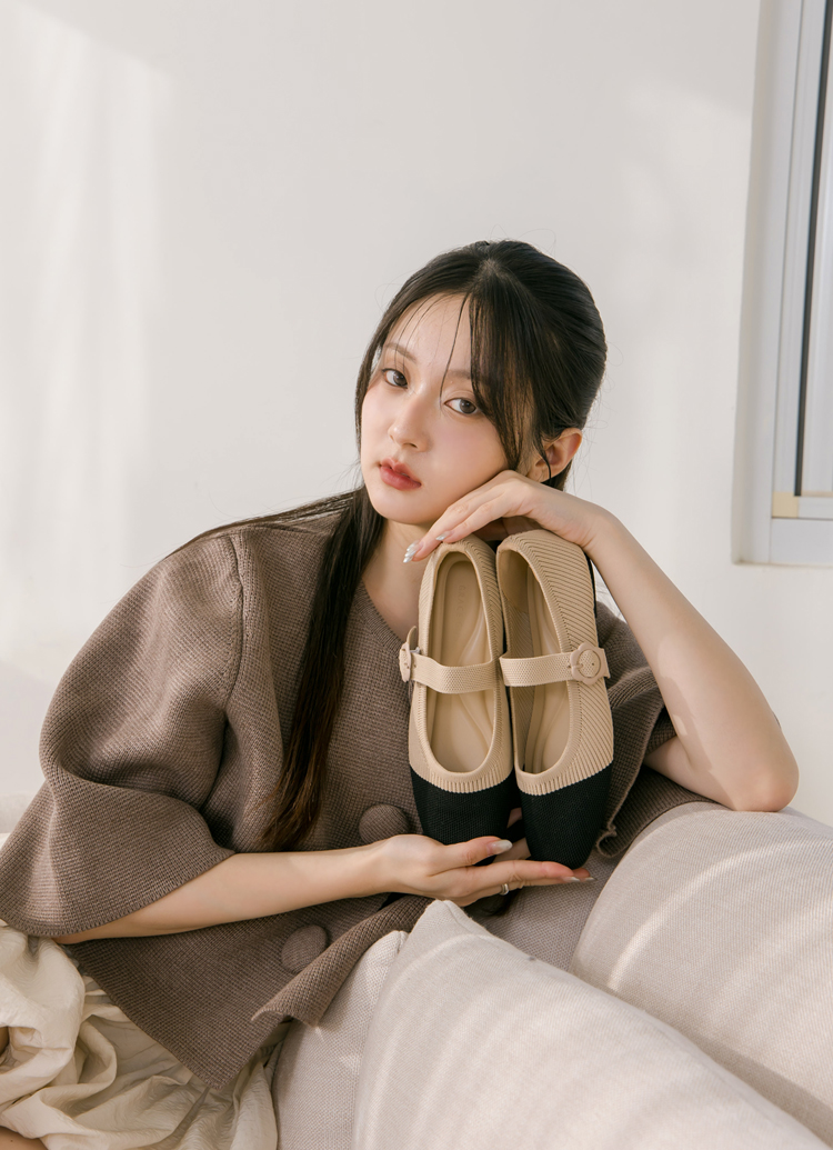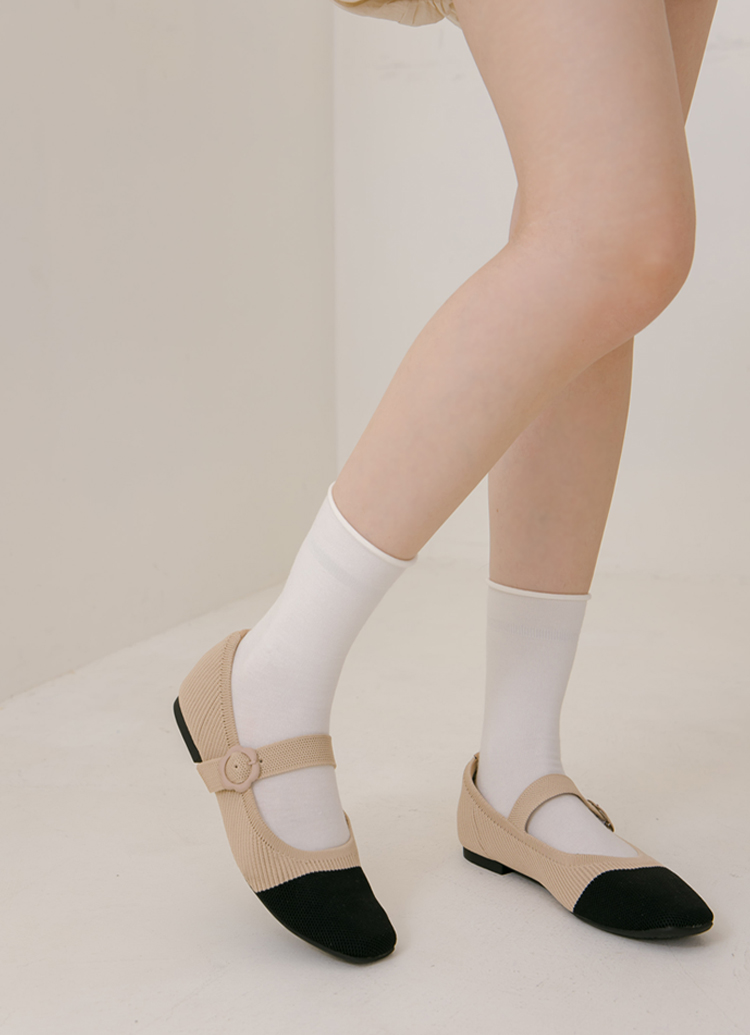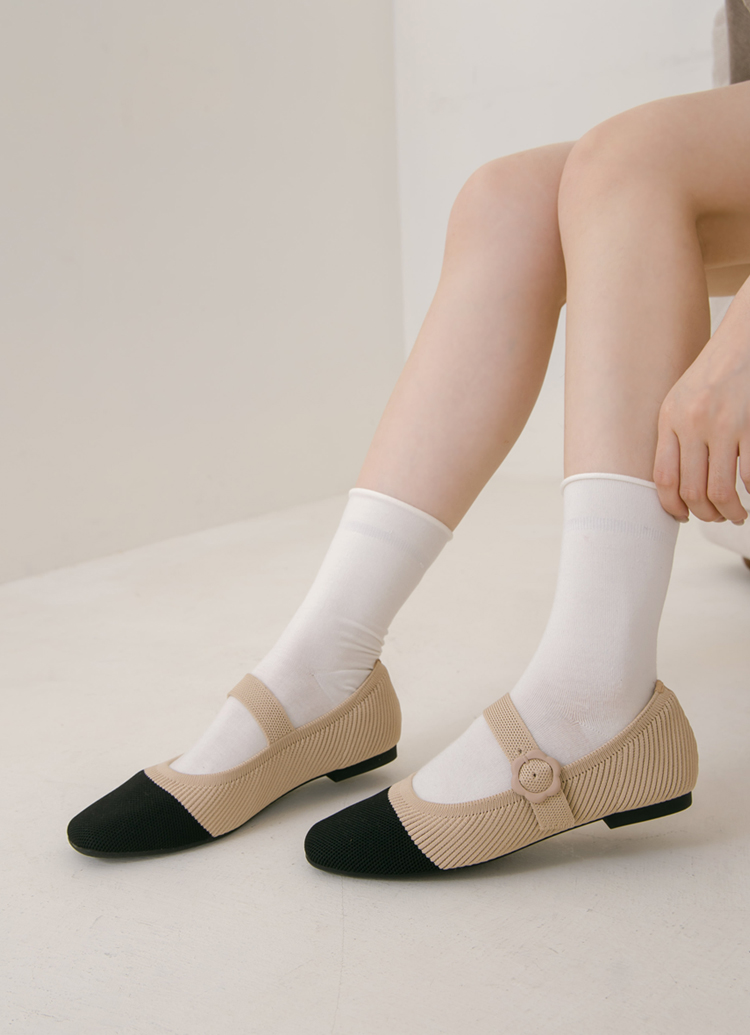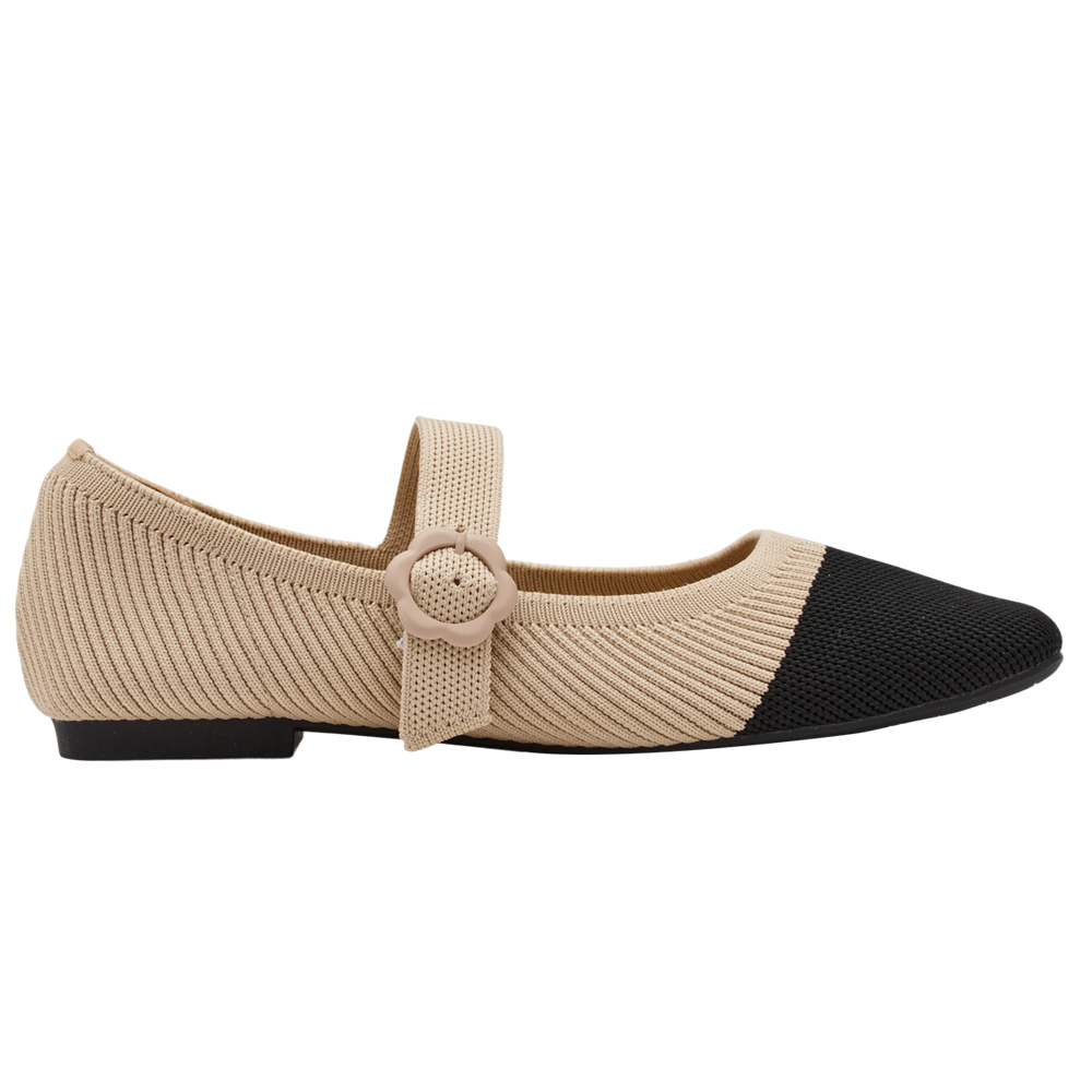零著感方頭小花釦柔織軟墊平底瑪莉珍鞋 黑X杏
