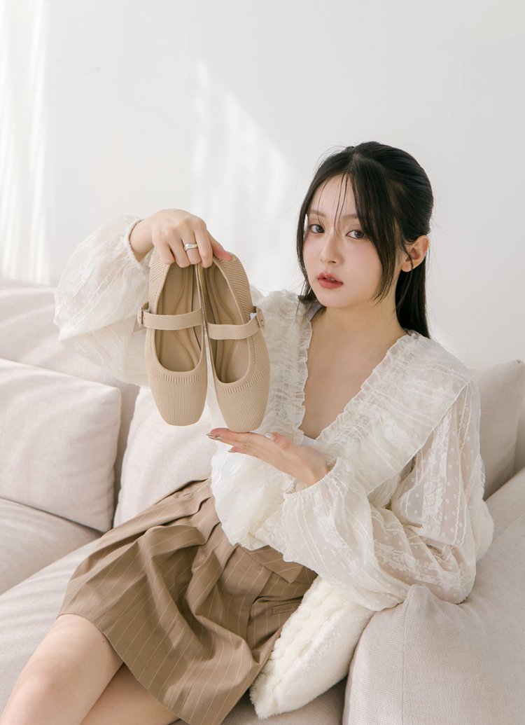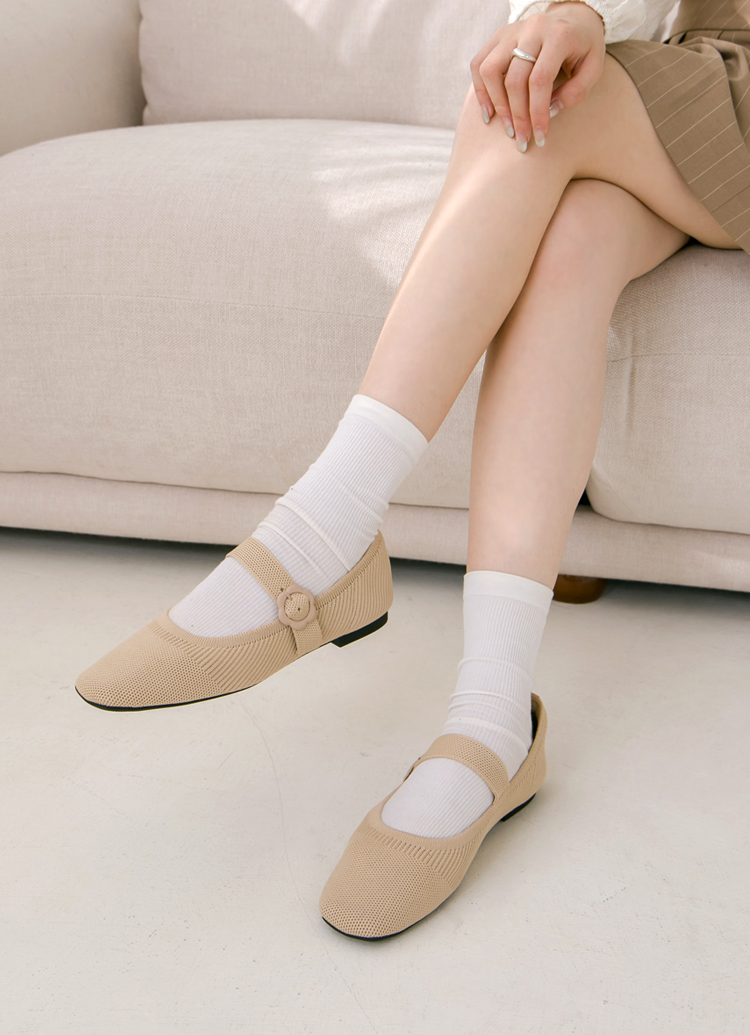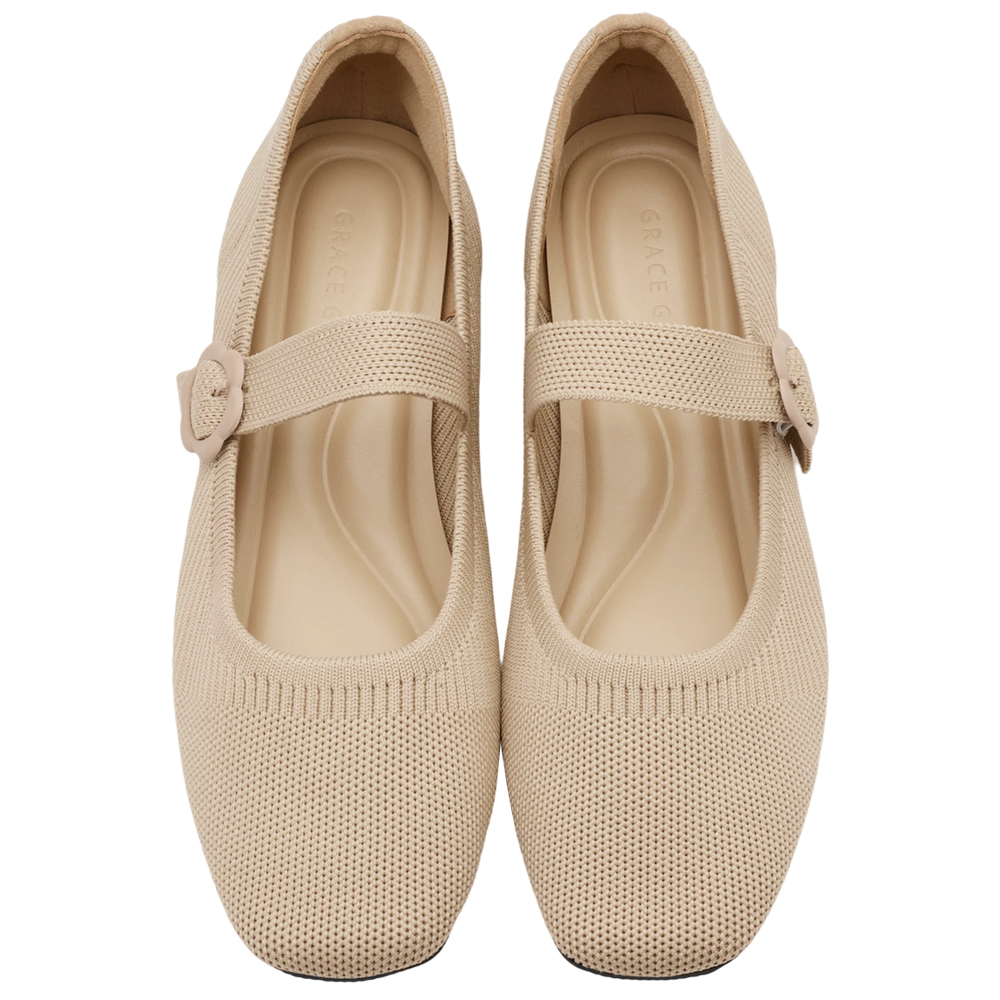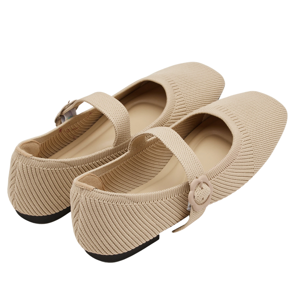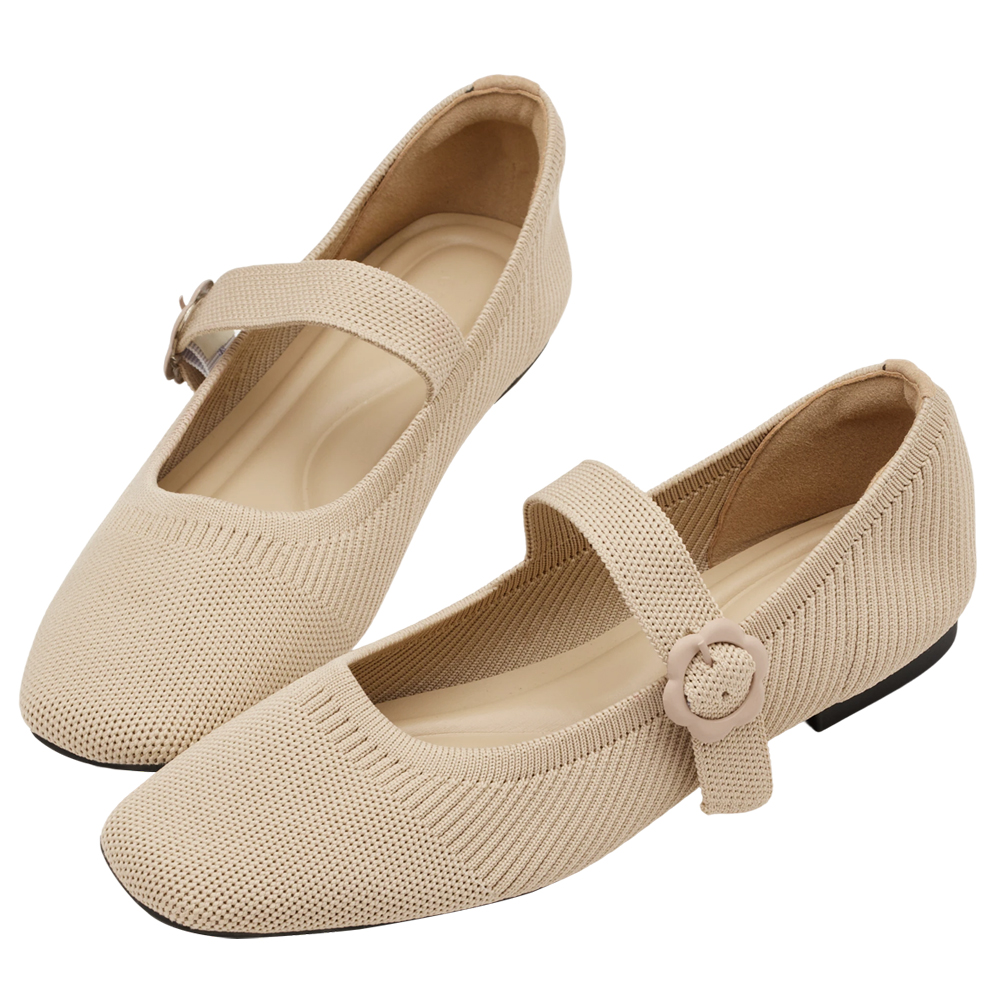 零著感方頭小花釦柔織軟墊平底瑪莉珍鞋 杏