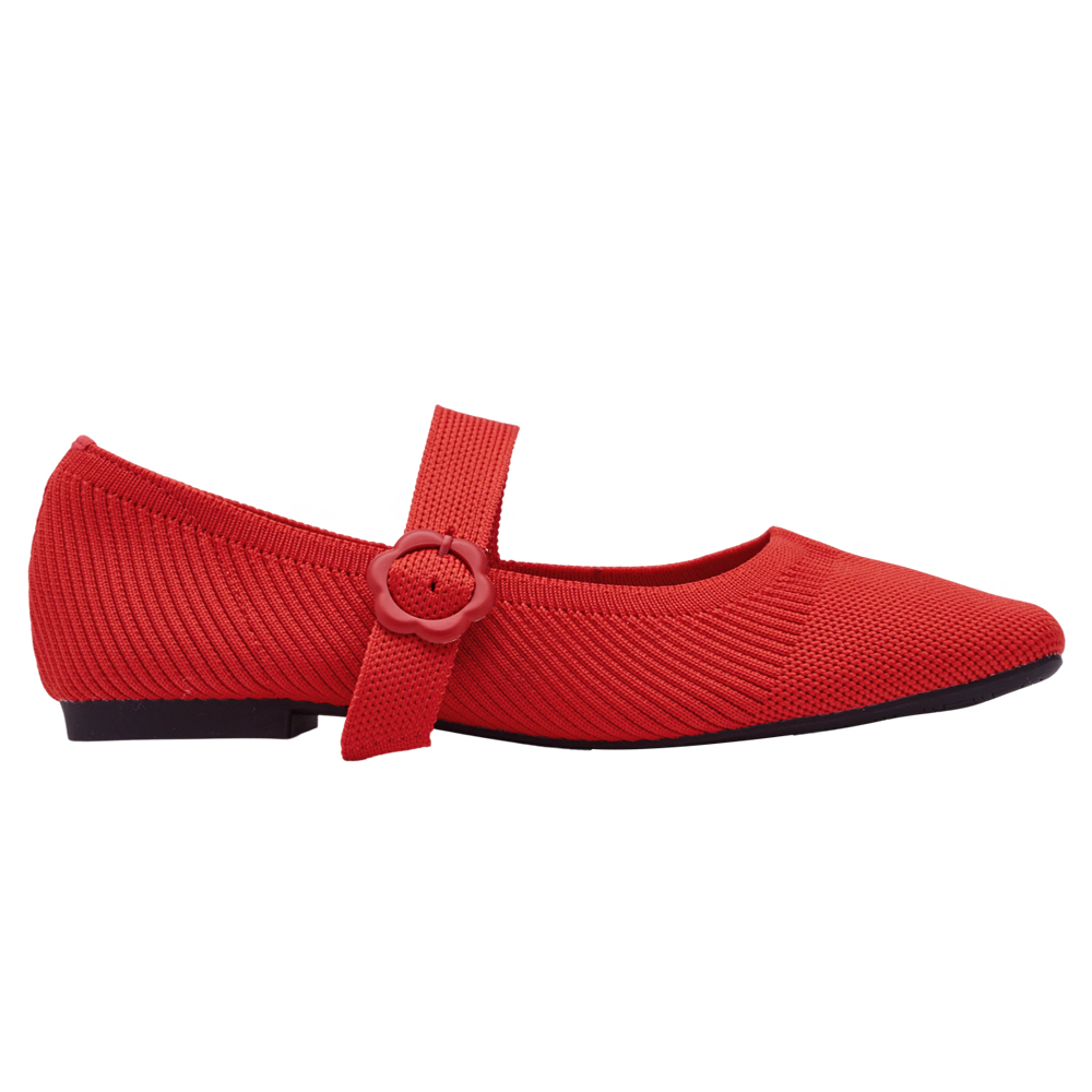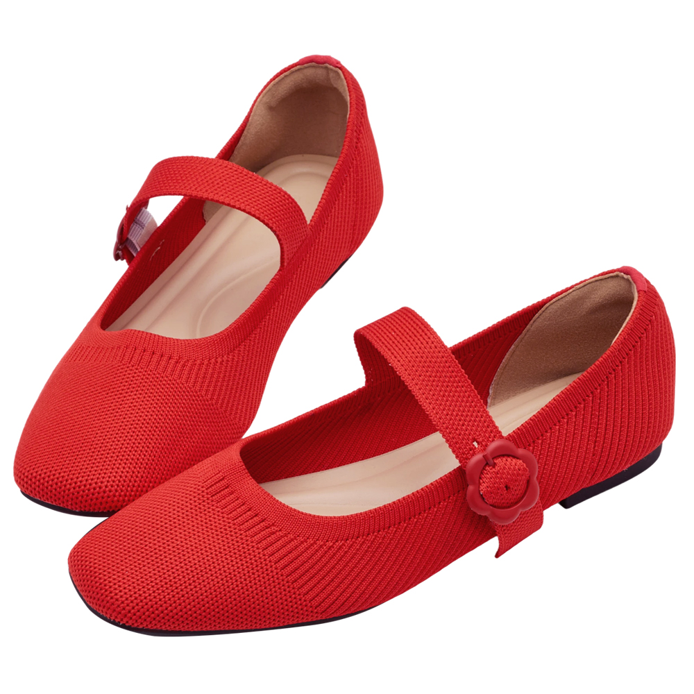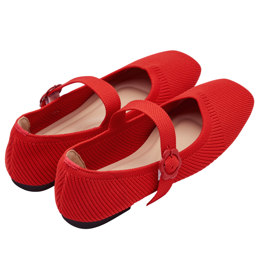 零著感方頭小花釦柔織軟墊平底瑪莉珍鞋 正紅