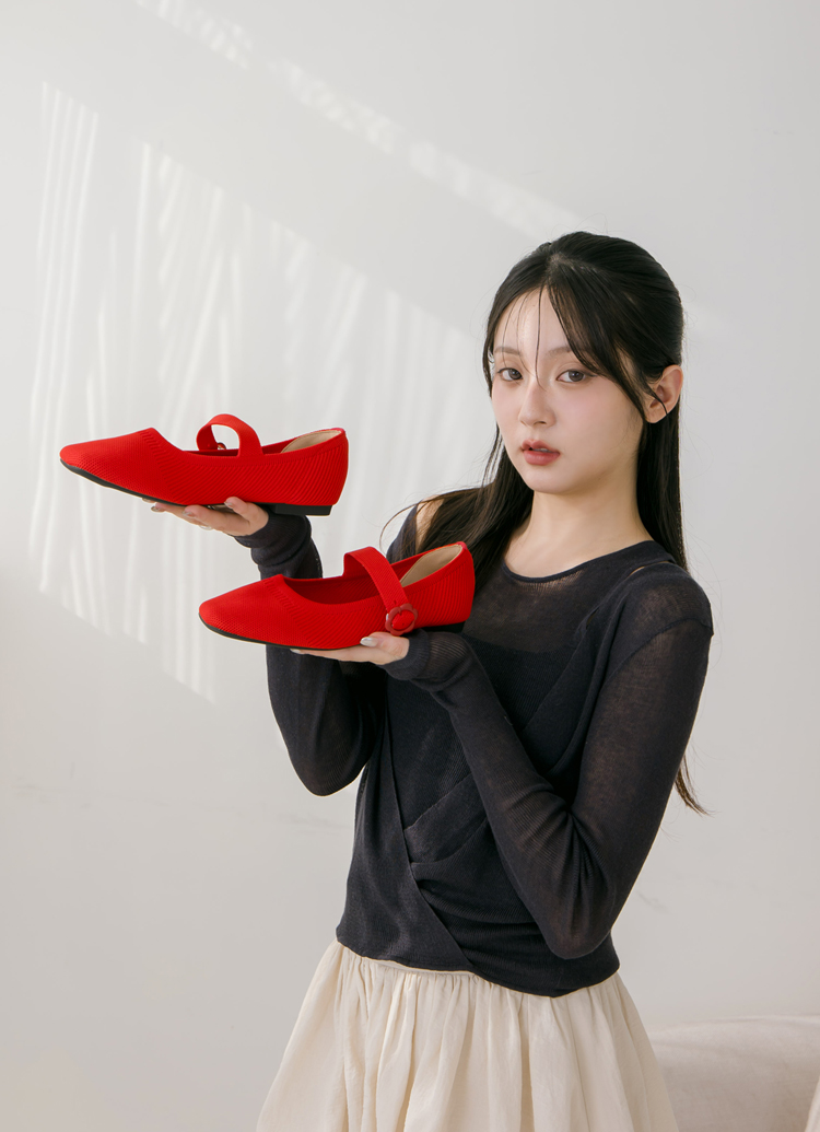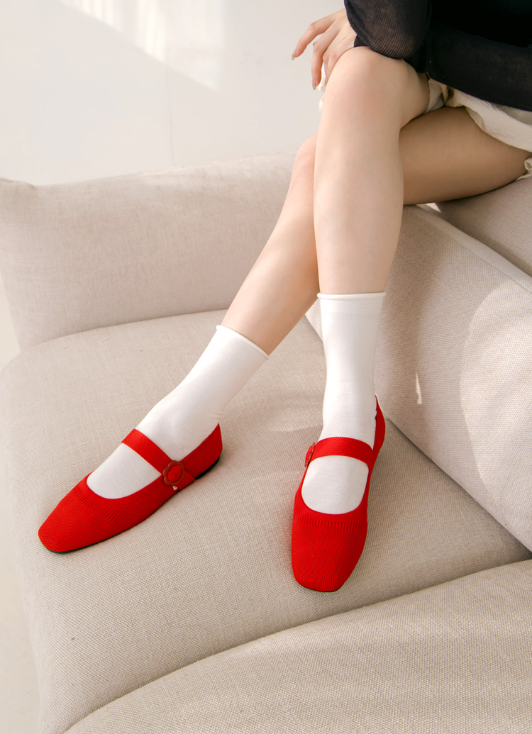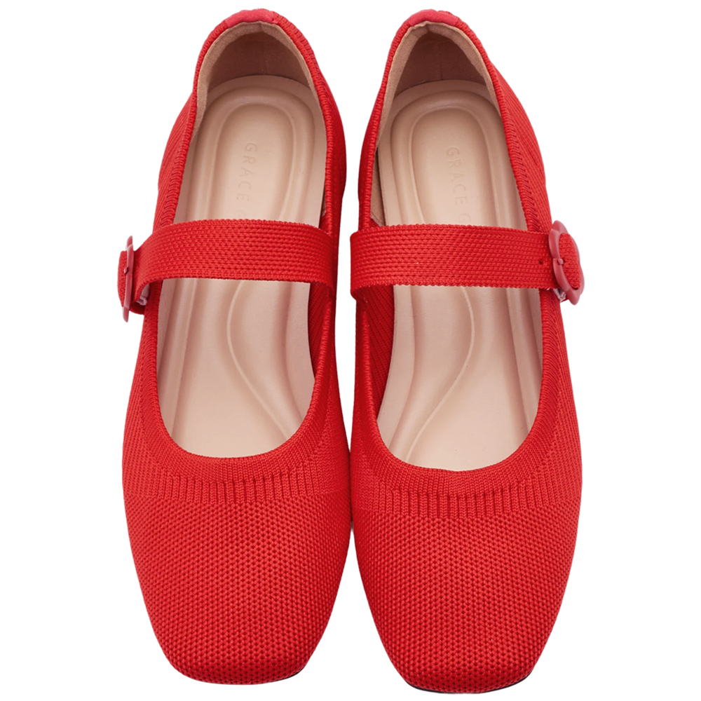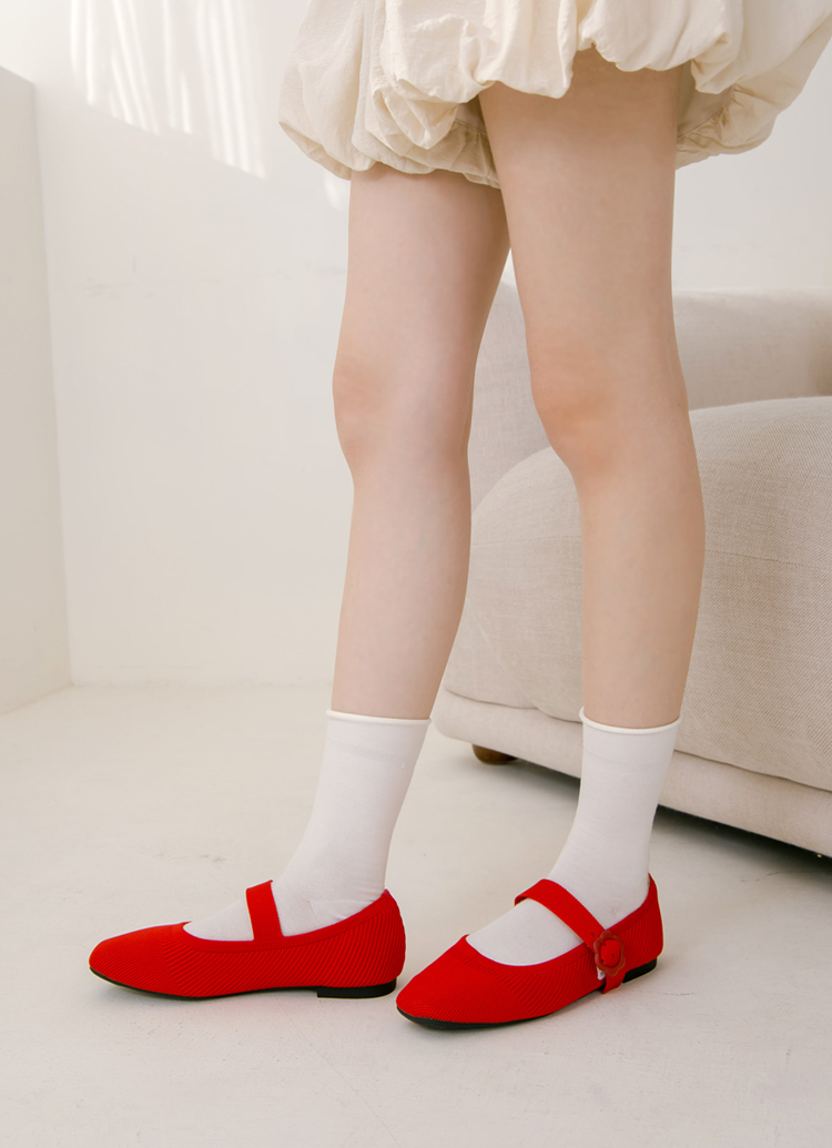 零著感方頭小花釦柔織軟墊平底瑪莉珍鞋 正紅