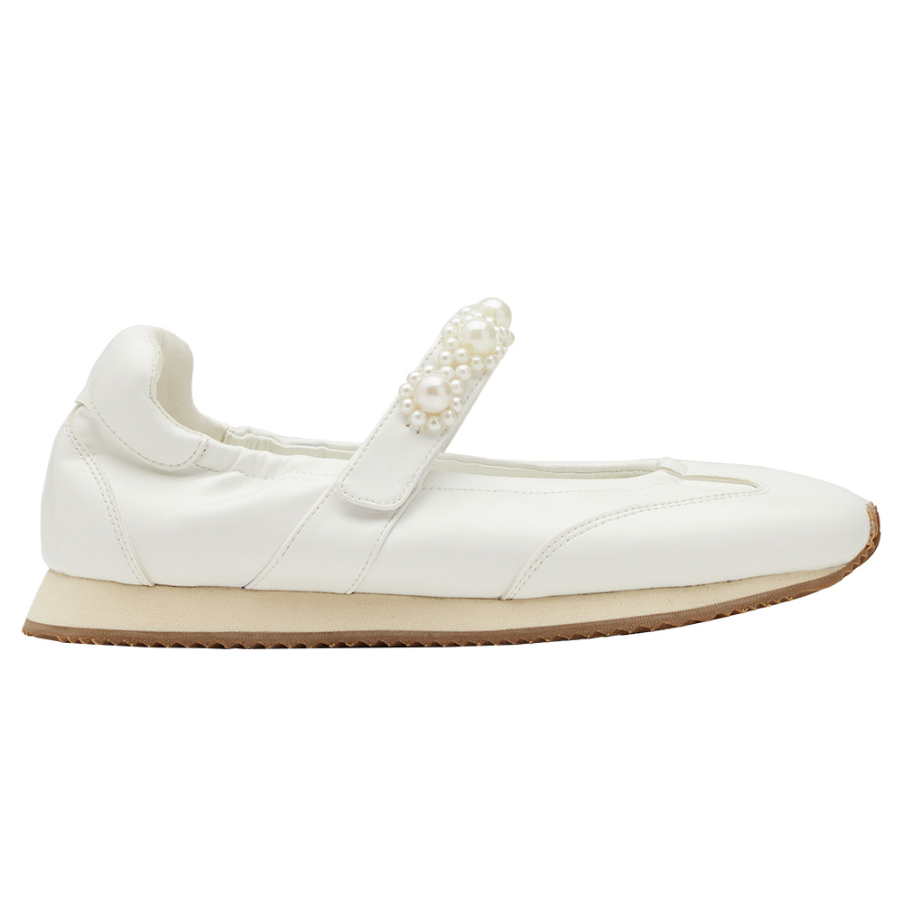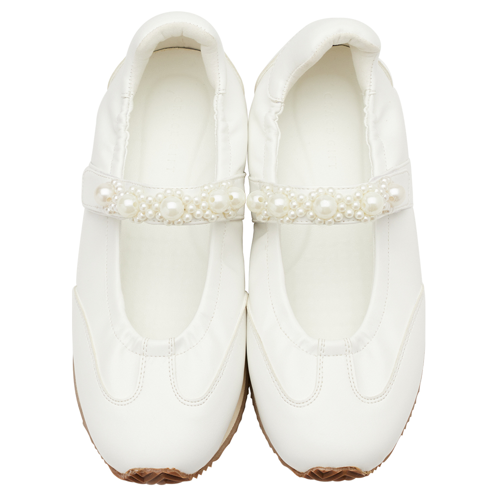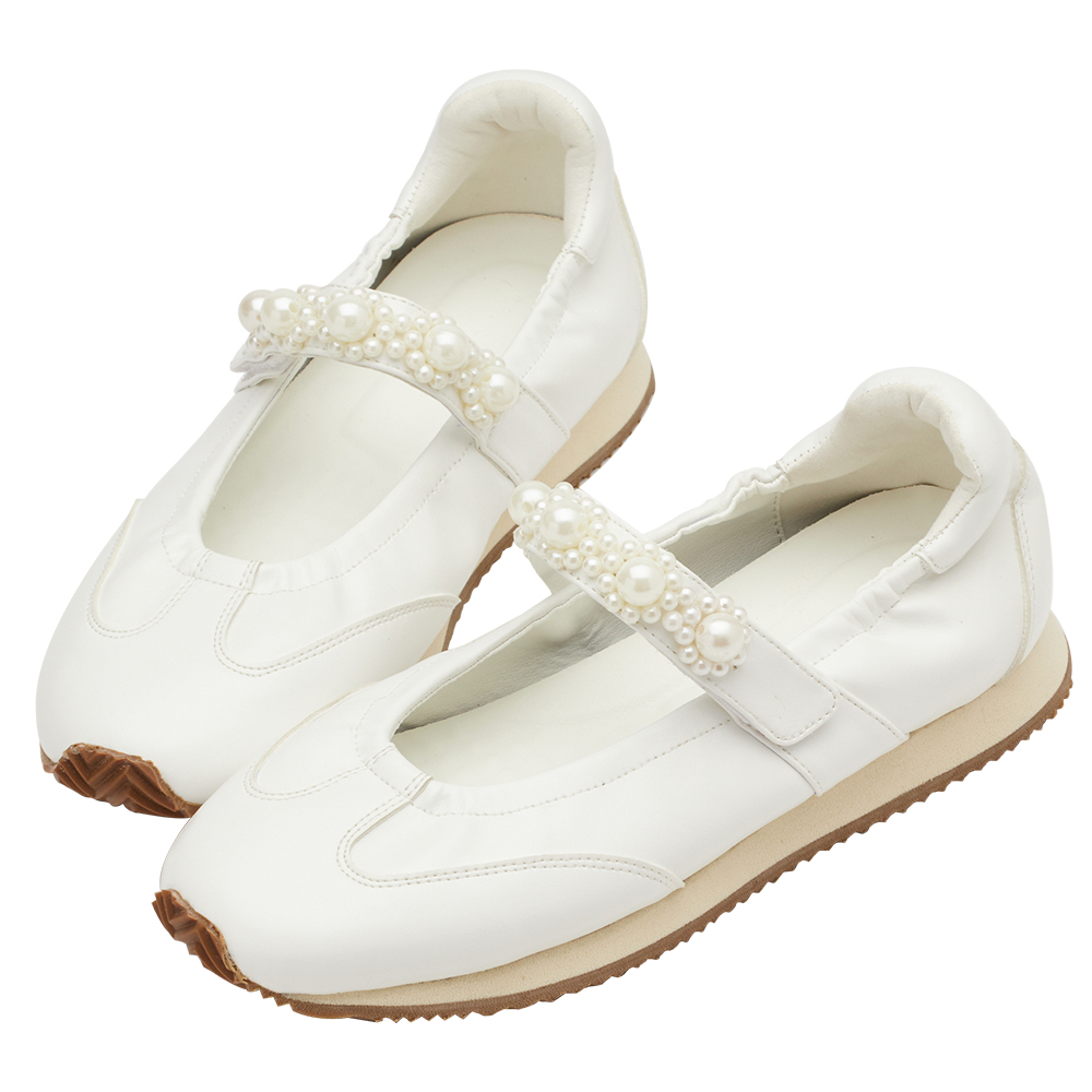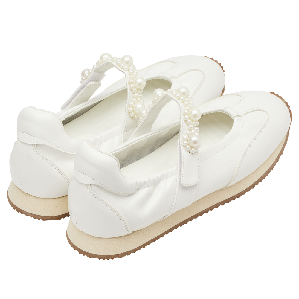 珍珠小花條帶魔鬼氈芭蕾舞瑪莉珍鞋 米白