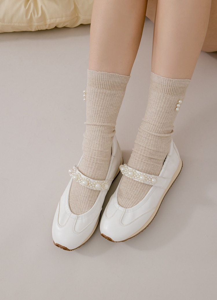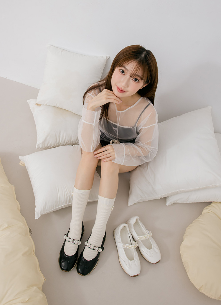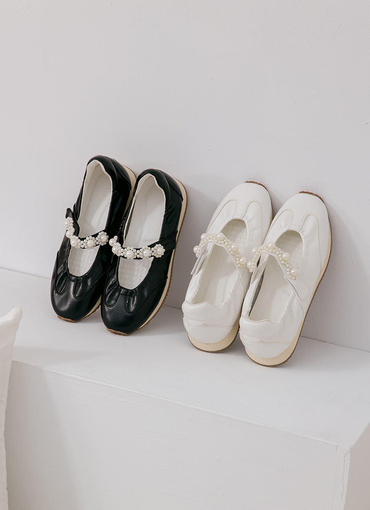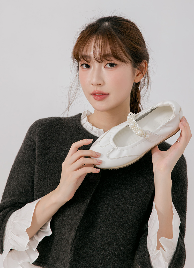 珍珠小花條帶魔鬼氈芭蕾舞瑪莉珍鞋 米白