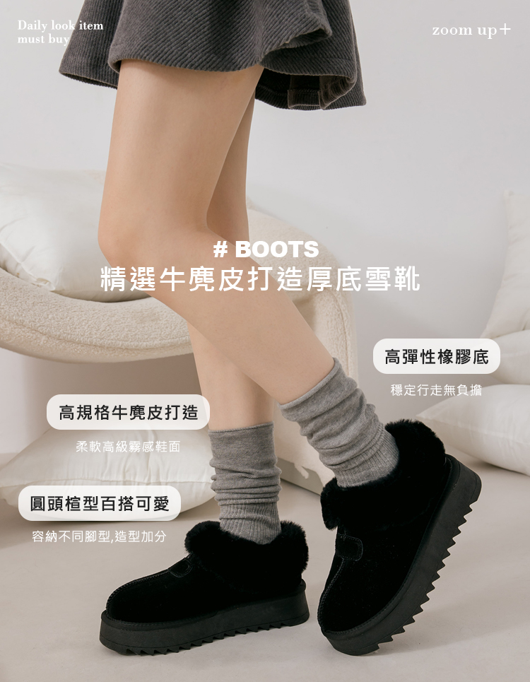 材質:柔軟牛二層皮+羊毛&人造毛內裡+絨毛鞋墊+耐磨防滑大底