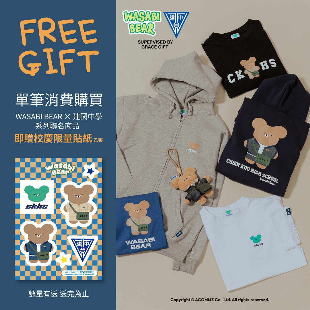 - 凡購買任一 Wasabi Bear × 建中聯名商品 即贈校園紀念貼紙1張