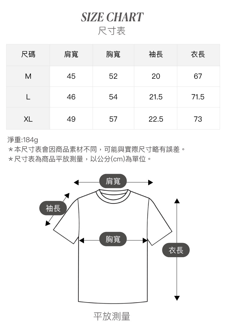 XL:肩寬49cm 胸寬57cm 袖長22.5cm 衣長73cm
