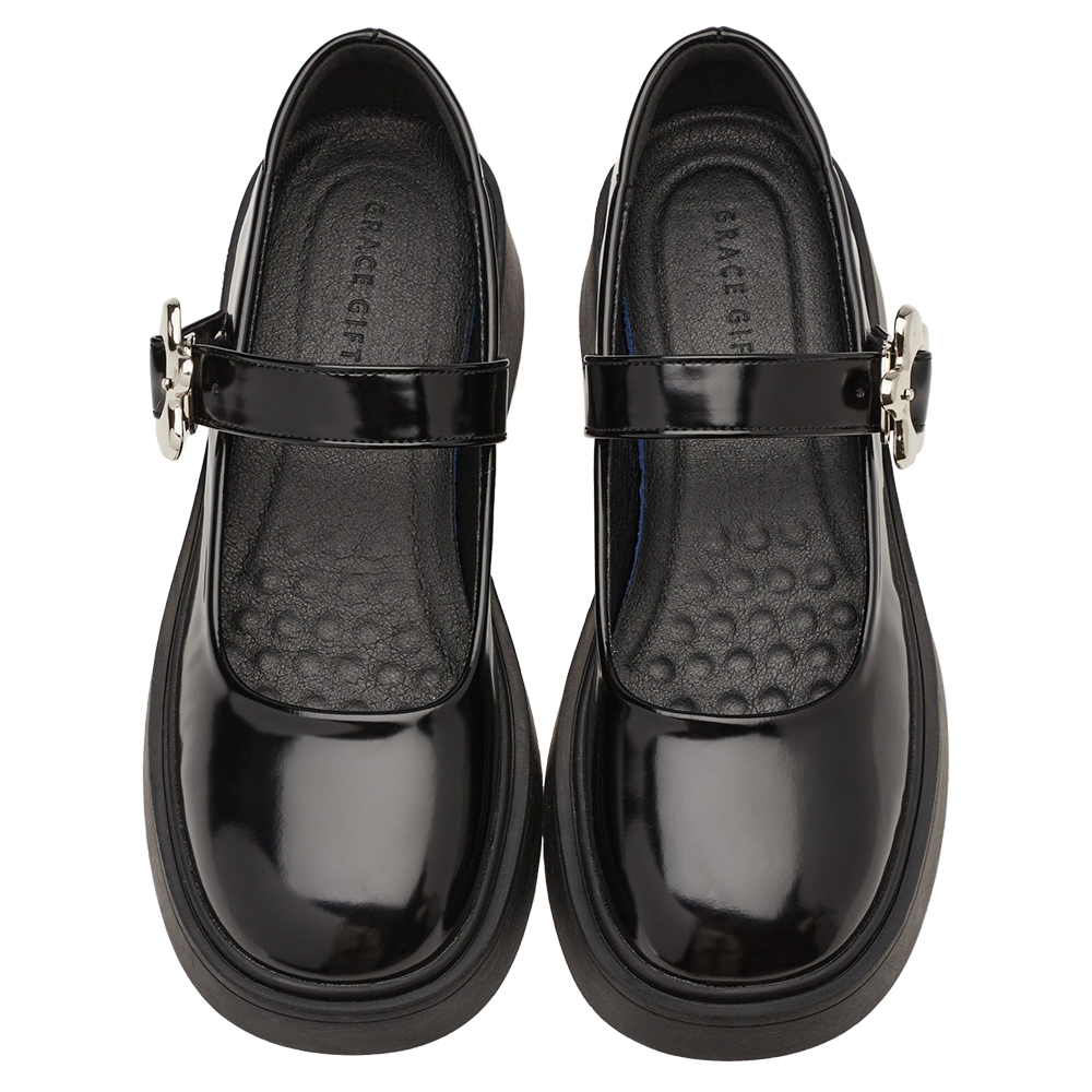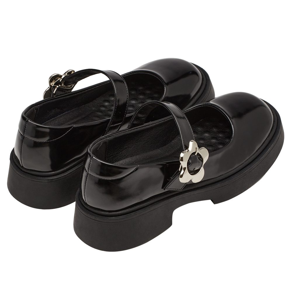甜酷少女金屬小花扣輕量瑪莉珍鞋 黑漆