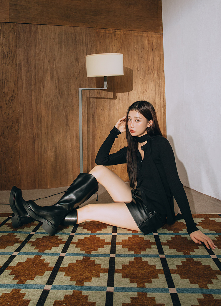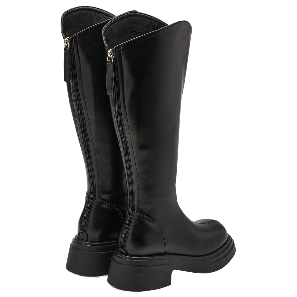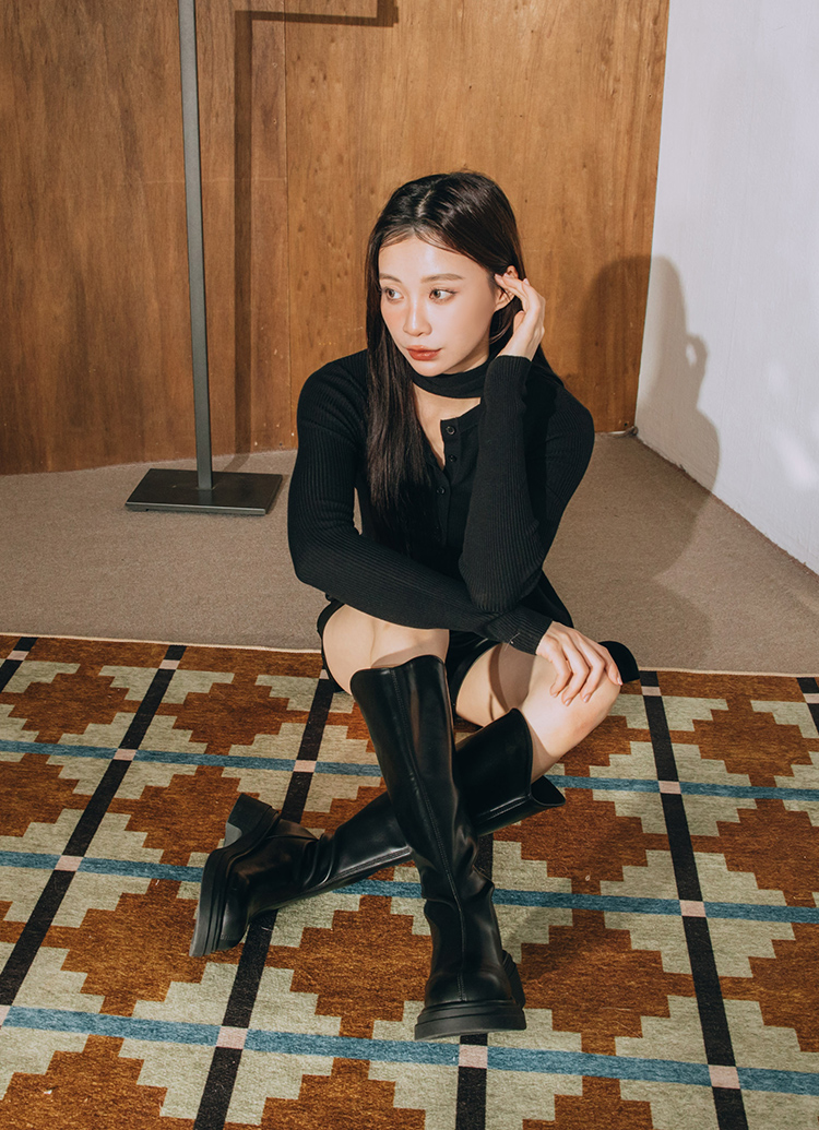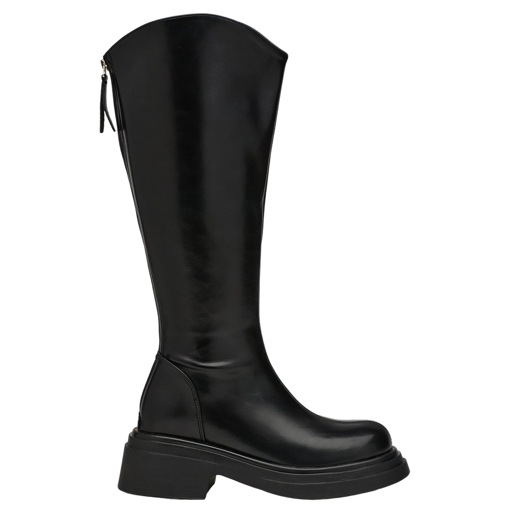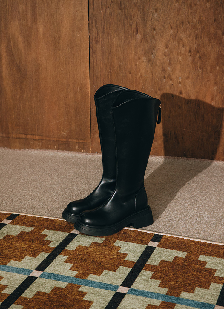 V口顯瘦(加寬筒圍)後拉圓頭厚底長靴 黑