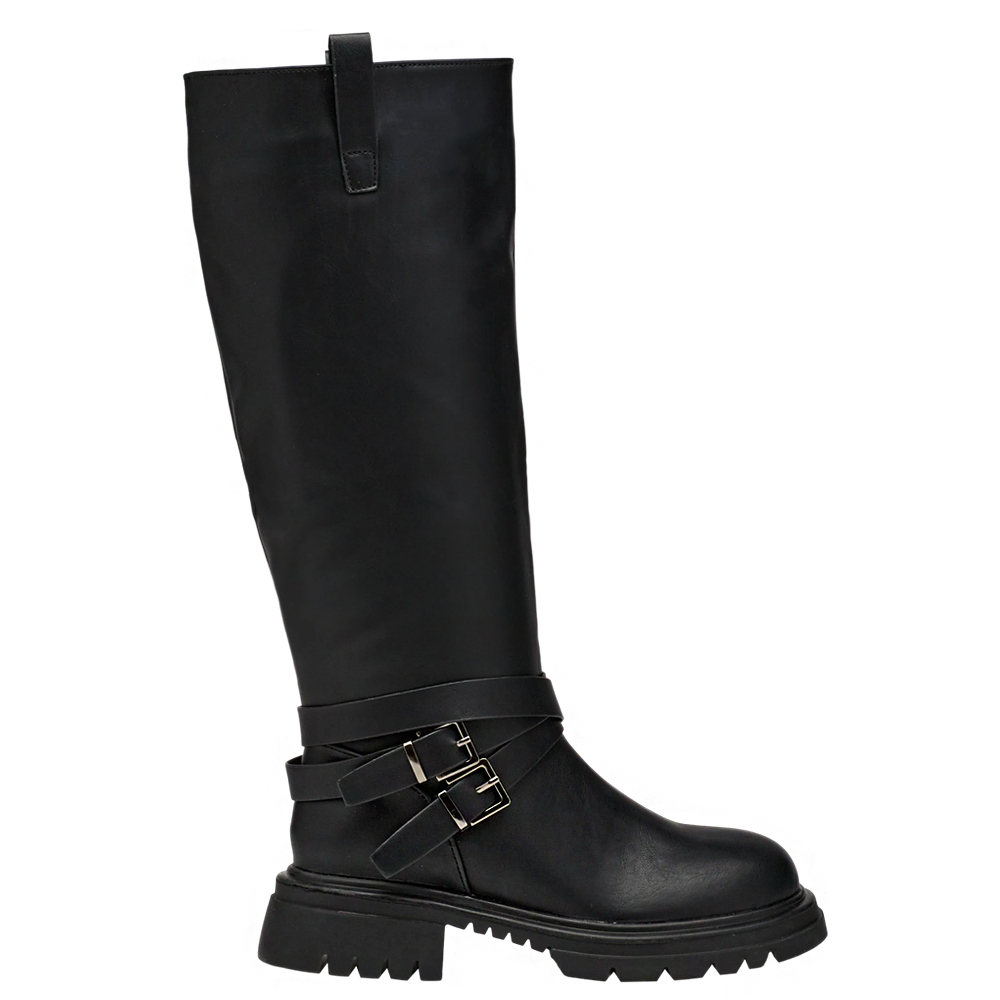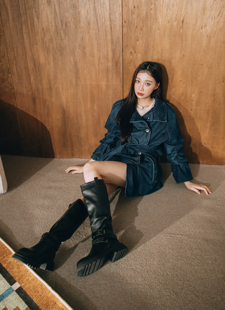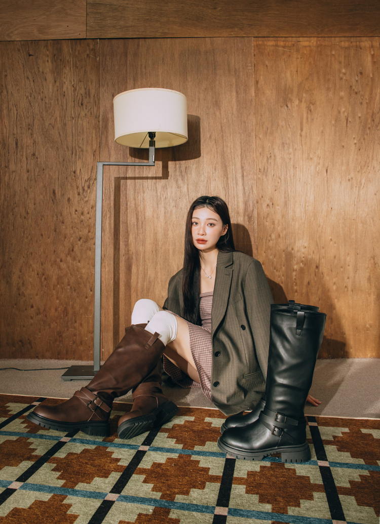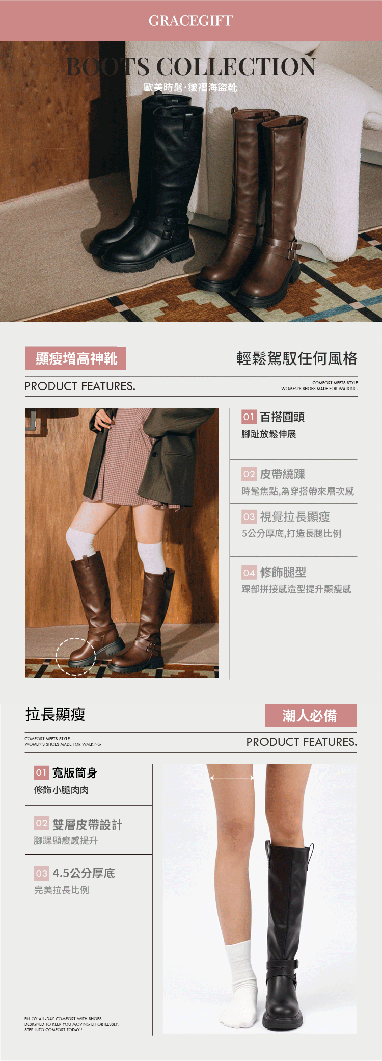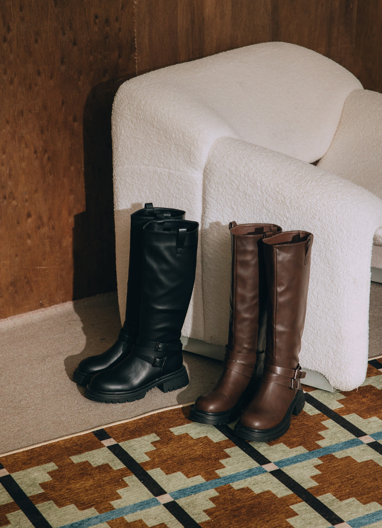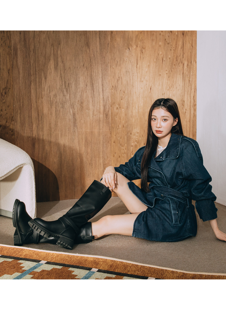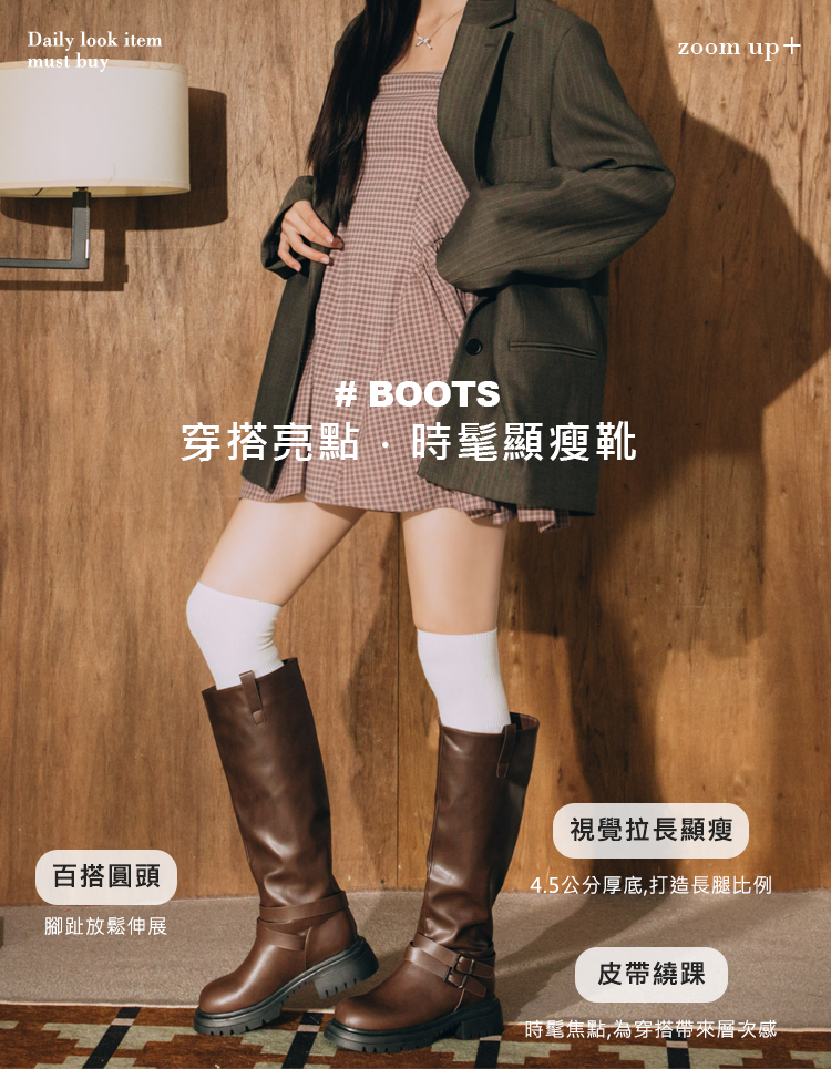 首頁 > 女鞋 > 靴子全系列 >俐落圓頭側拉環繞踝皮帶厚底長靴 黑