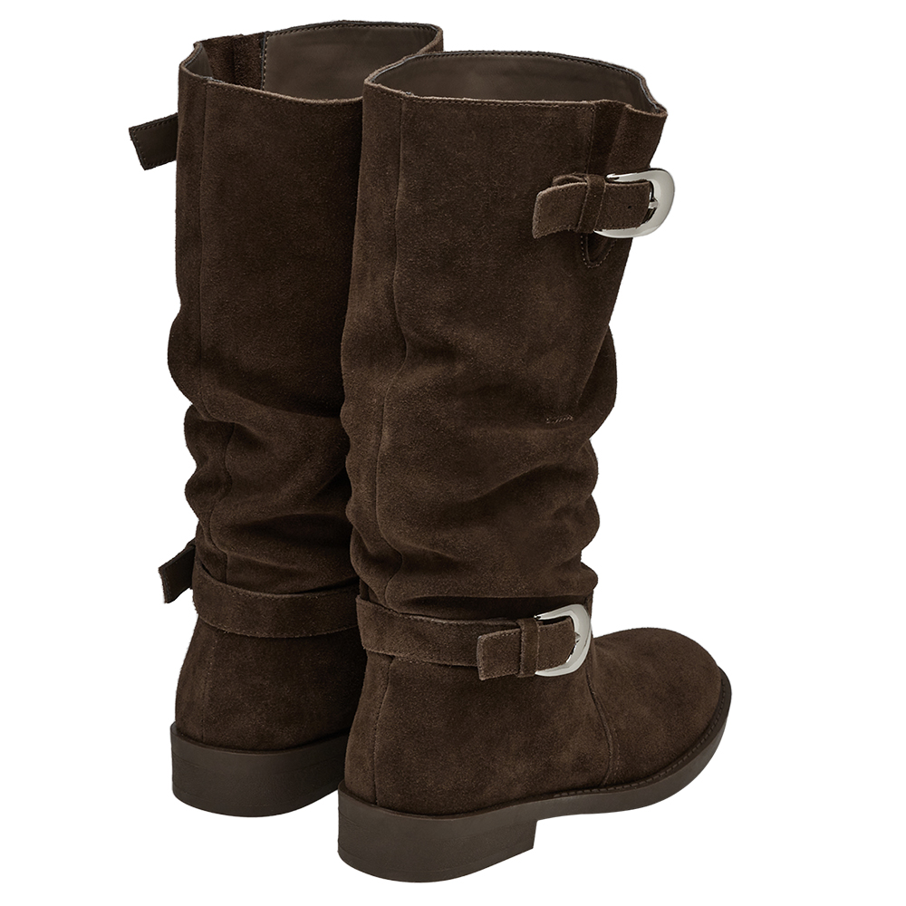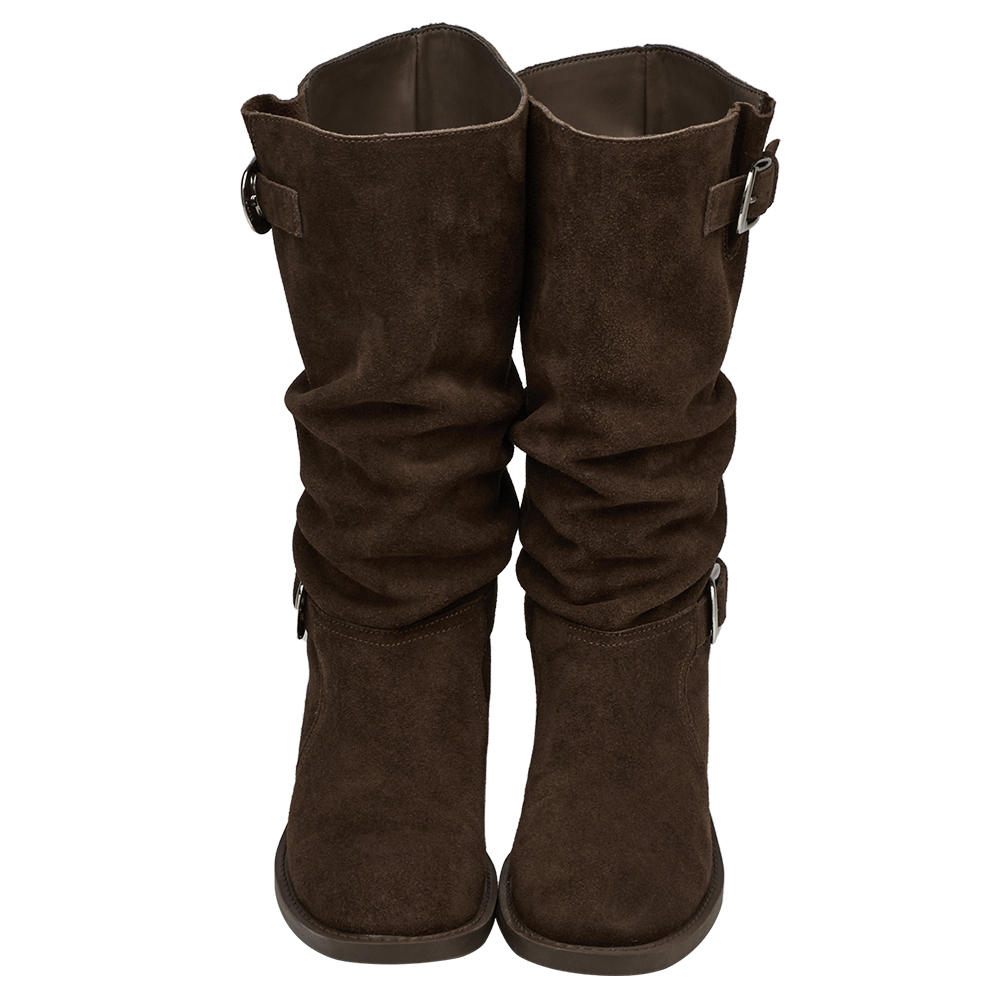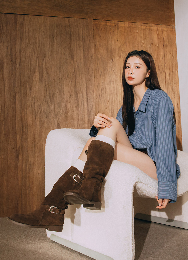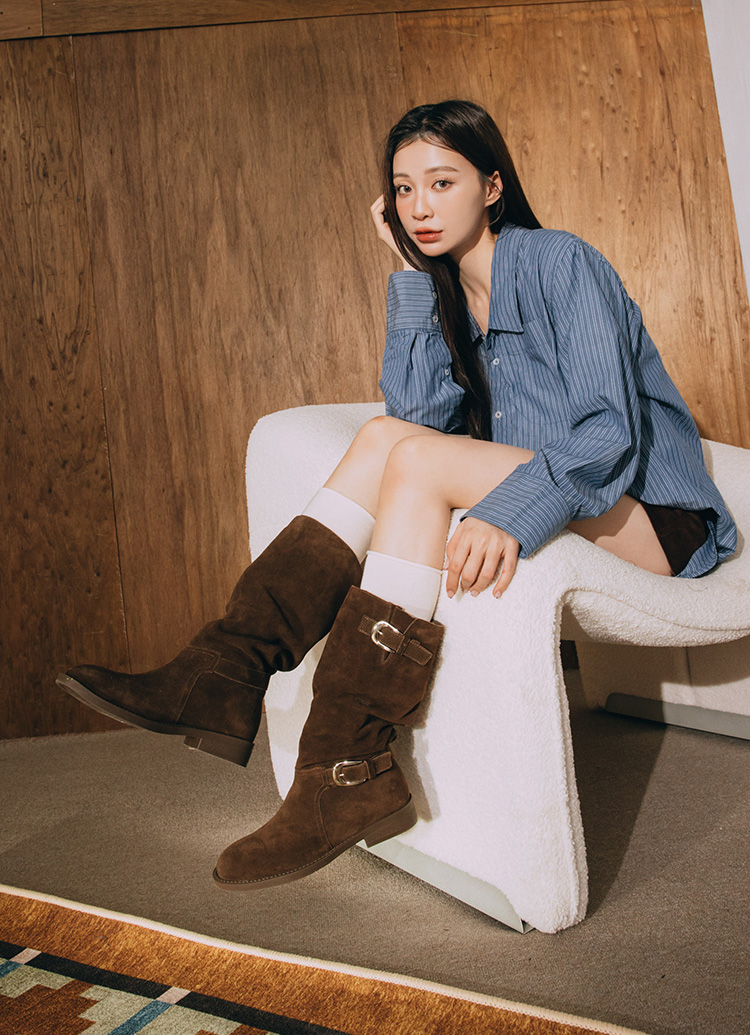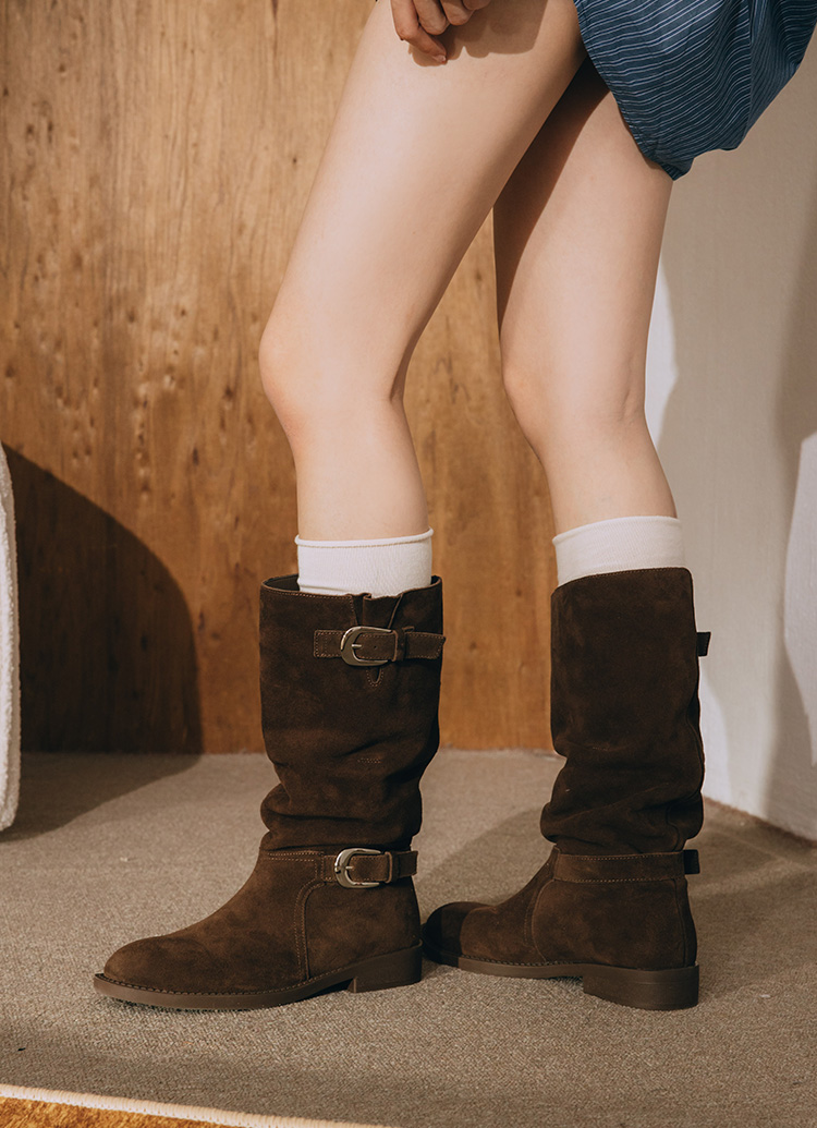 慵懶隨性麂皮雙層皮帶扣堆堆長靴 咖