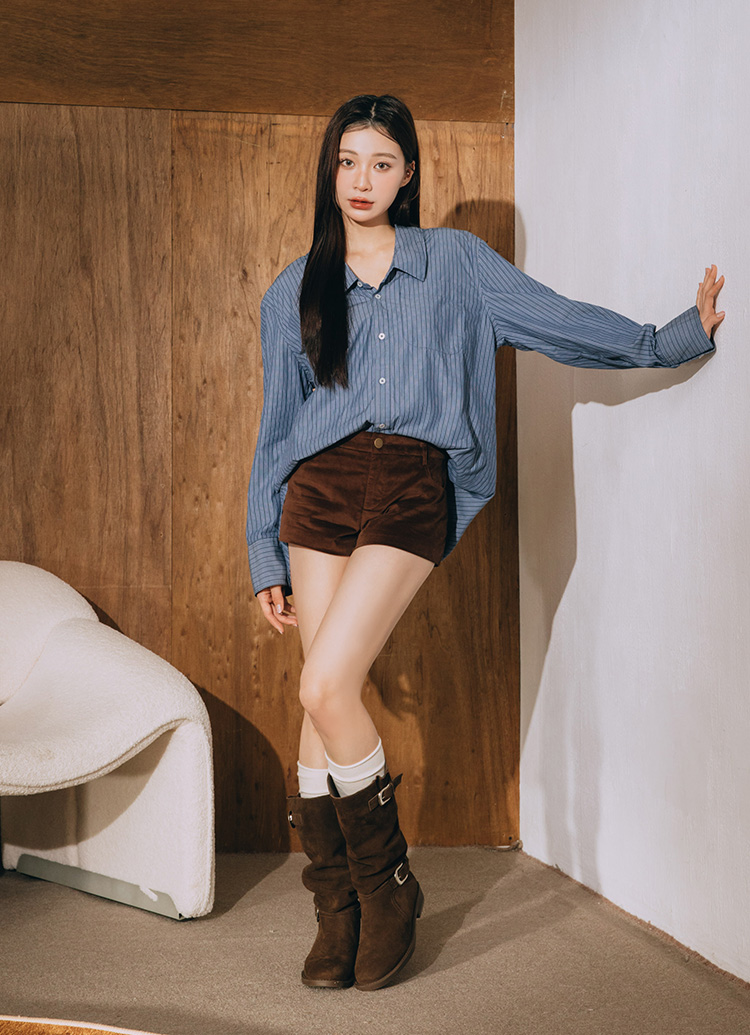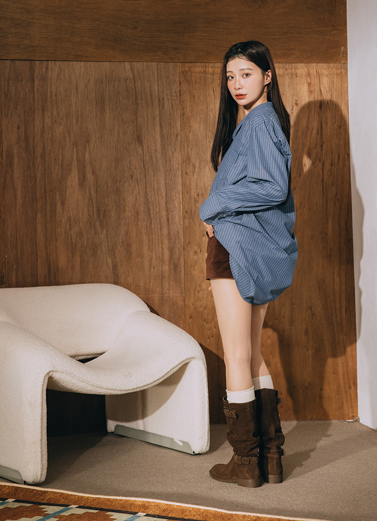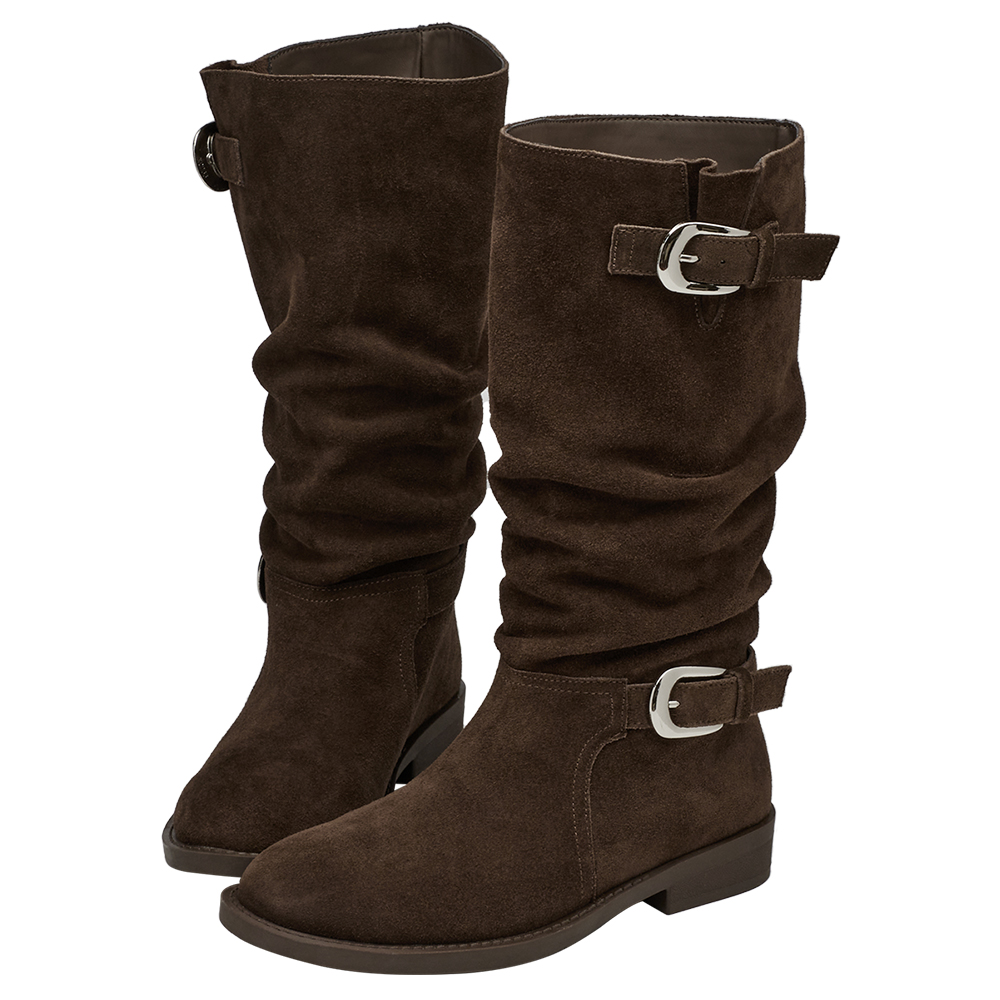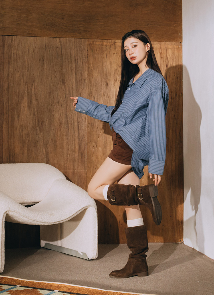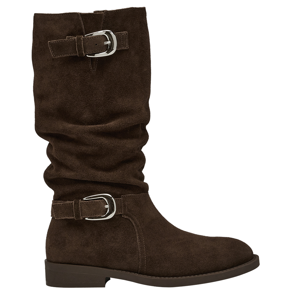 慵懶隨性麂皮雙層皮帶扣堆堆長靴 咖