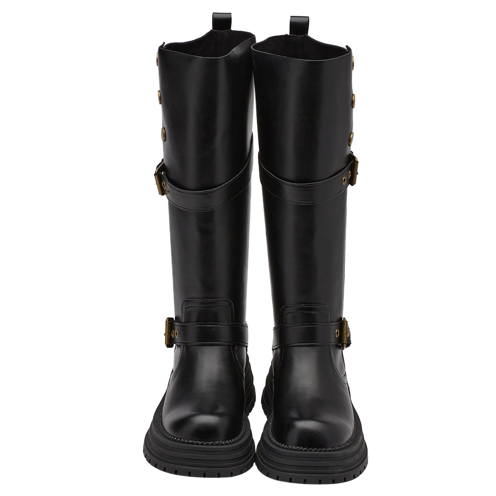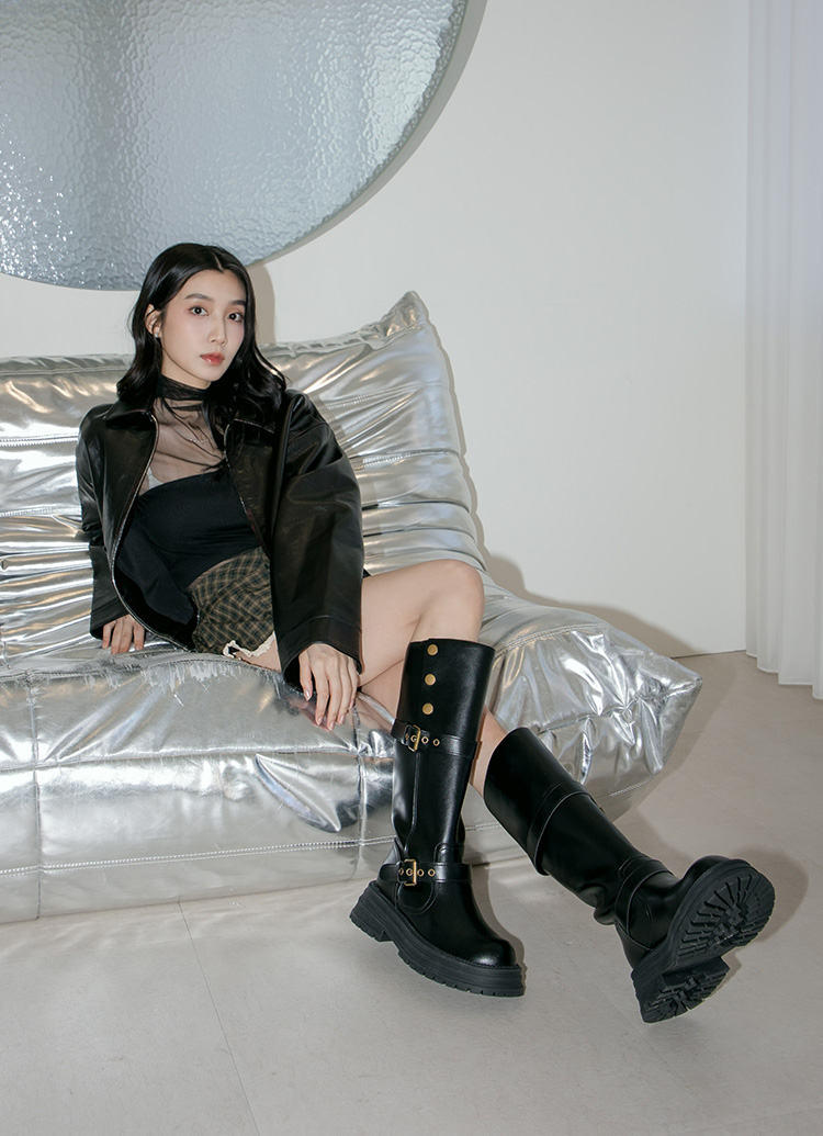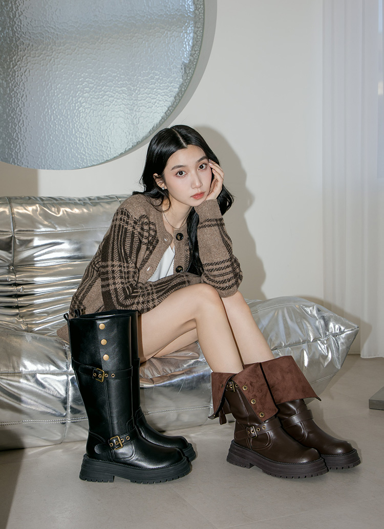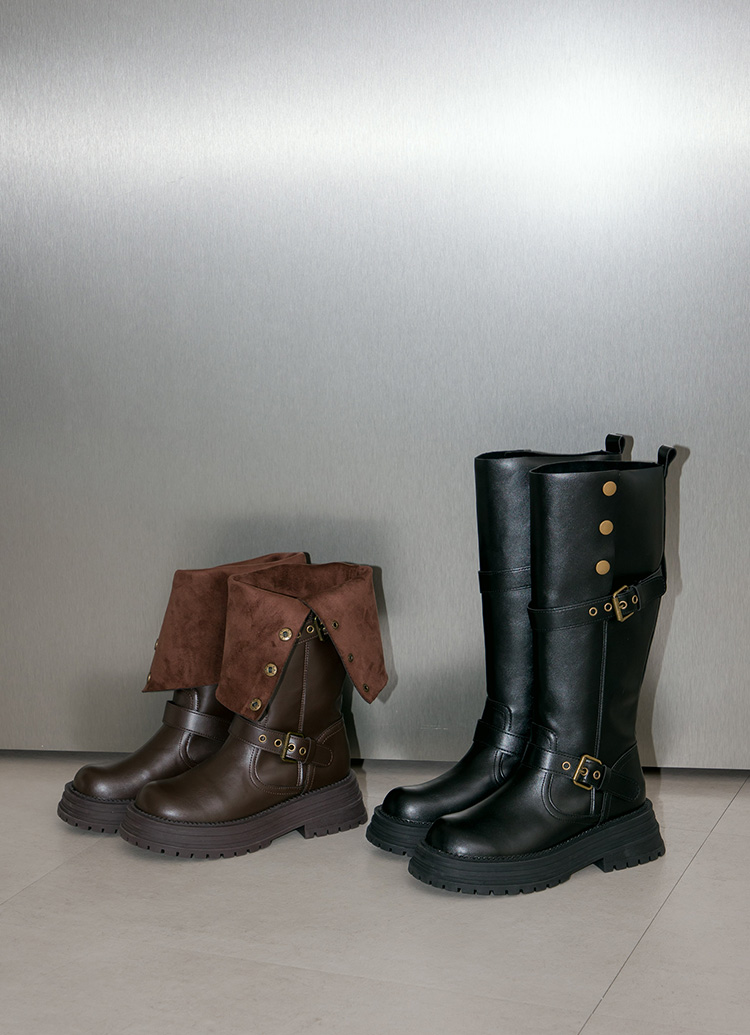聖水街頭2WAY反折皮帶卯釘顯瘦長靴 黑
