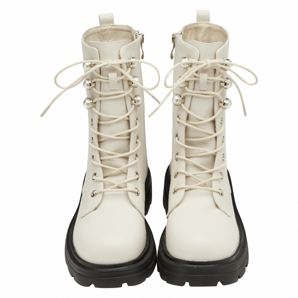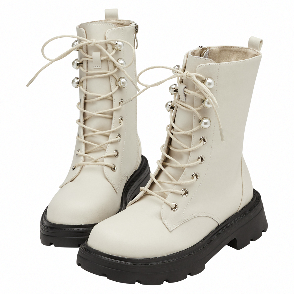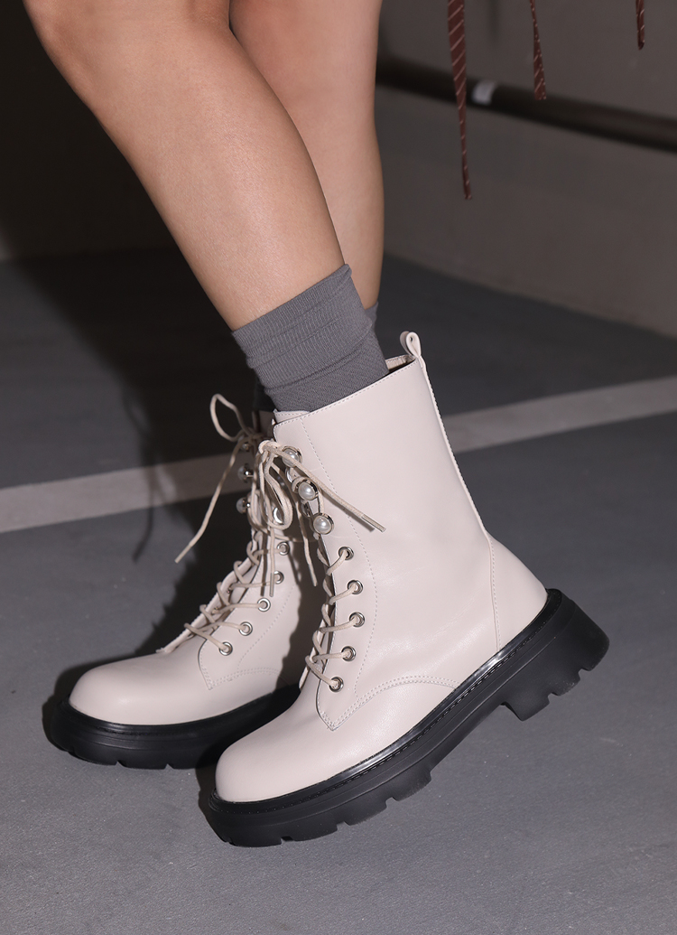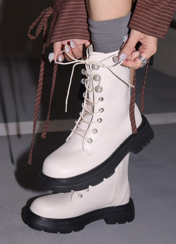 小貓聯名-名媛微光珍珠輕量厚底綁帶靴 米白