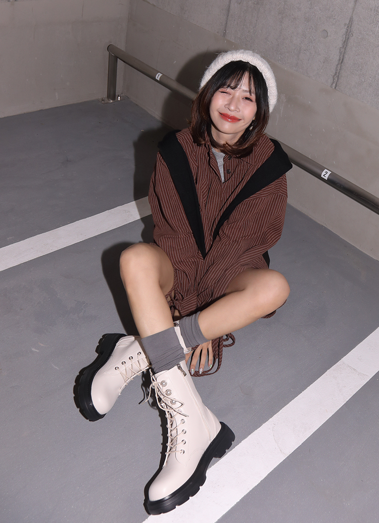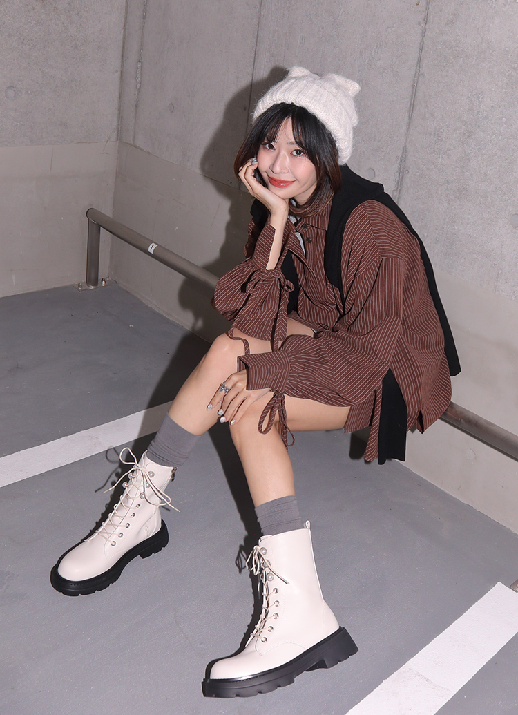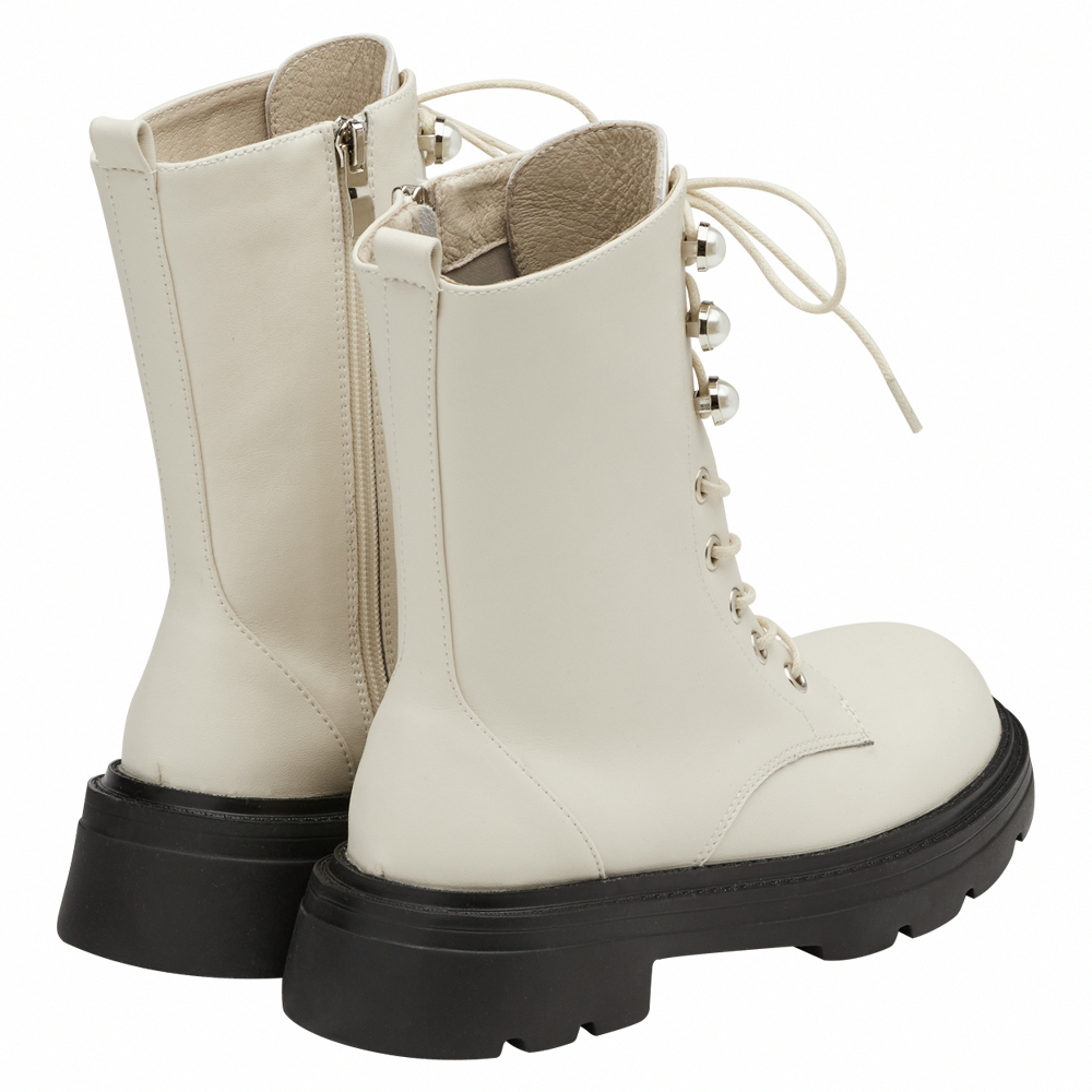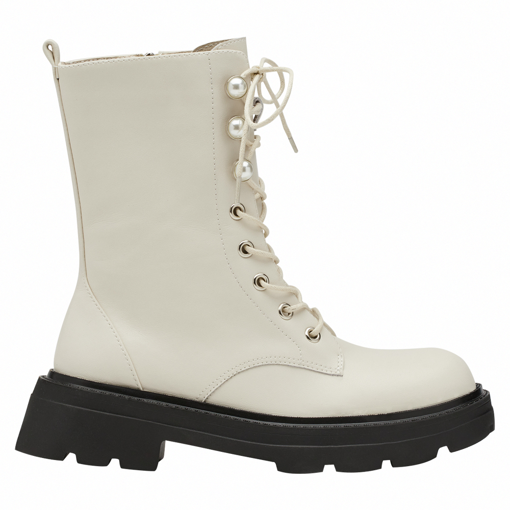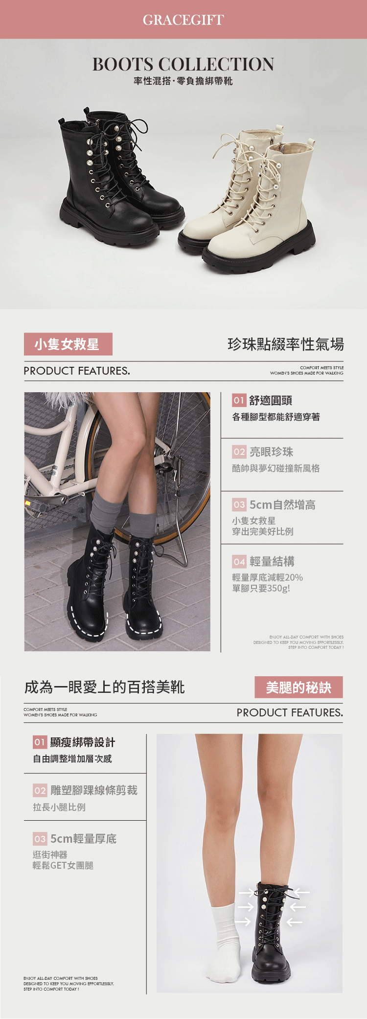 小貓聯名-名媛微光珍珠輕量厚底綁帶靴 米白