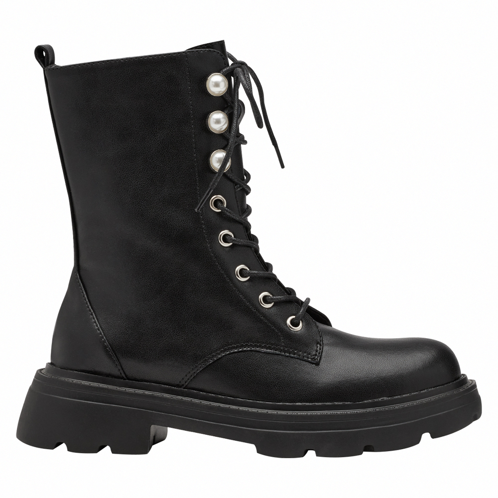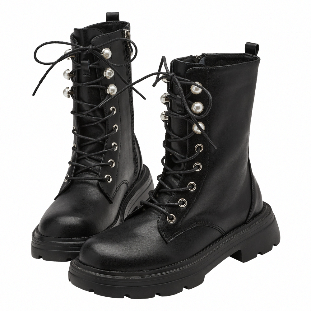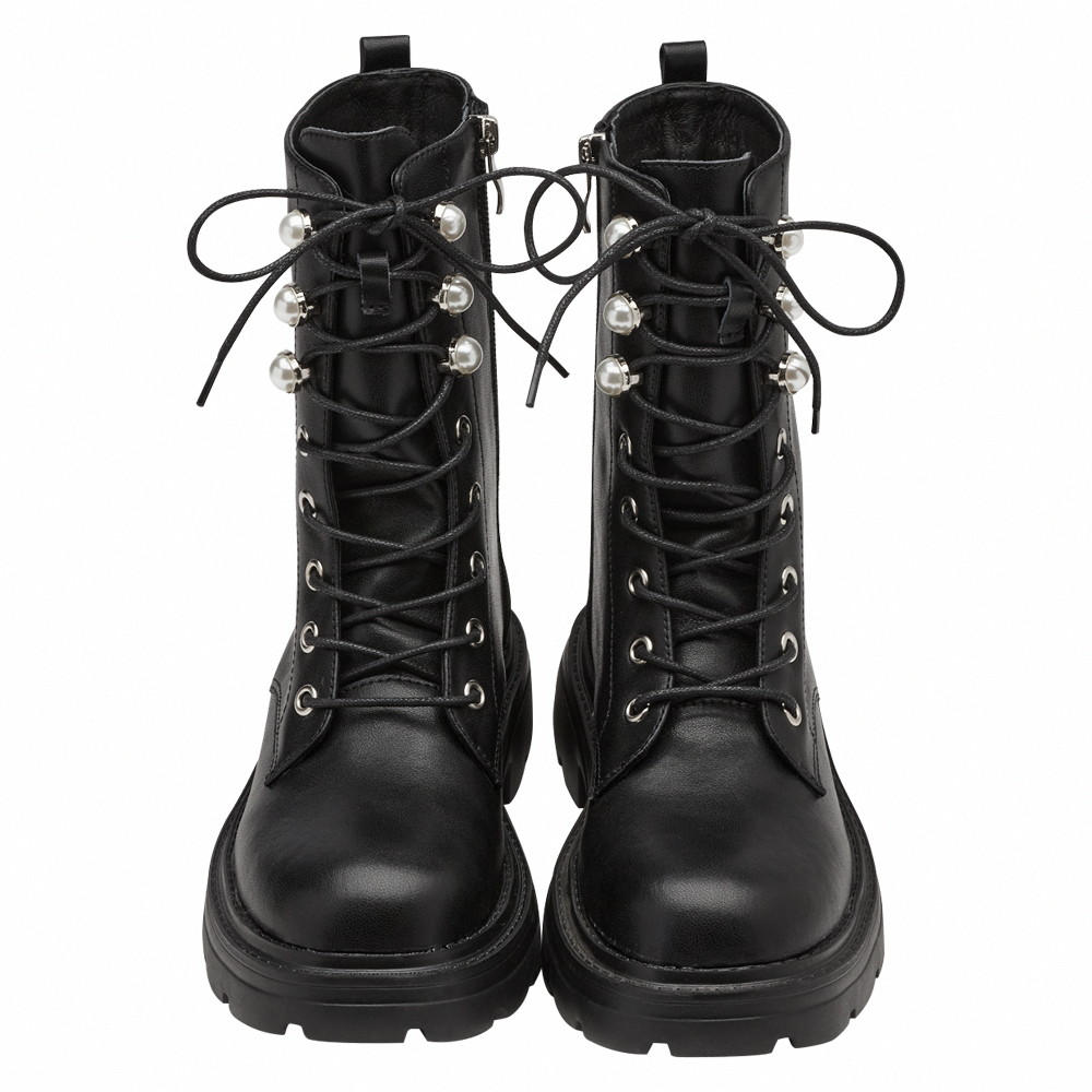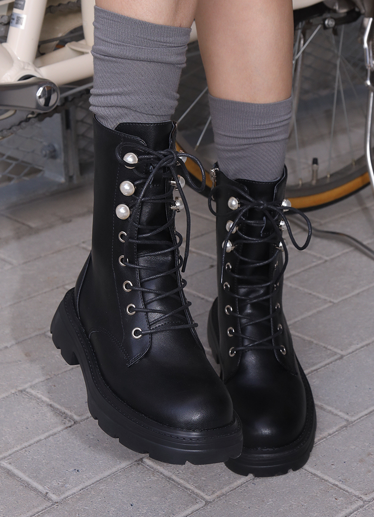 小貓聯名-名媛微光珍珠輕量厚底綁帶靴 黑