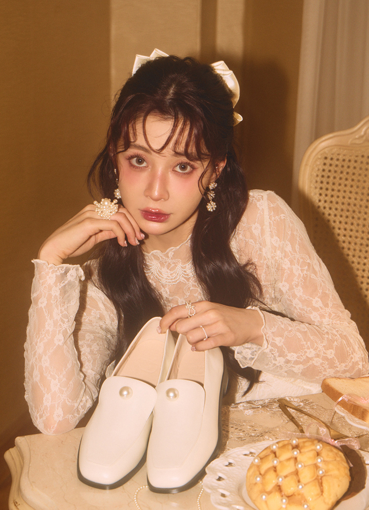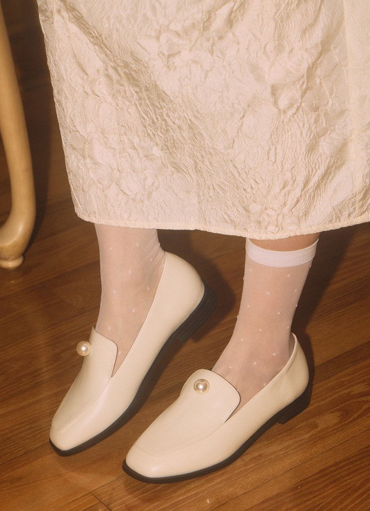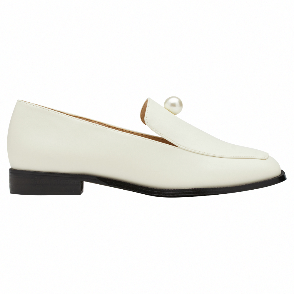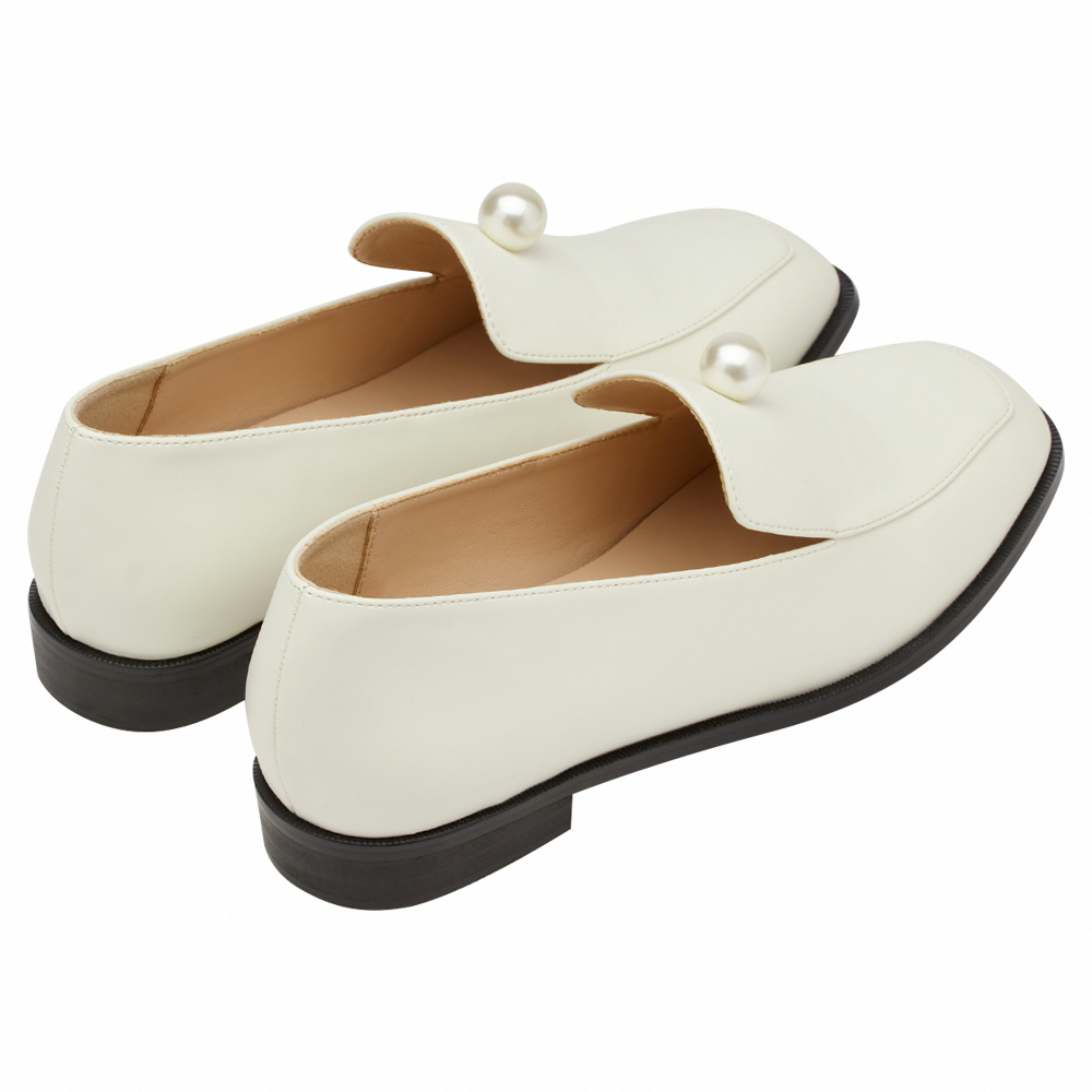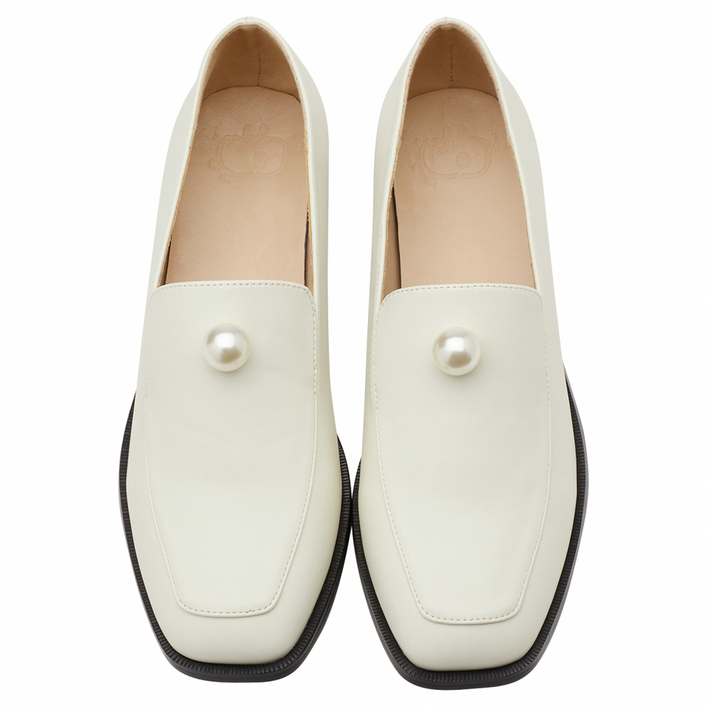 奕潔聯名-柔光珍珠方頭低跟樂福小皮鞋 米白