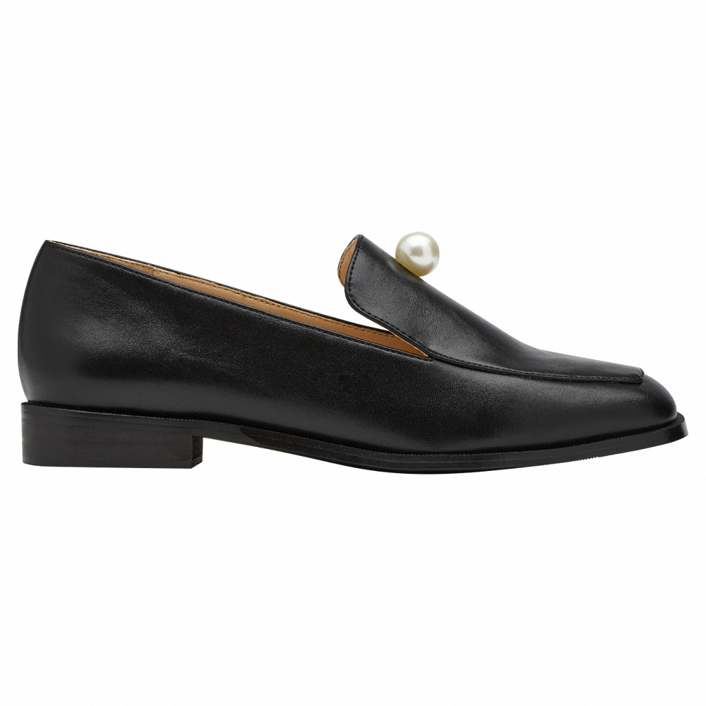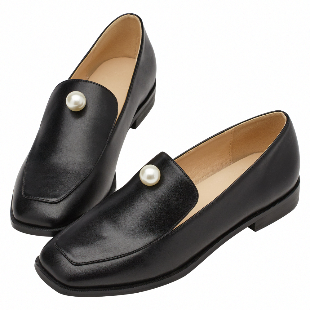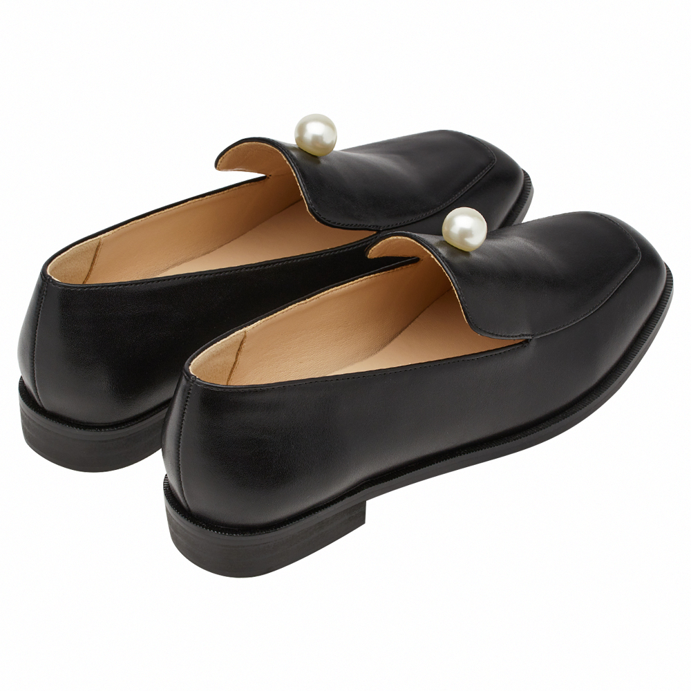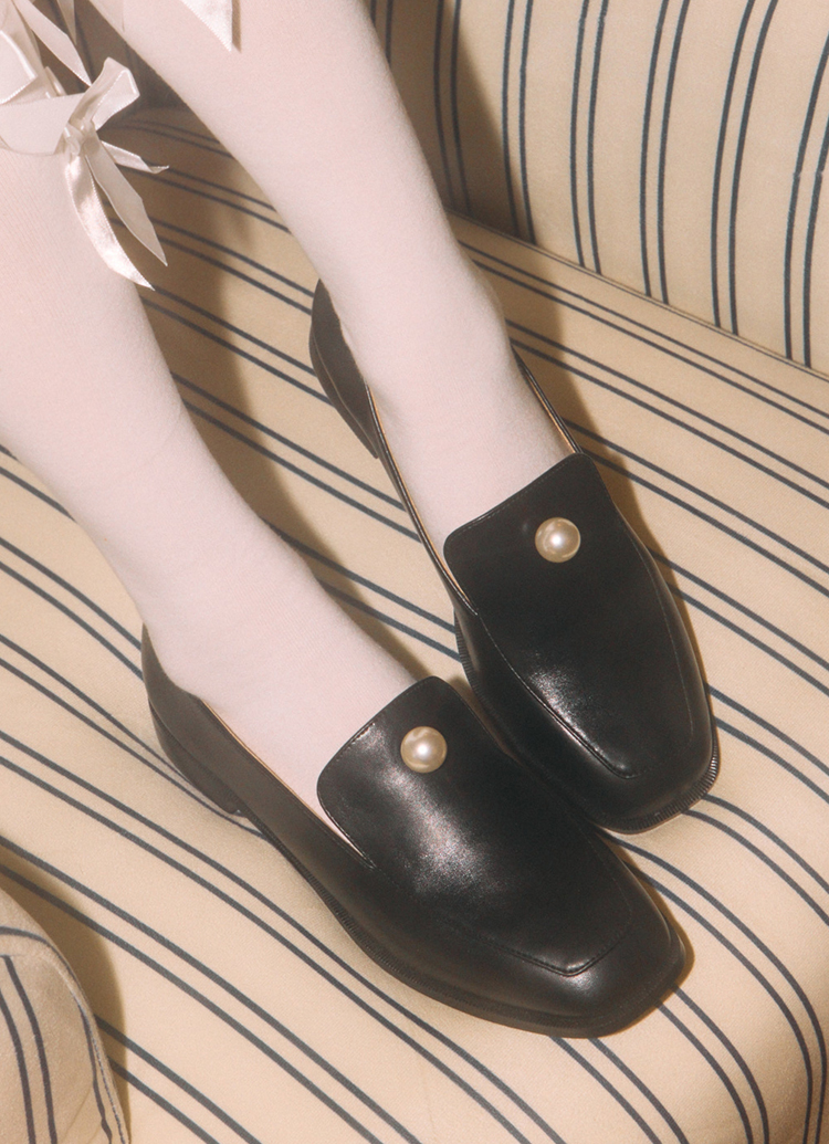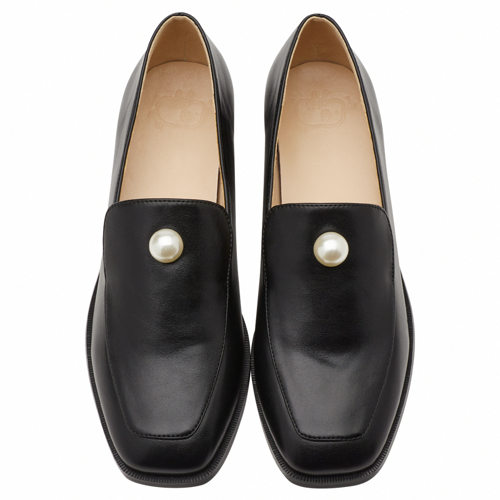奕潔聯名-柔光珍珠方頭低跟樂福小皮鞋 黑