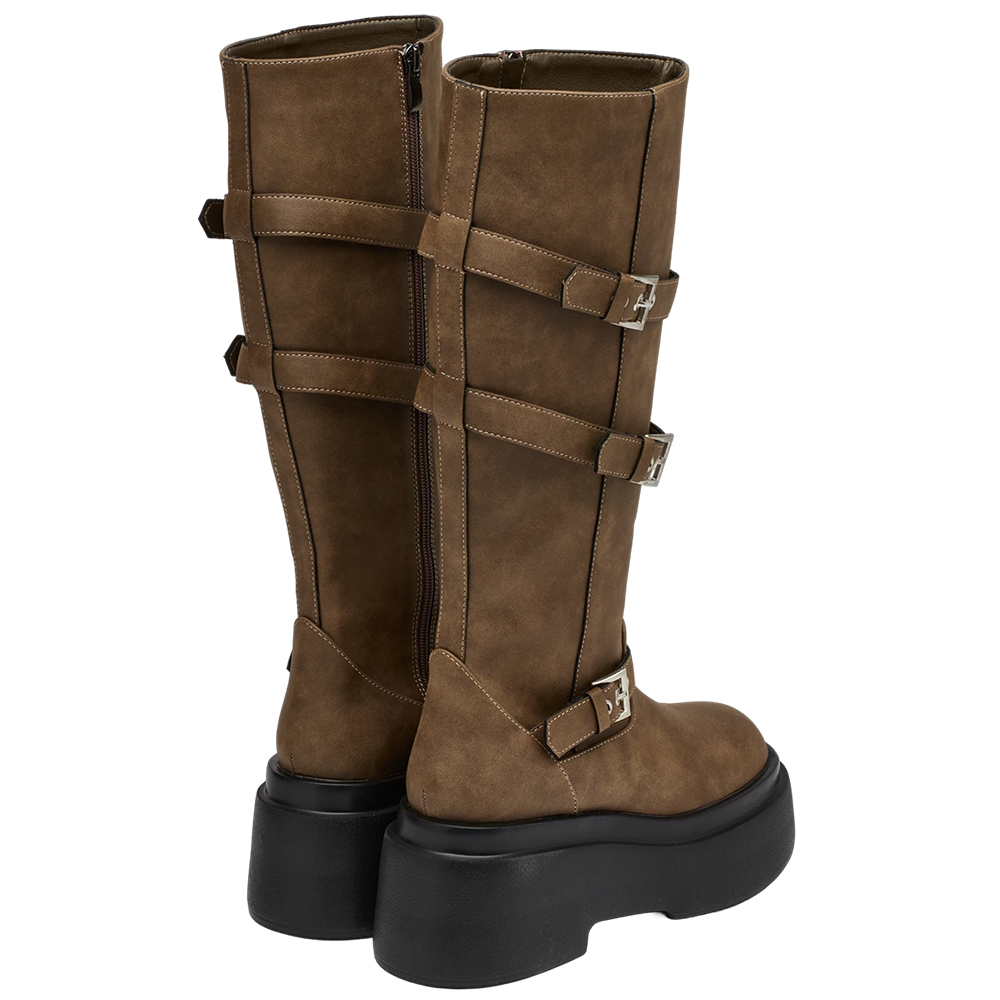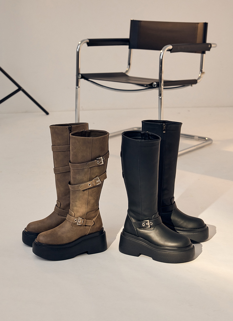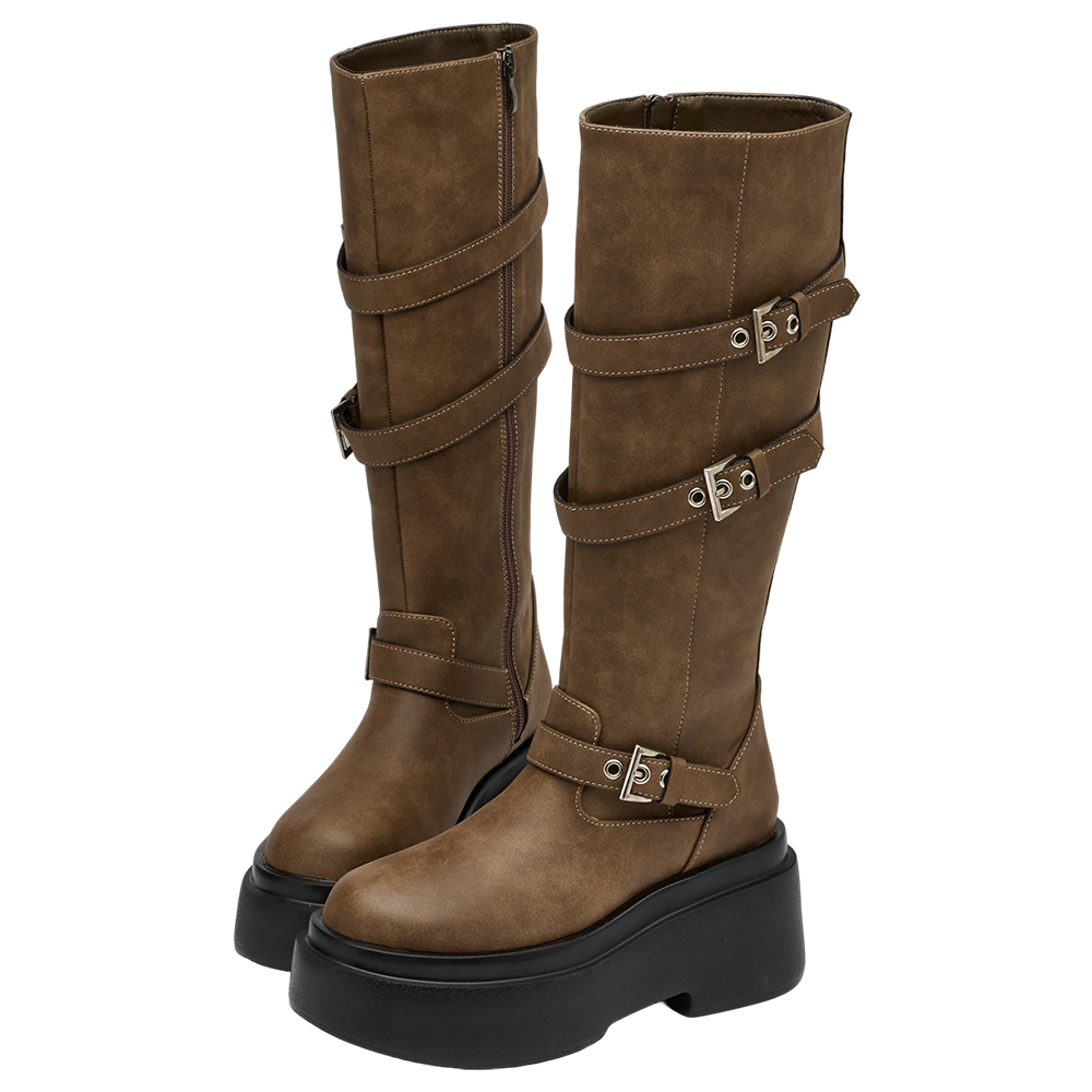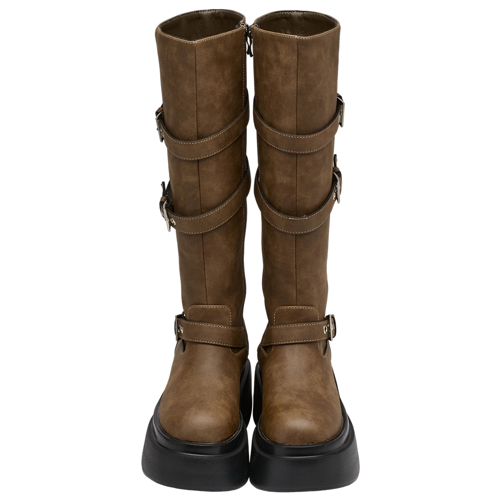 悅悅聯名-紐約街頭刷色扣環輕量厚底長靴 棕