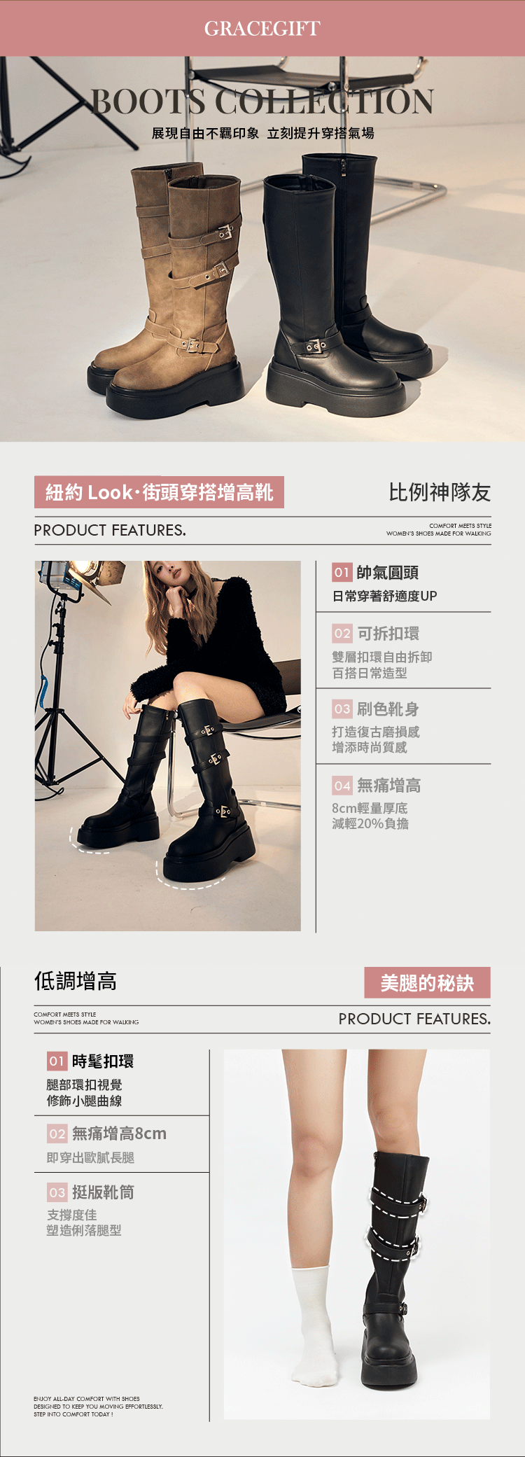 圓頭靴型舒適耐走,平衡扣環長靴的酷感