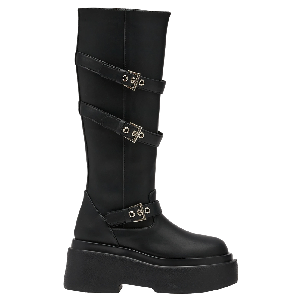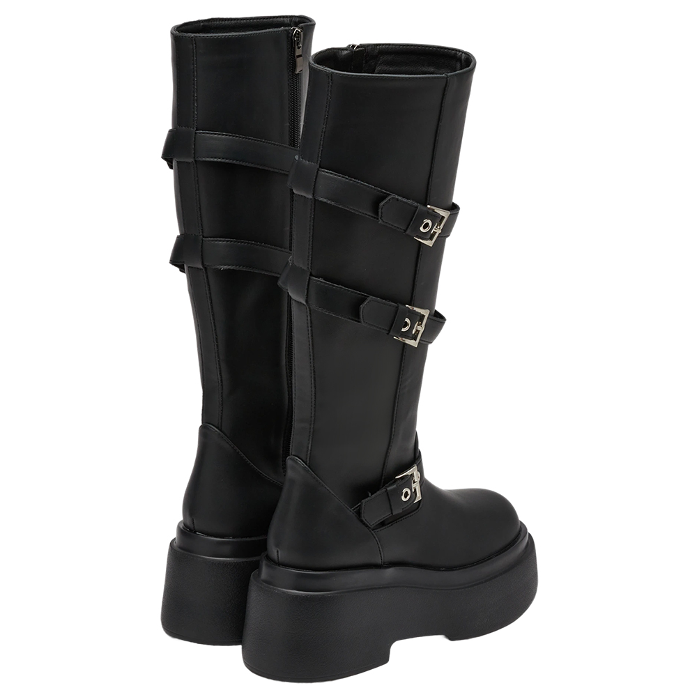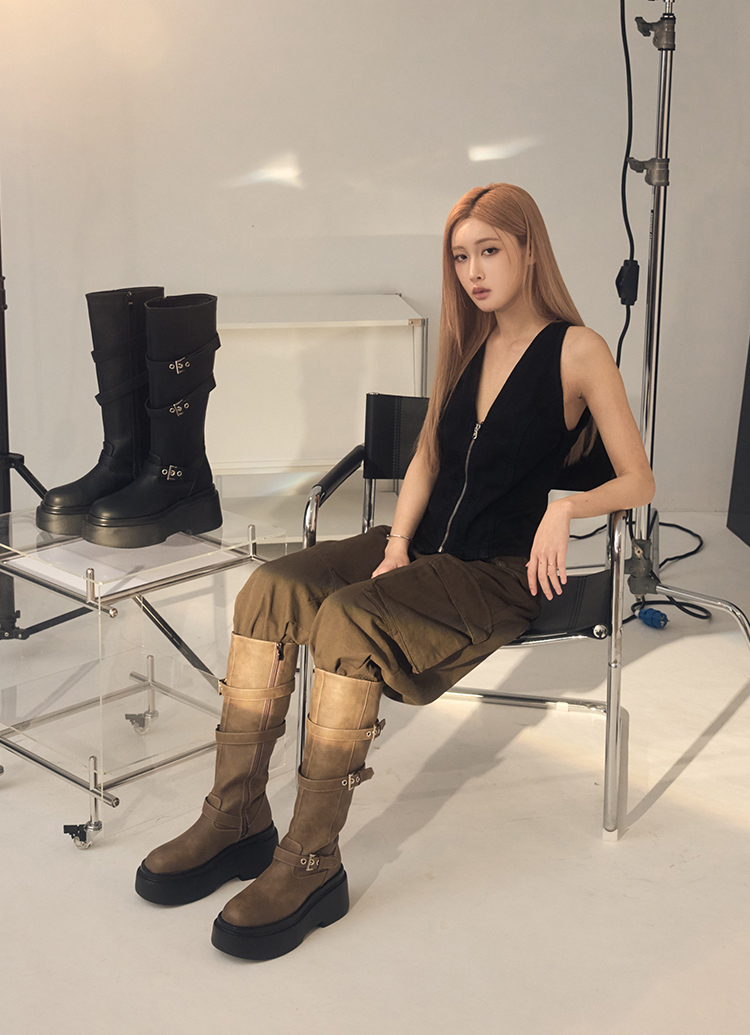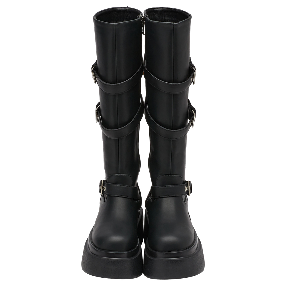 悅悅聯名-紐約街頭刷色扣環輕量厚底長靴 黑