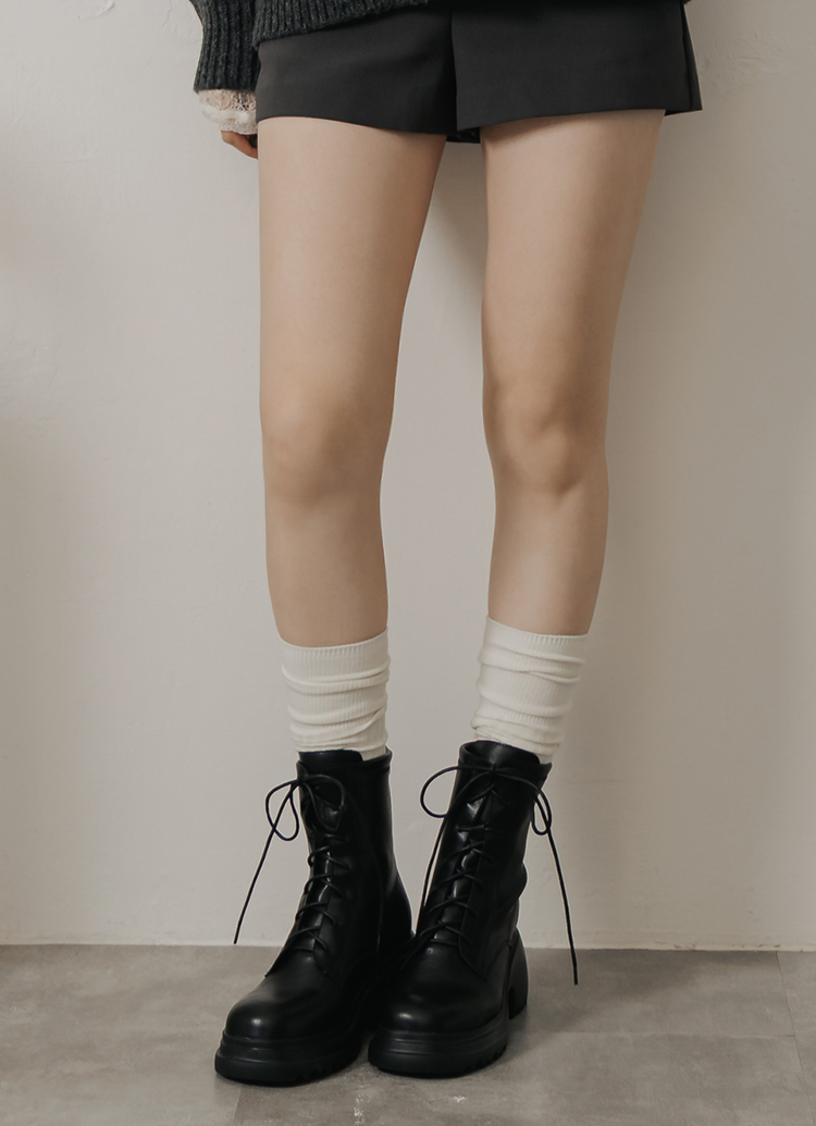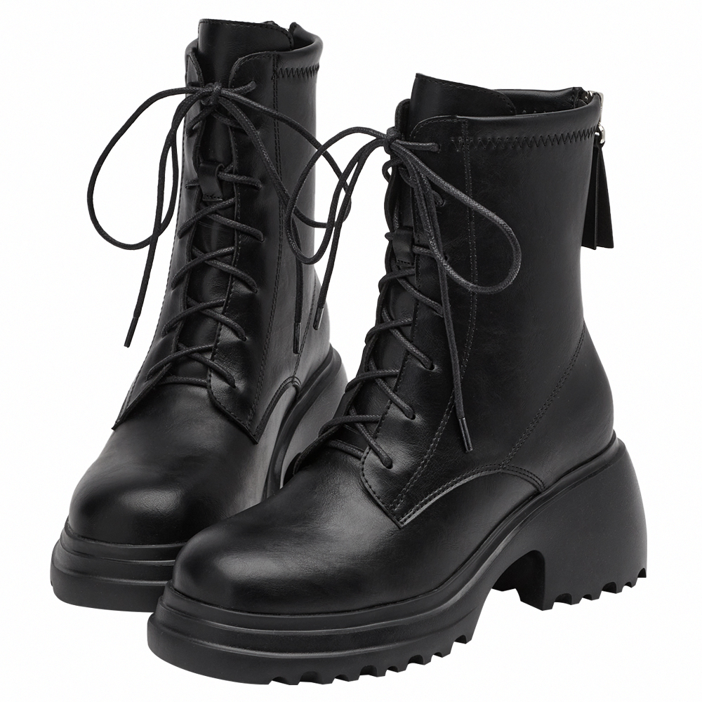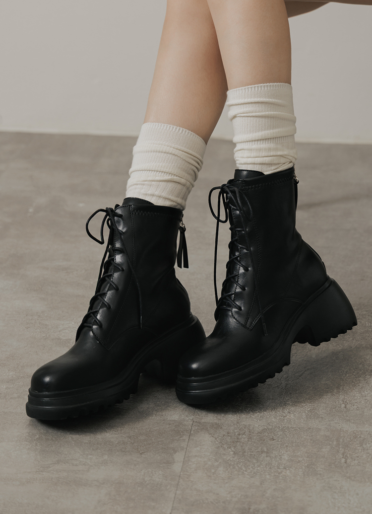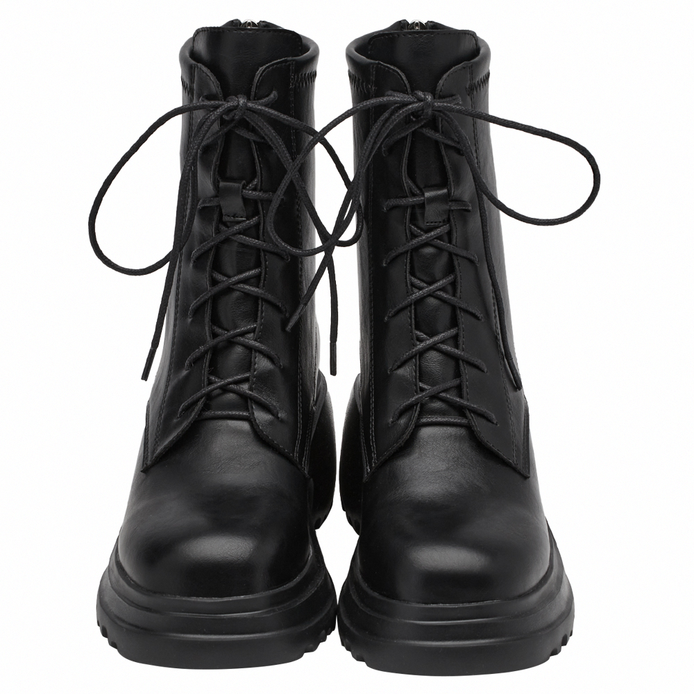 韓團必備圓頭輕量厚底綁帶短靴 黑