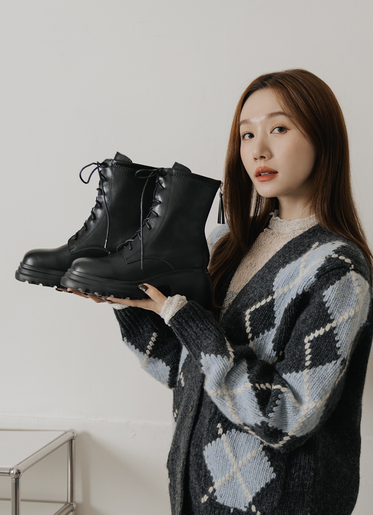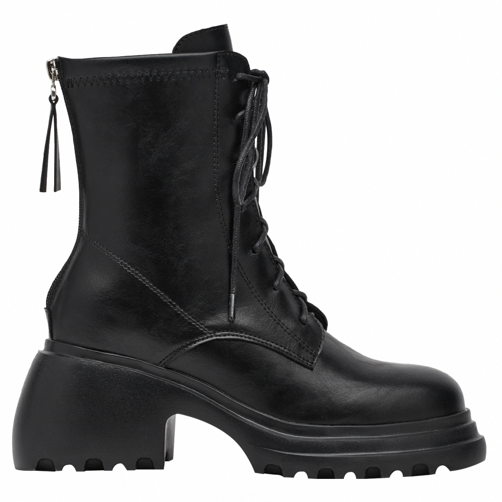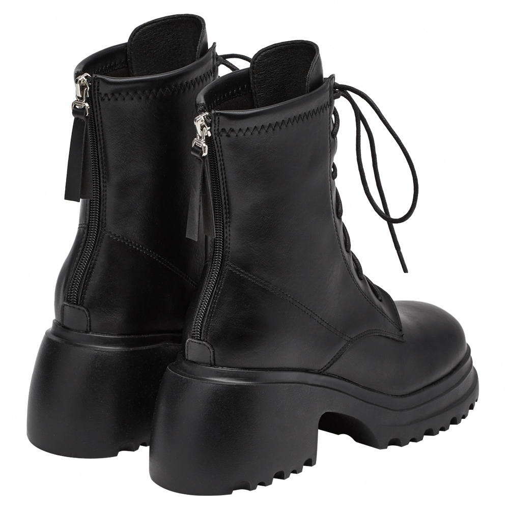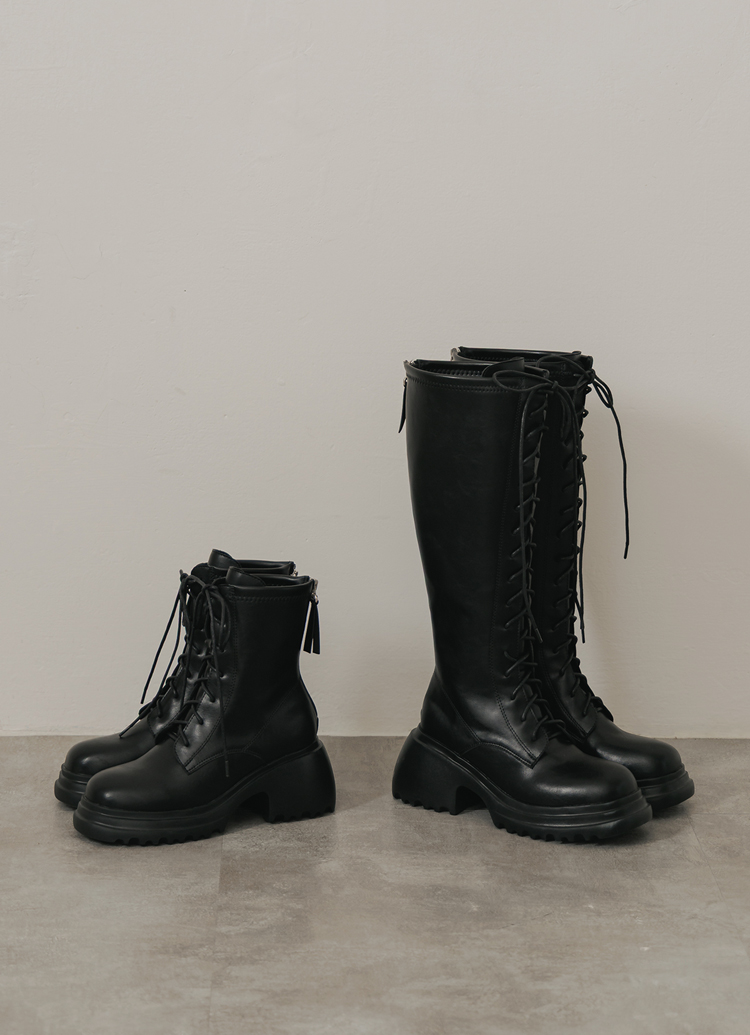 韓團必備圓頭輕量厚底綁帶短靴 黑