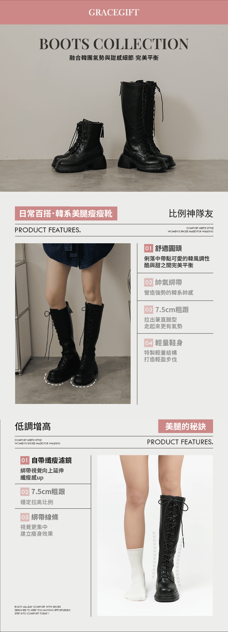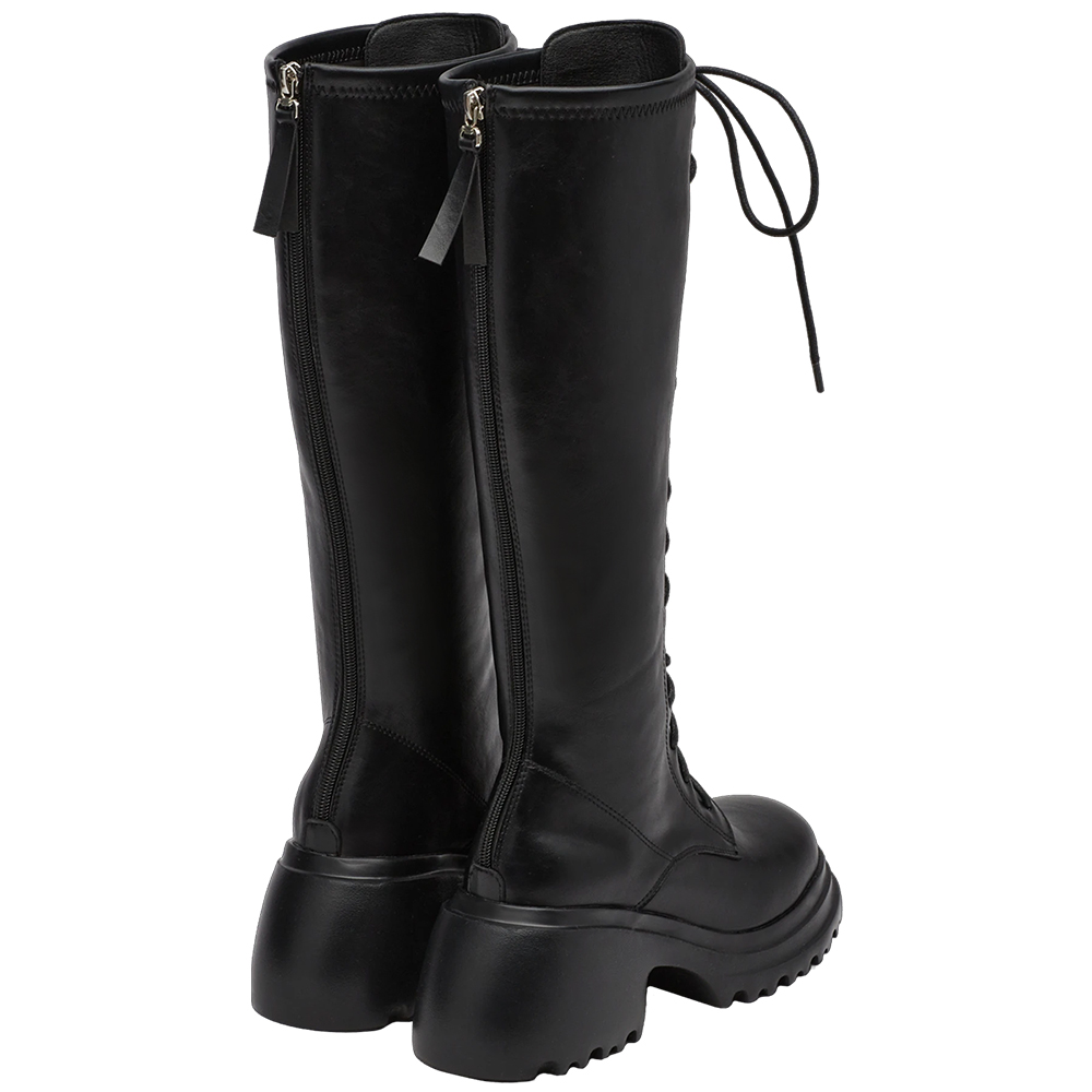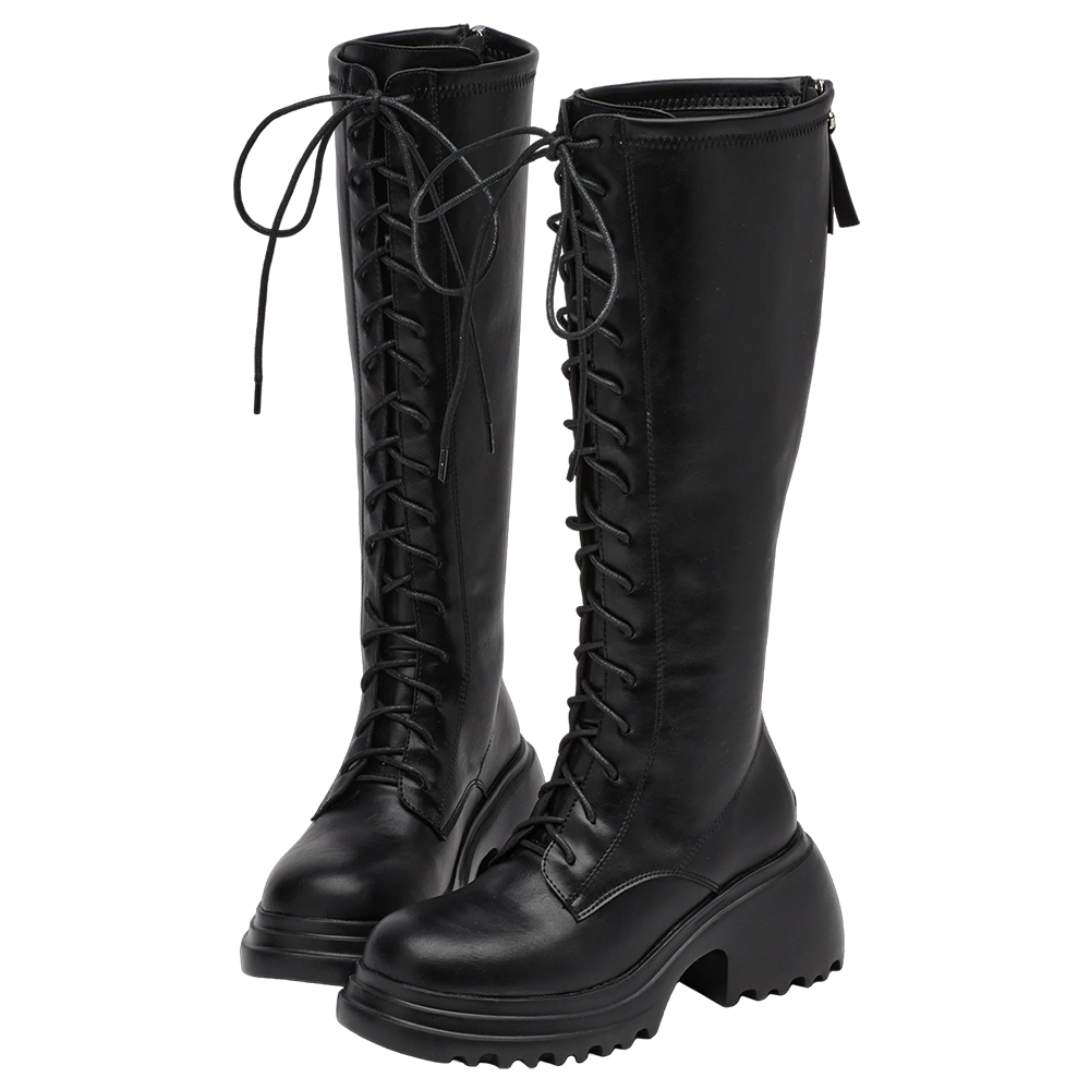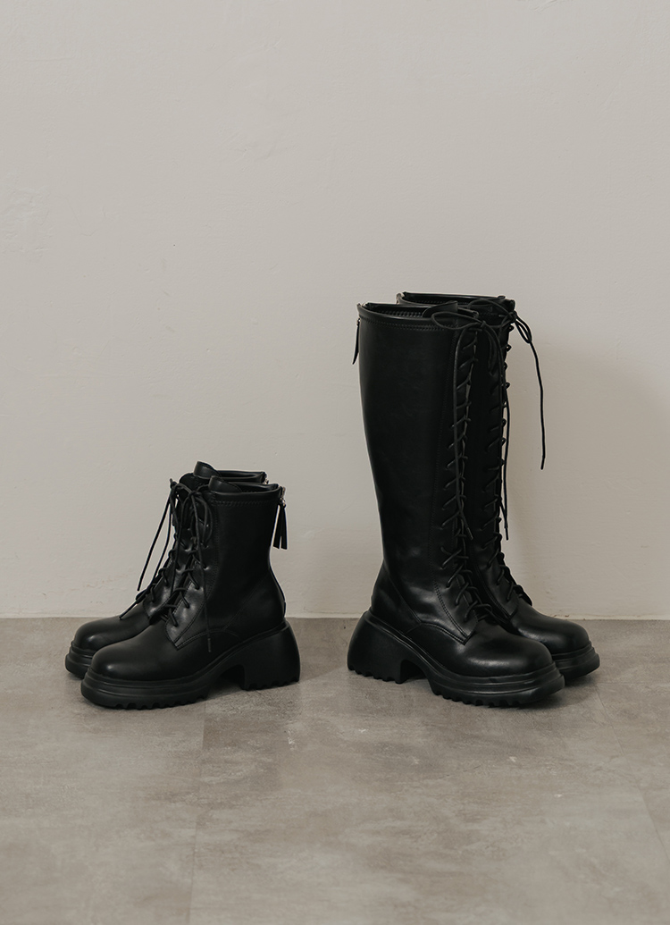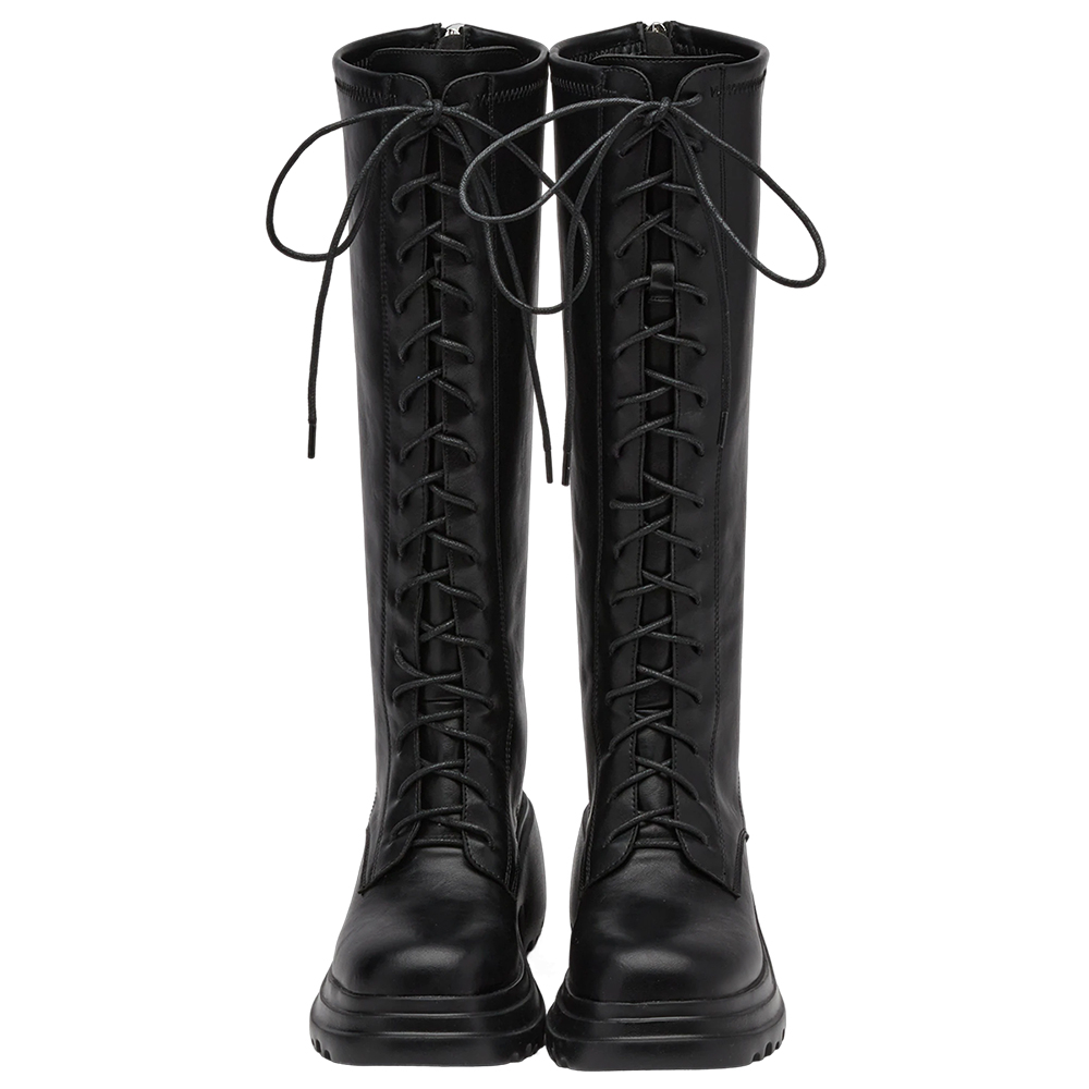 韓團必備圓頭輕量厚底綁帶長靴 黑