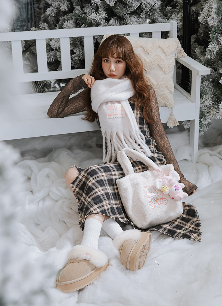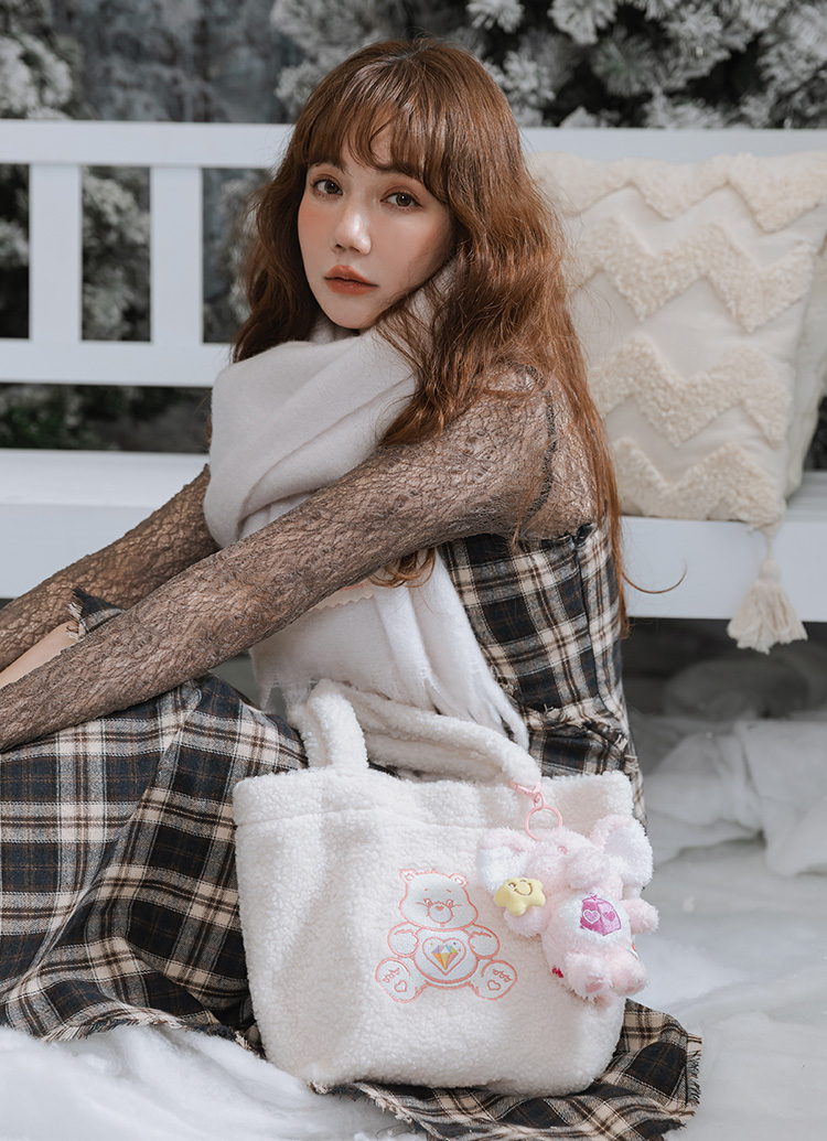 Care Bears-鑽石小熊泰迪毛毛手提肩背托特包 米白
