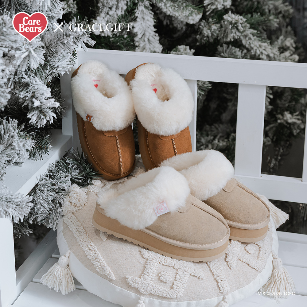 Care Bears-溫柔小熊牛麂皮羊毛厚底雪地拖鞋 棕