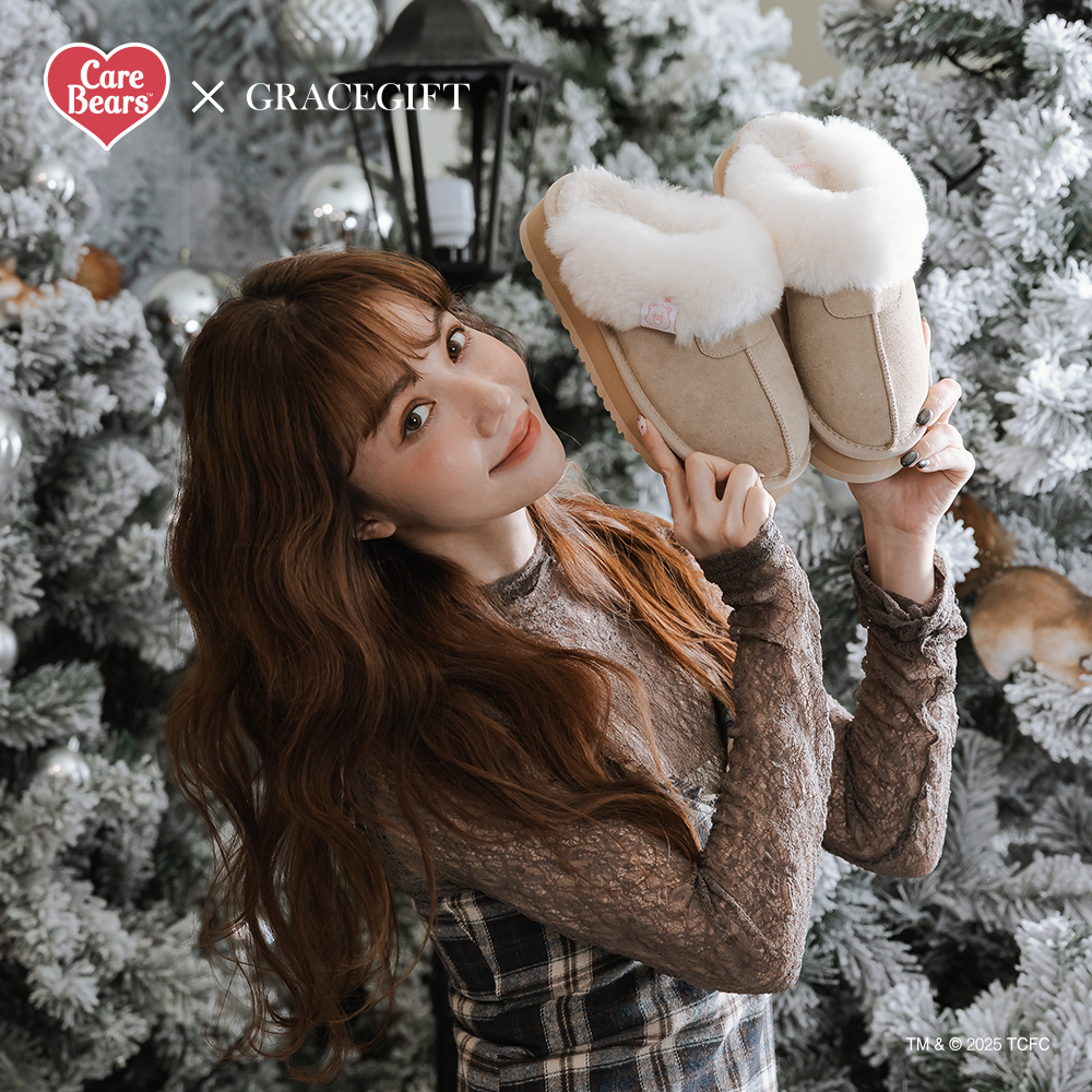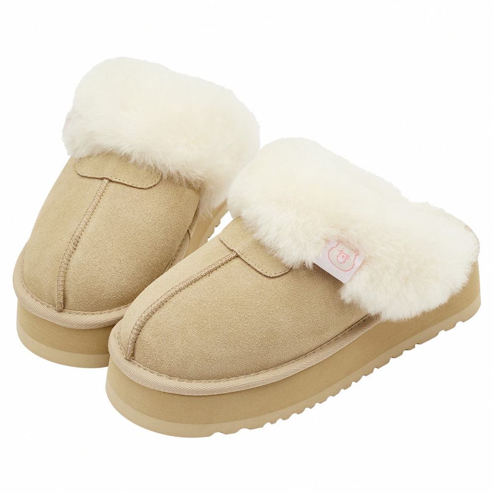 Care Bears-鑽石小熊牛麂皮羊毛厚底雪地拖鞋 杏