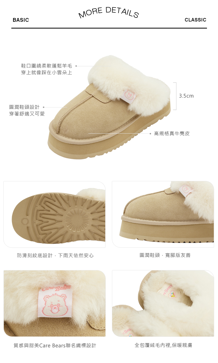 首頁 >女鞋 >跟鞋 >Care Bears-鑽石小熊牛麂皮羊毛厚底雪地拖鞋 杏
