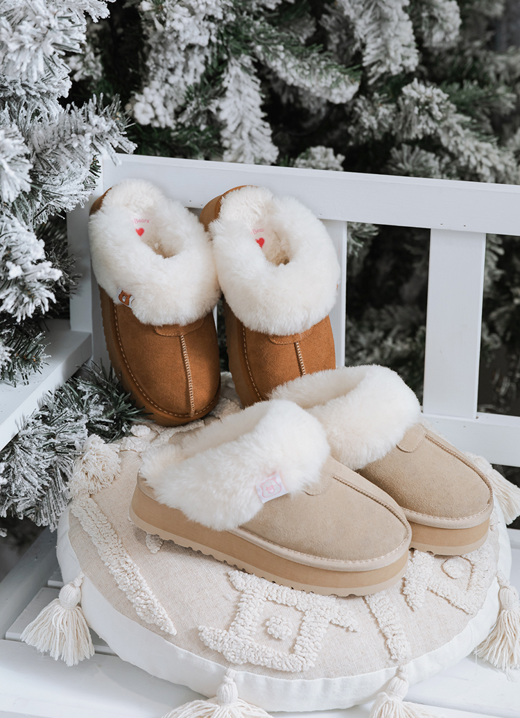 首頁 > 女鞋 > 跟鞋 >Care Bears-鑽石小熊牛麂皮羊毛厚底雪地拖鞋 杏
