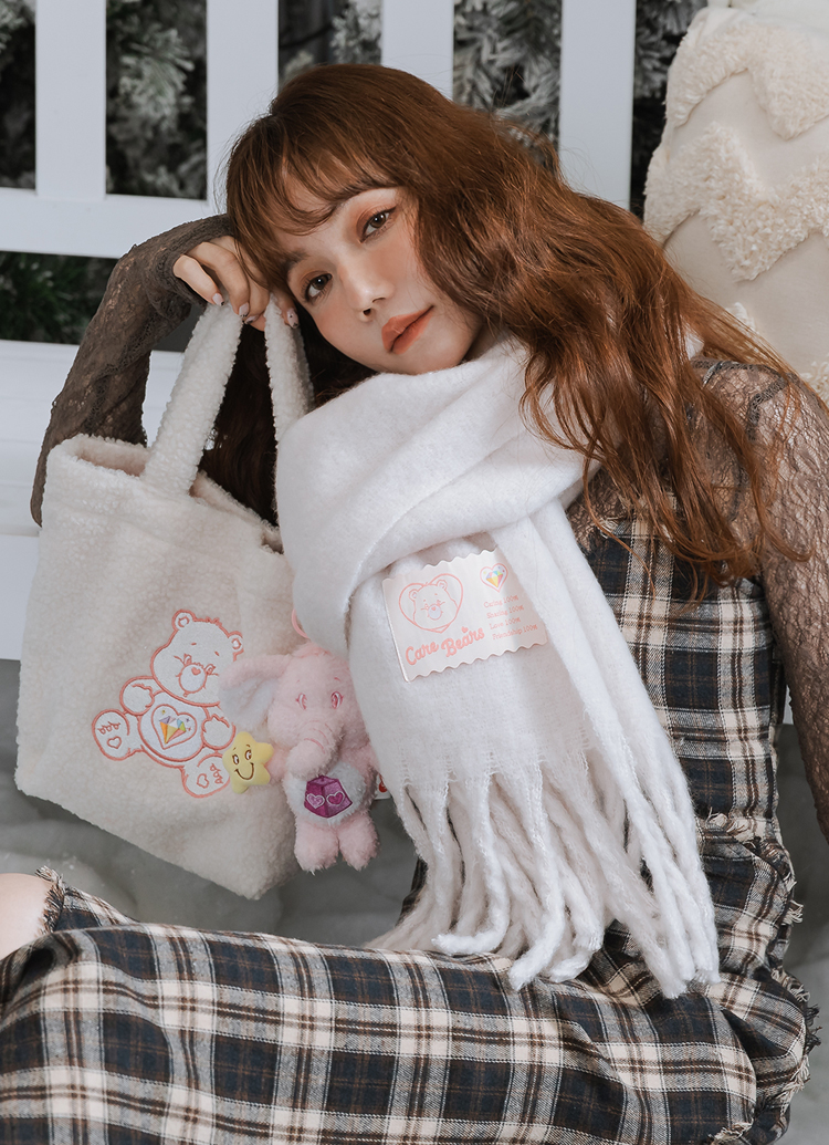 Care Bears-鑽石小熊純色流蘇仿羊絨圍巾 白