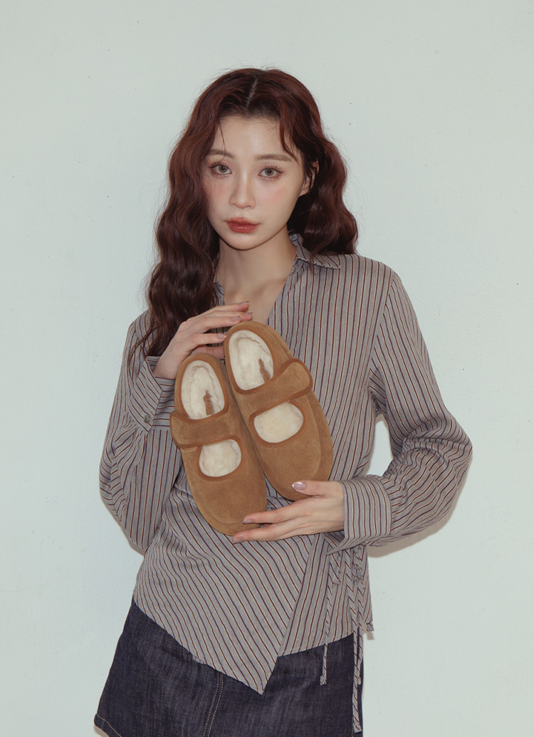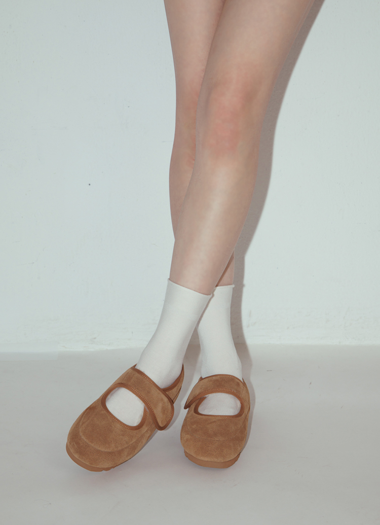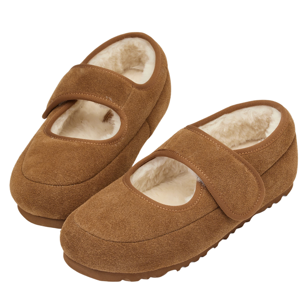 輕甜冬日真皮毛毛輕量瑪莉珍平底鞋 棕
