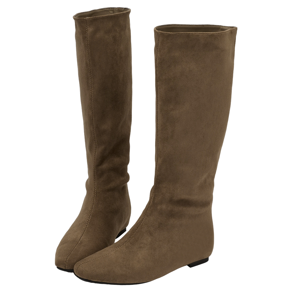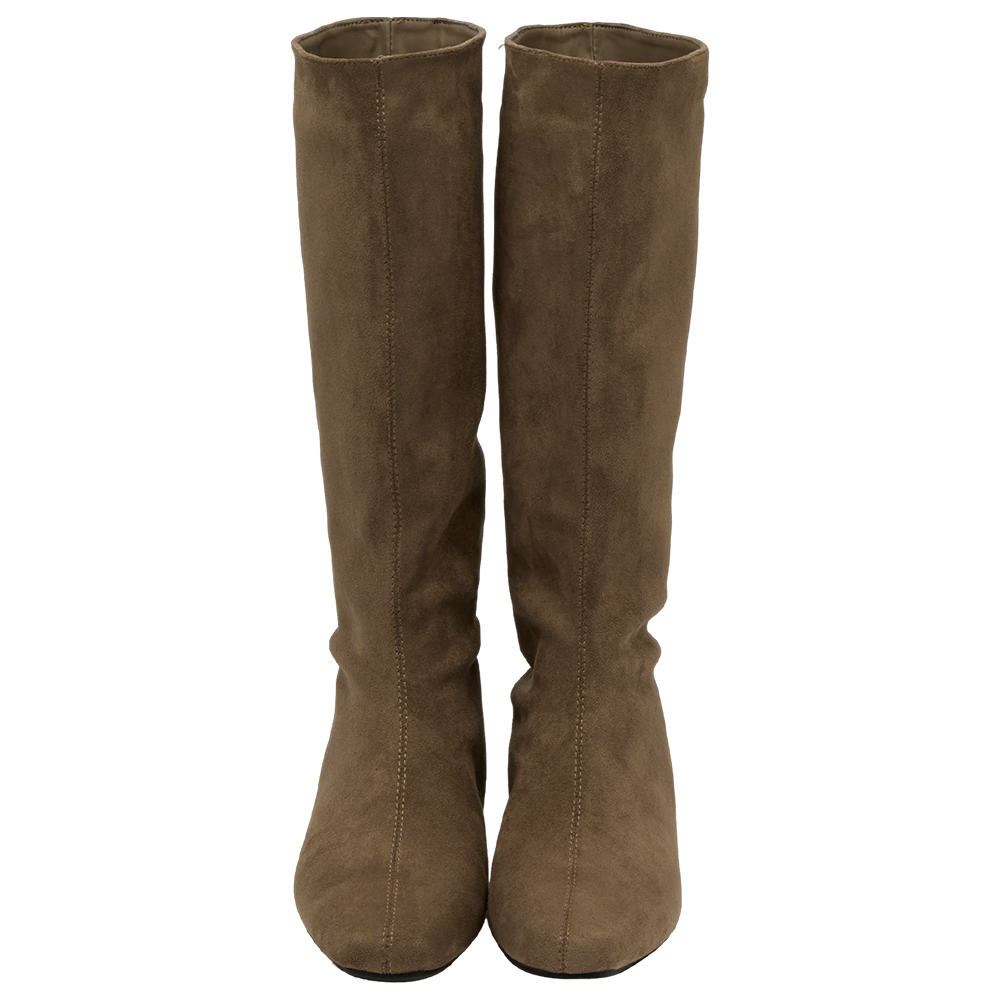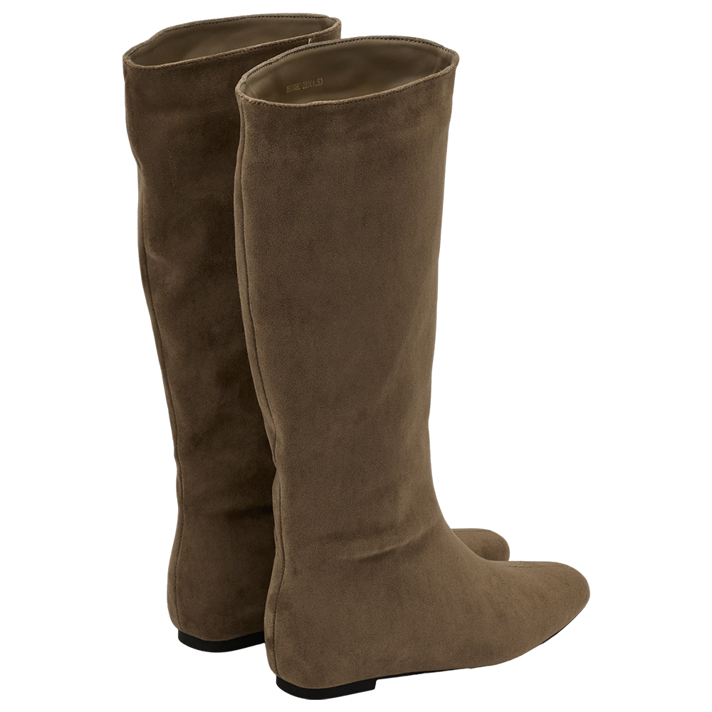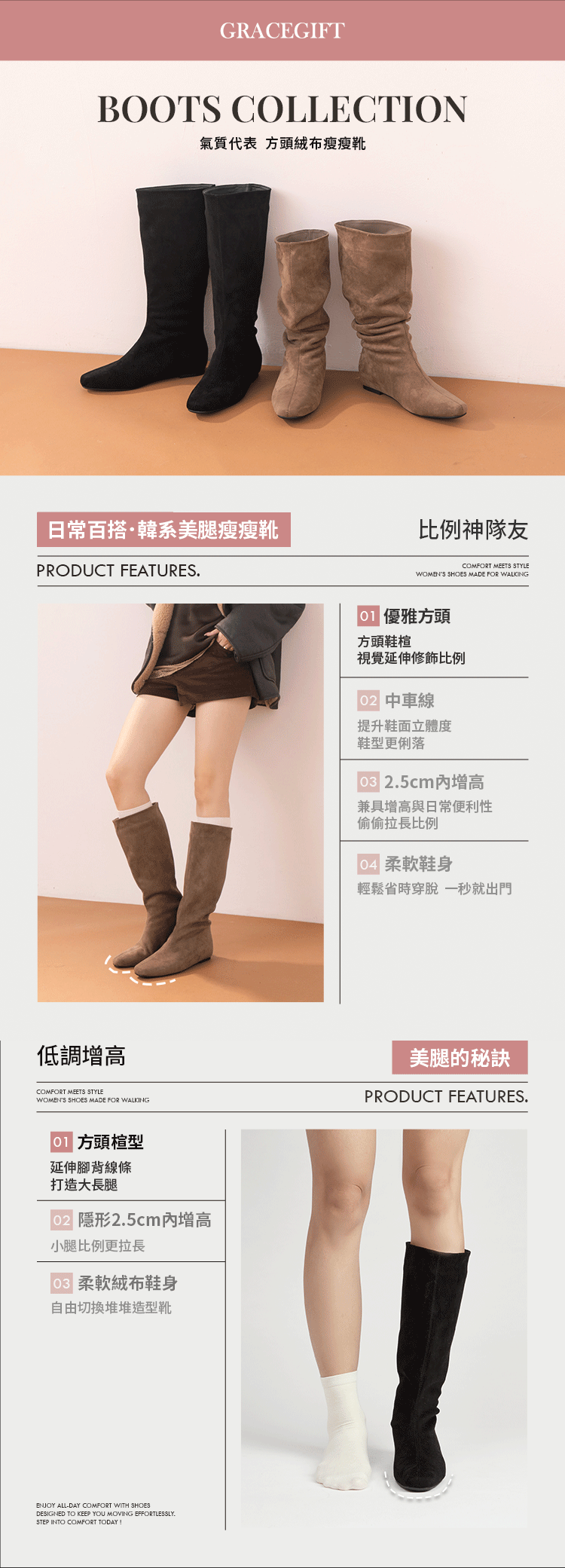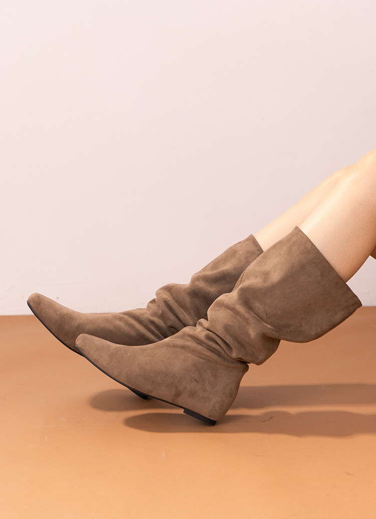 柔感美腿方頭絨布內增高堆堆長靴 淺駝