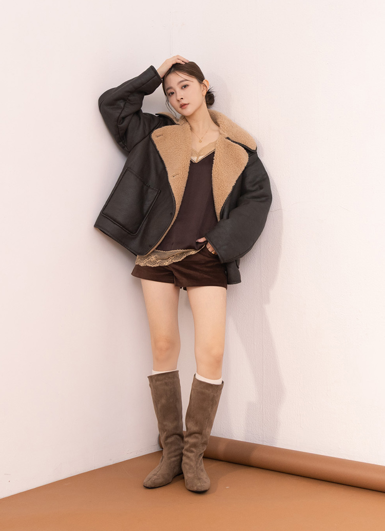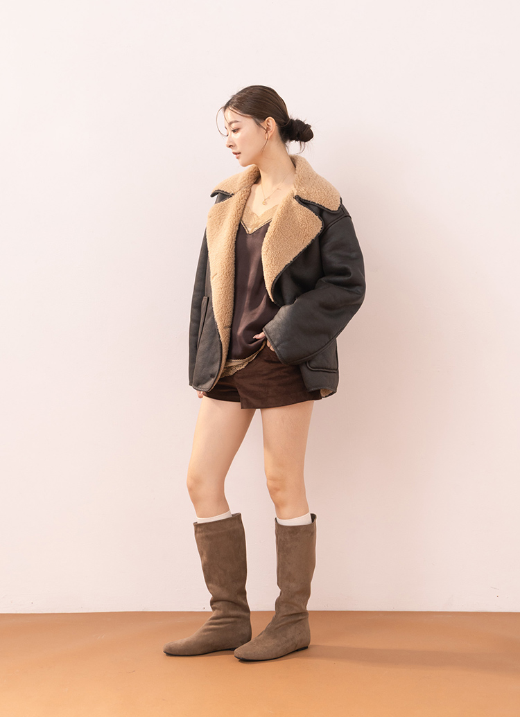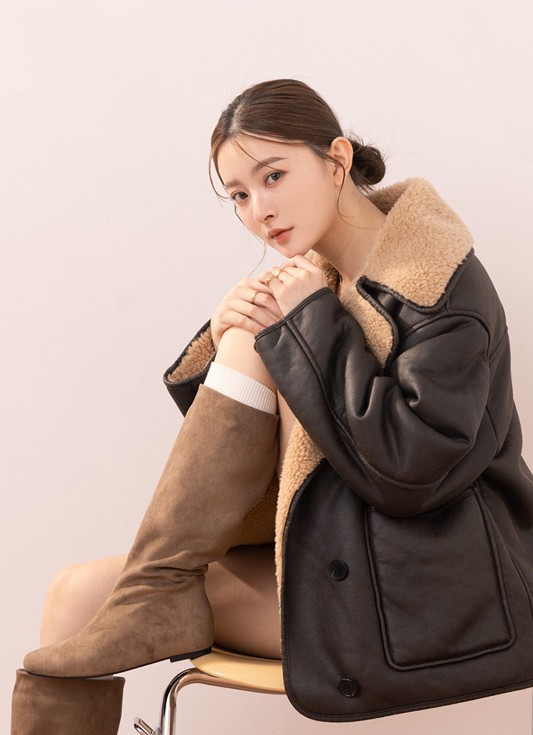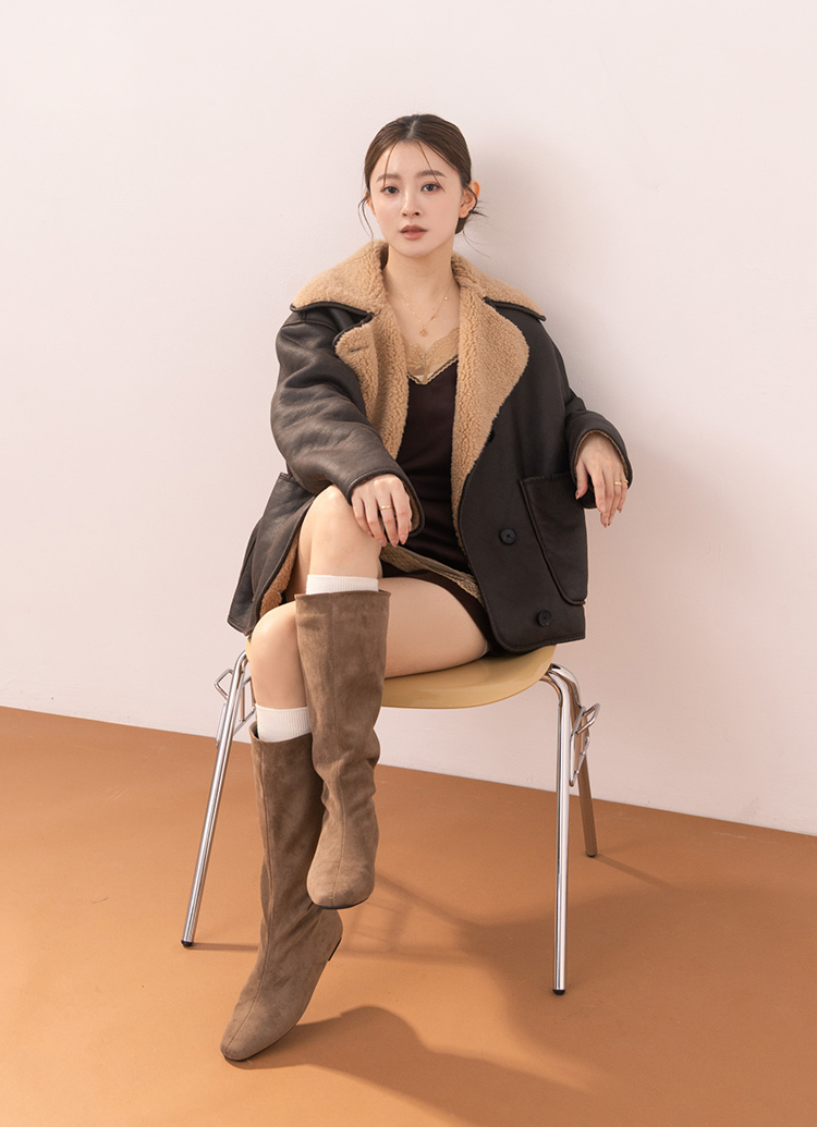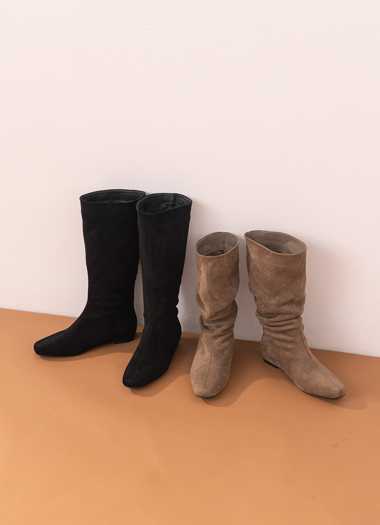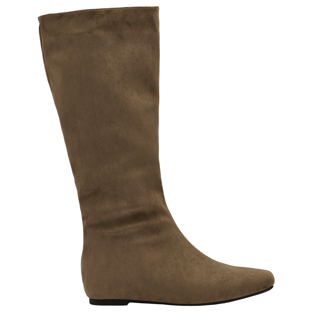 柔感美腿方頭絨布內增高堆堆長靴 淺駝