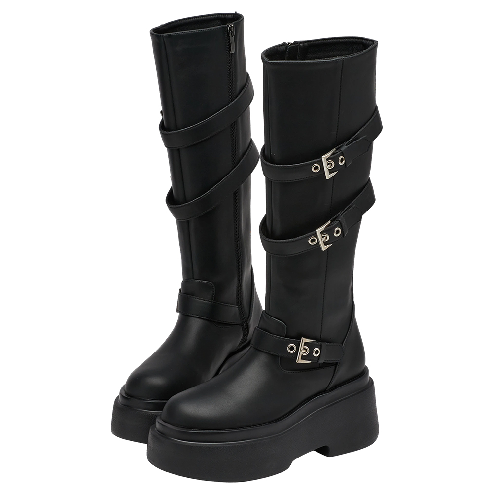 悅悅聯名-紐約街頭刷色扣環輕量厚底長靴 黑