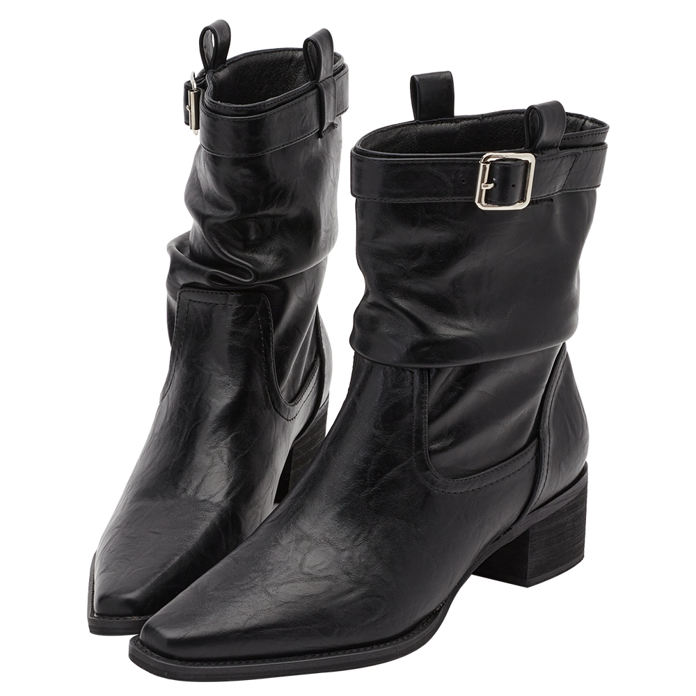 悅悅聯名-都會格調尖頭皮革2way堆堆低跟西部靴 黑