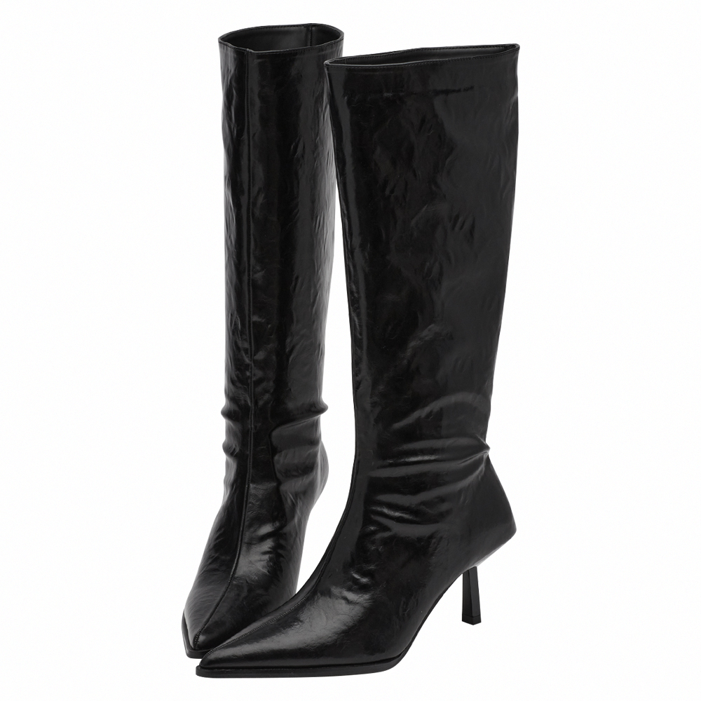 悅悅聯名-高級冷感漆皮尖頭細跟及膝長靴 黑